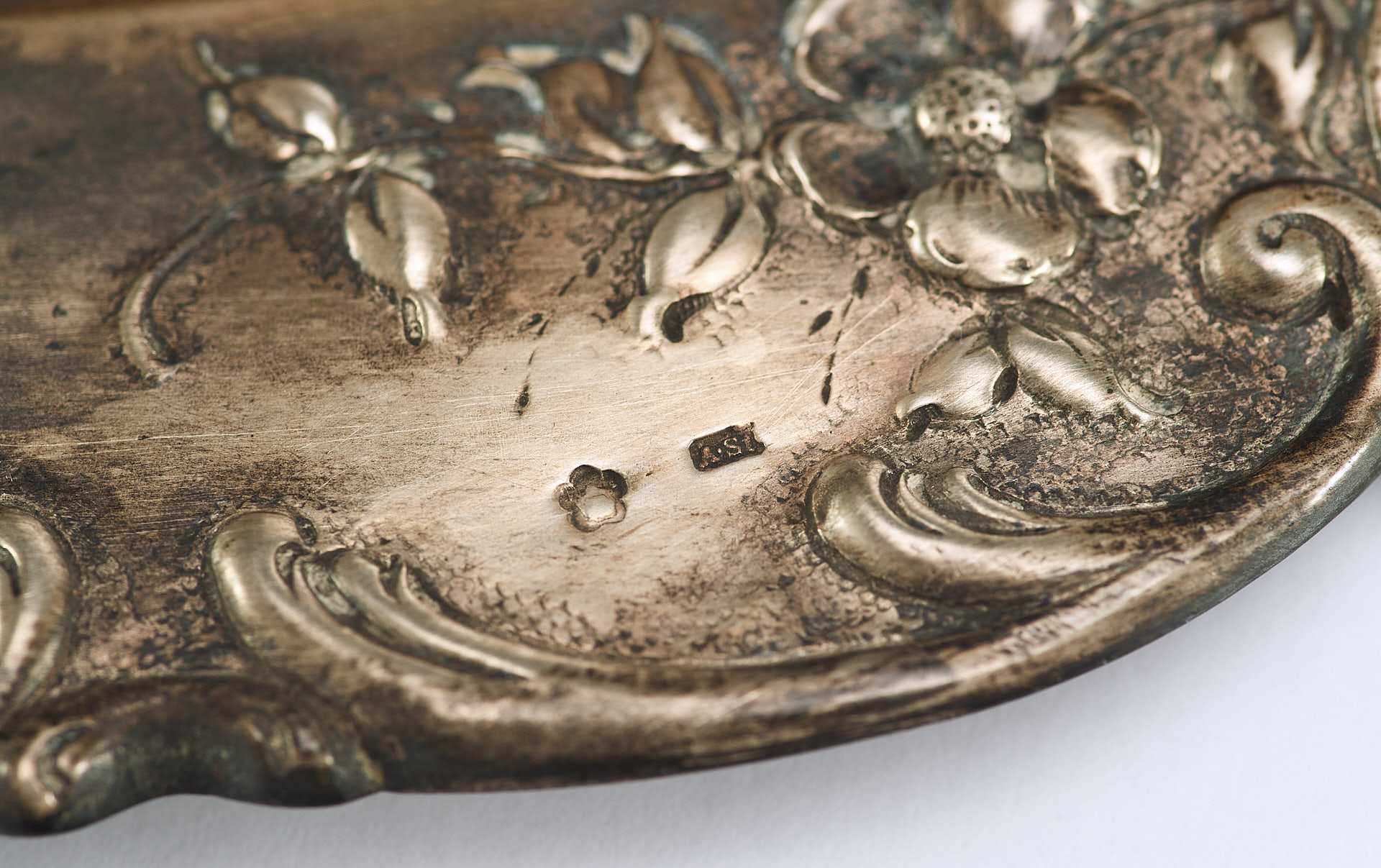 обращена вправо, с пробирными обозначениями 3, А - клеймо для изделий из серебра 800 пробы, принятое в Австрии с 1872 по 1922 гг. Буква «А» указывает на то, что изделие изготовлено в Вене.