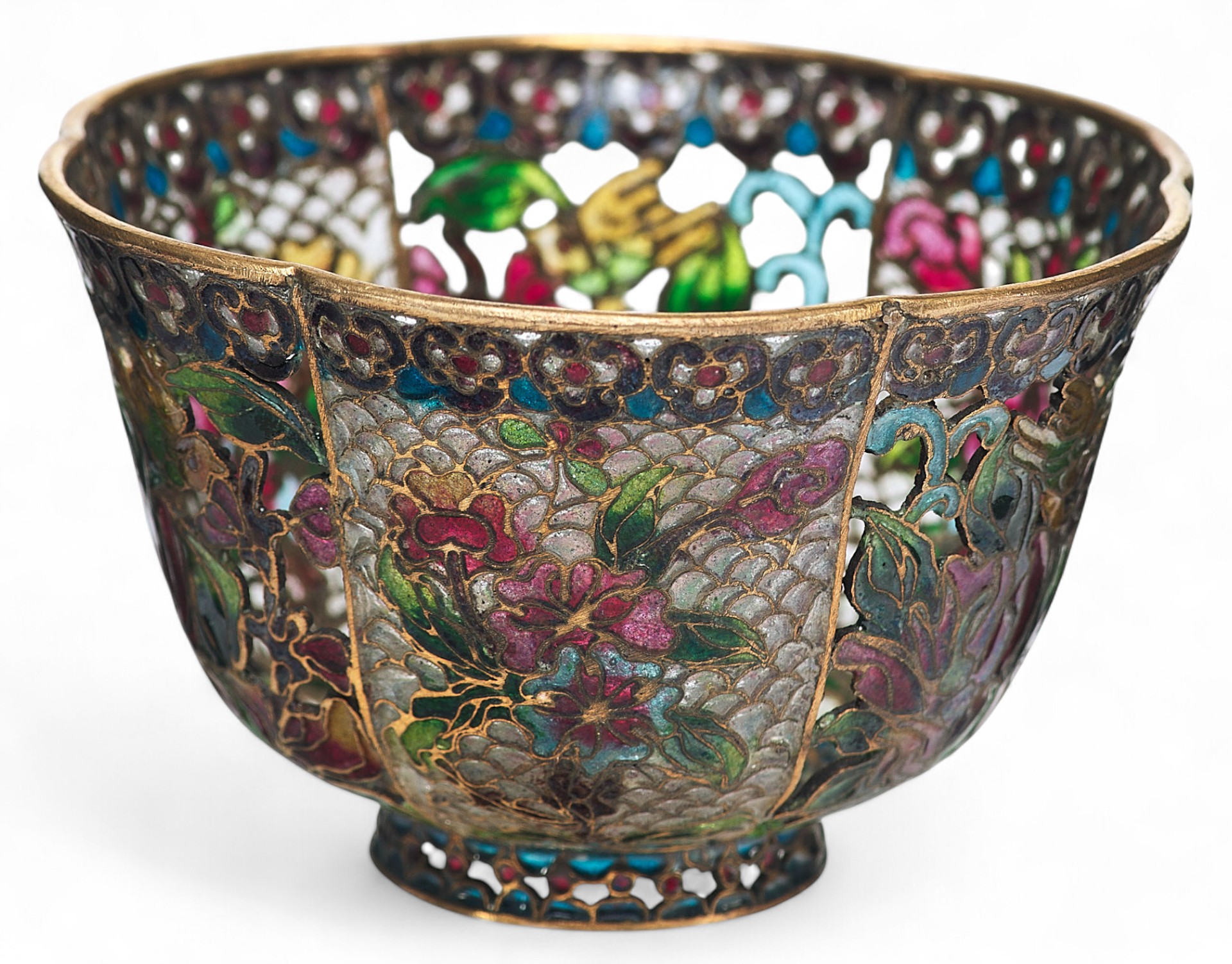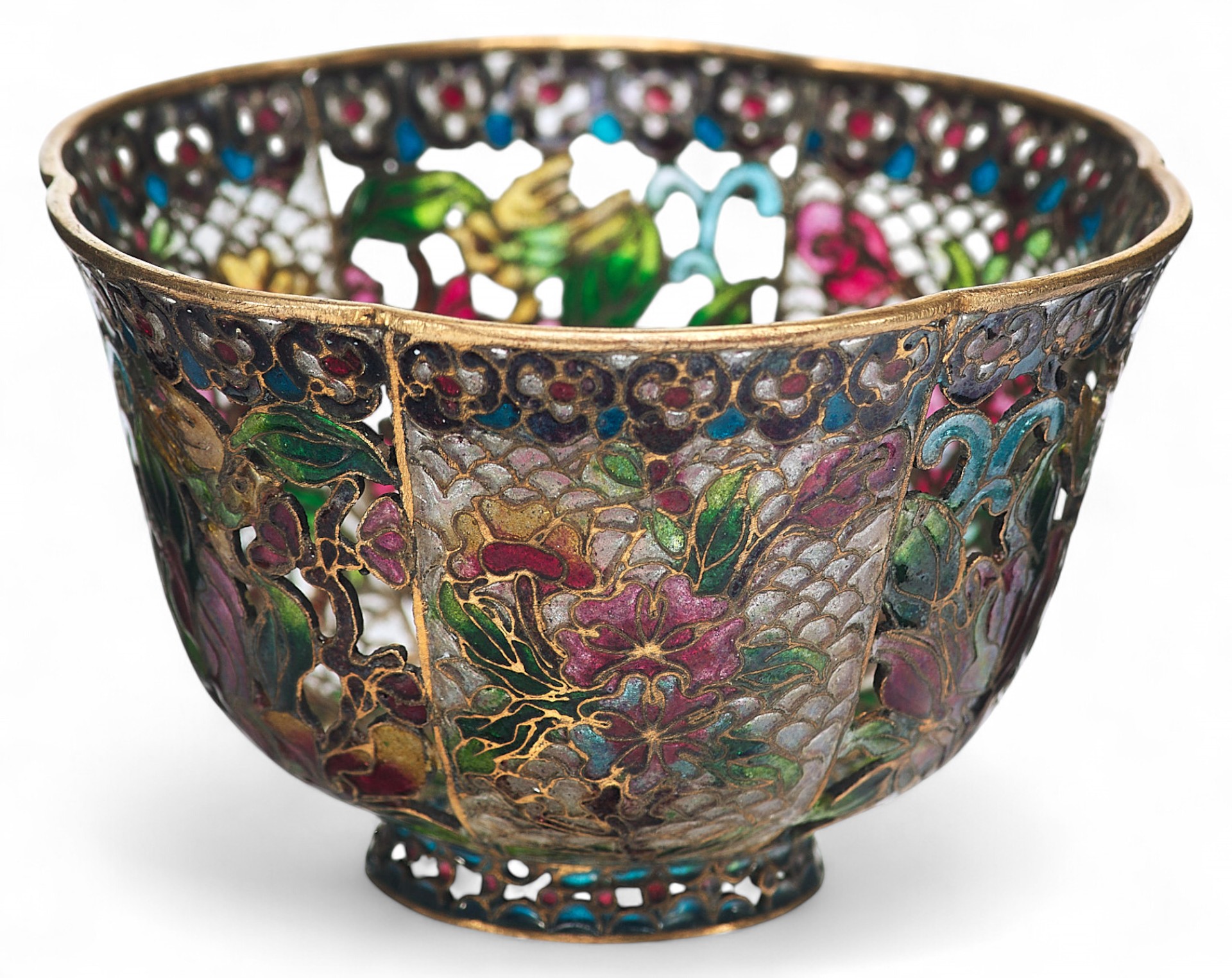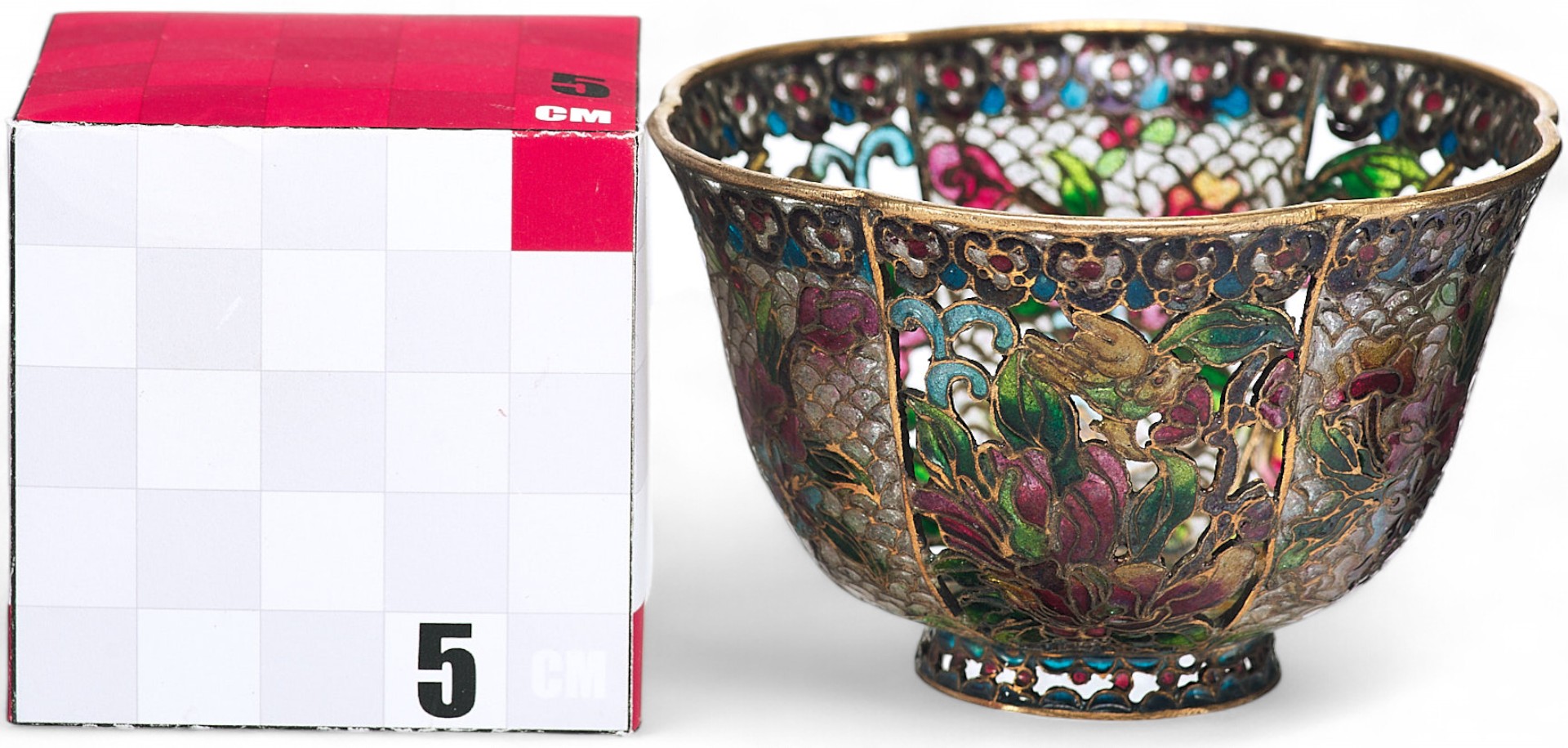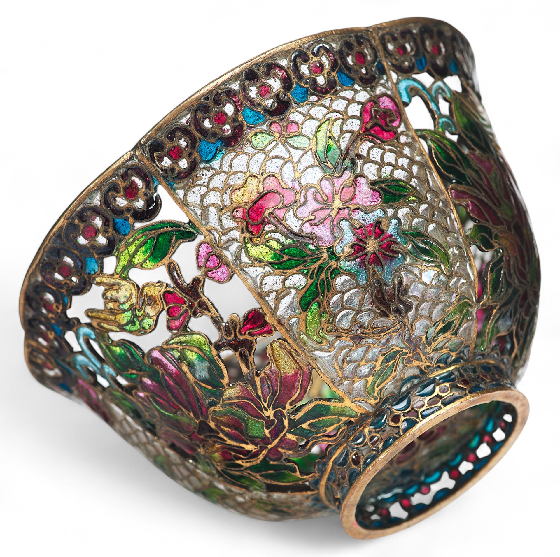 Тулово конусовидное с гофрированными стенками. Декорировано цветочным и растительным орнаментом в технике витражного стекла (оконной эмали). Основание круглое. На протяжении всего ХІХ века русские фабрики и заводы старались раскрыть секреты витражного искусства, неизвестного ранее в России. Существовавший тогда спрос на “картины на