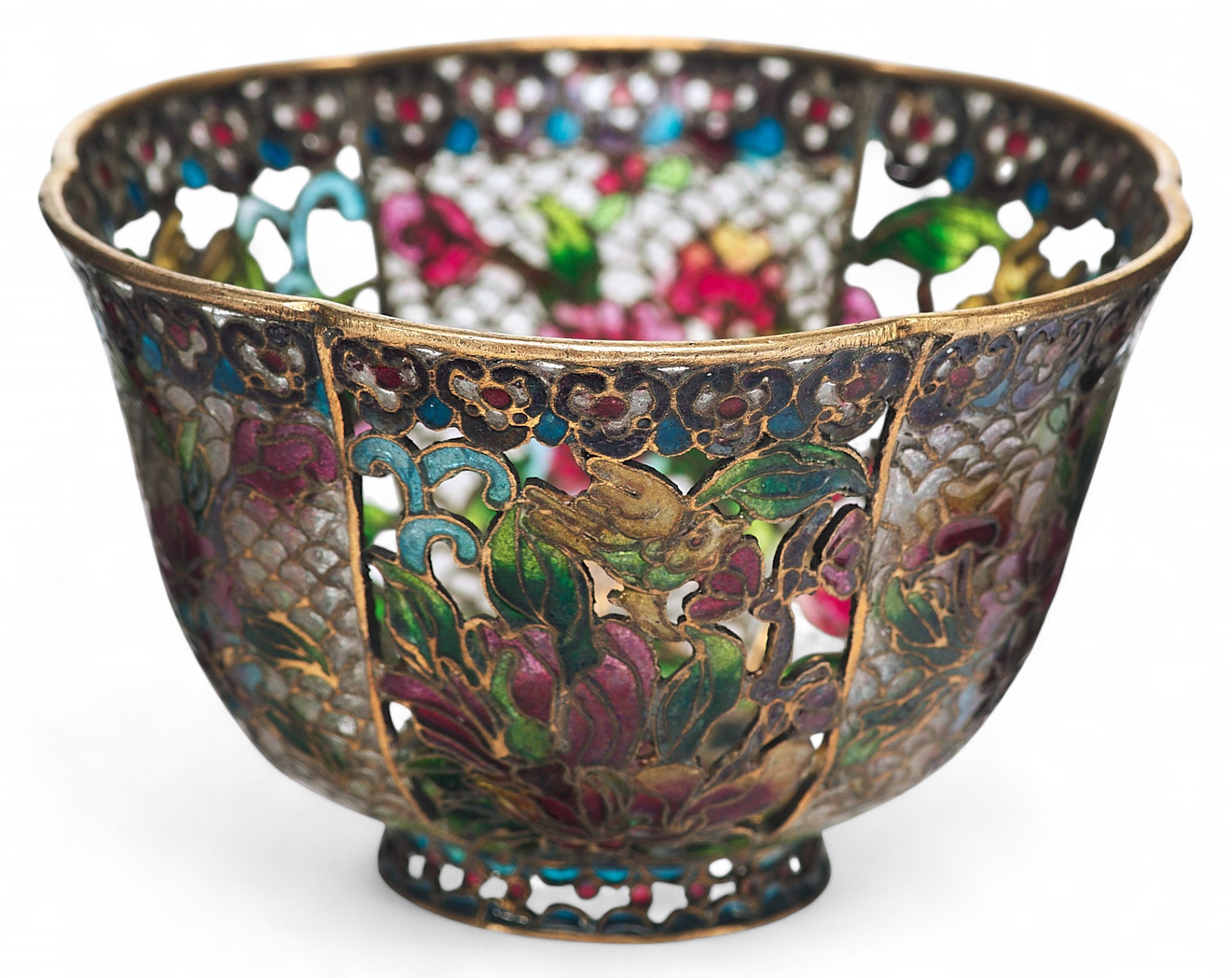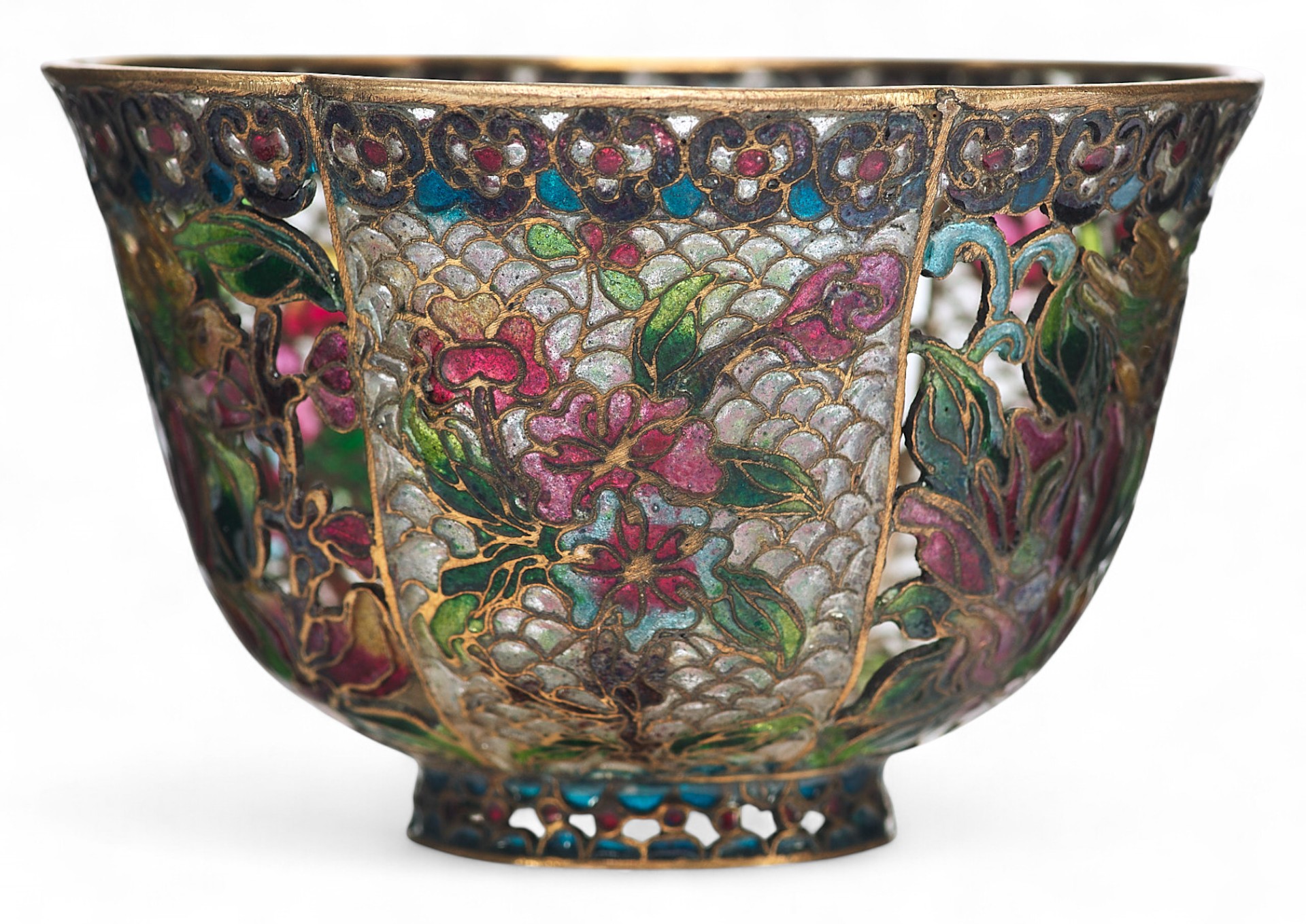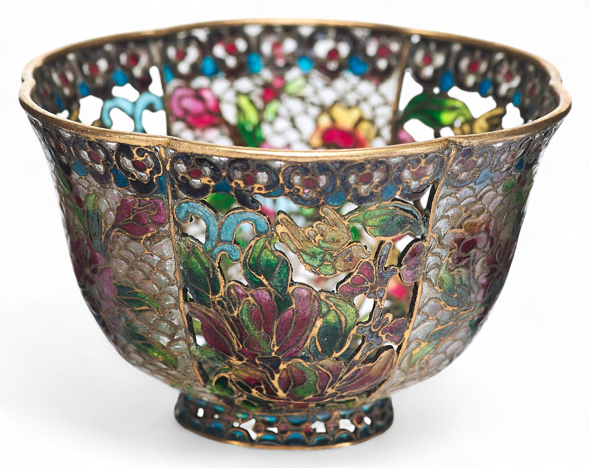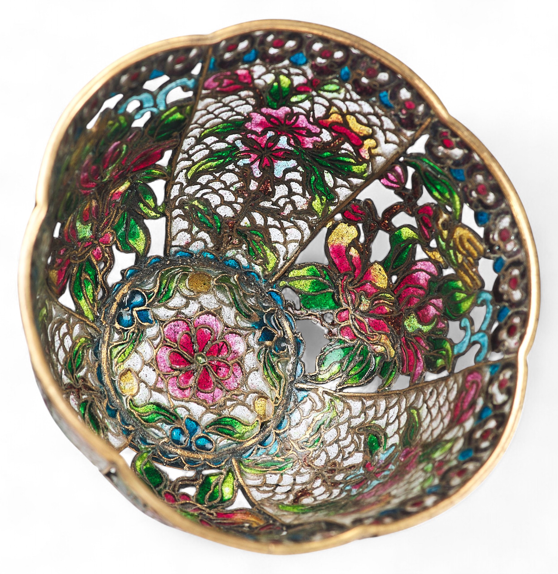 Тулово конусовидное с гофрированными стенками. Декорировано цветочным и растительным орнаментом в технике витражного стекла (оконной эмали). Основание круглое. На протяжении всего ХІХ века русские фабрики и заводы старались раскрыть секреты витражного искусства, неизвестного ранее в России. Существовавший тогда спрос на “картины на