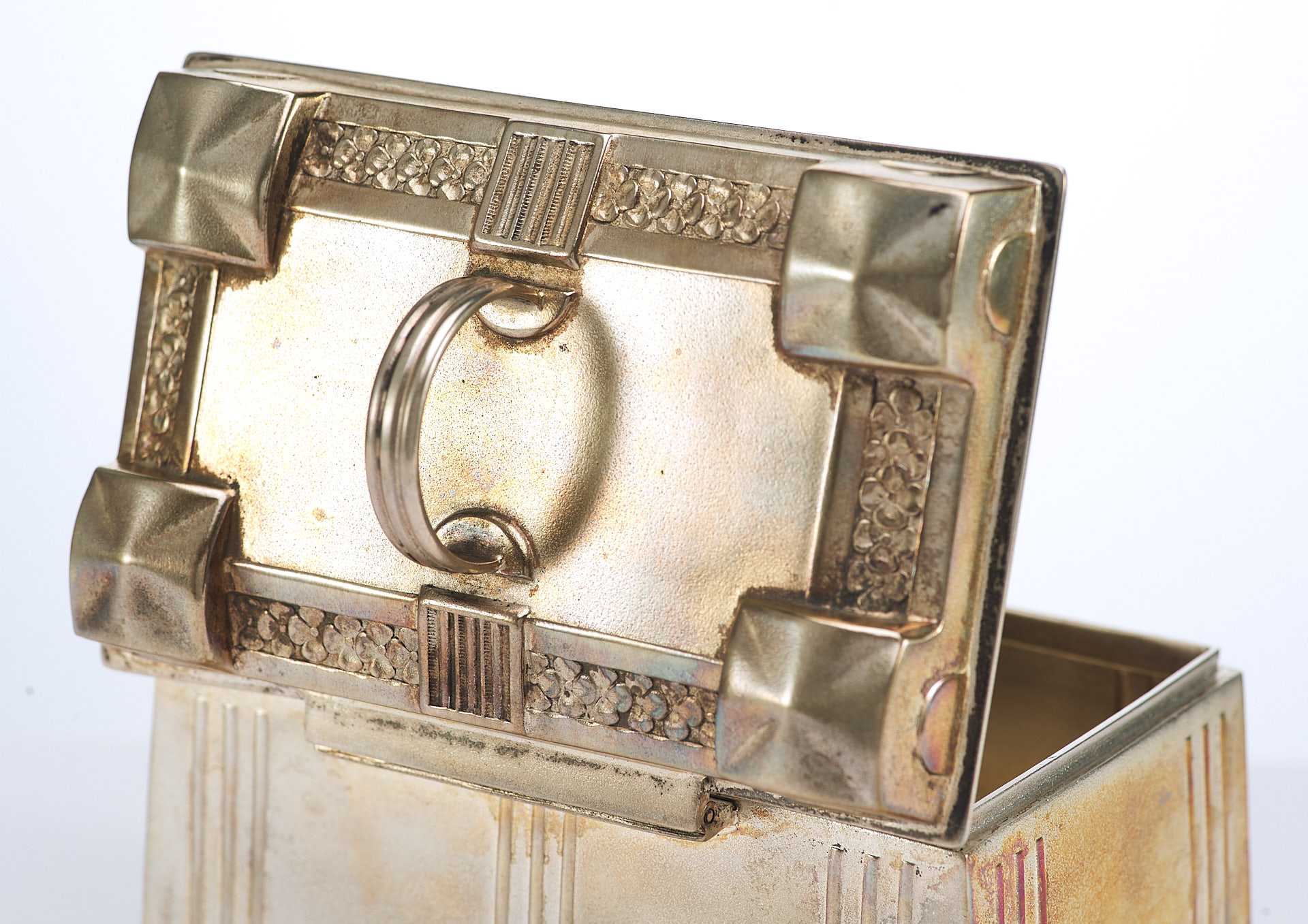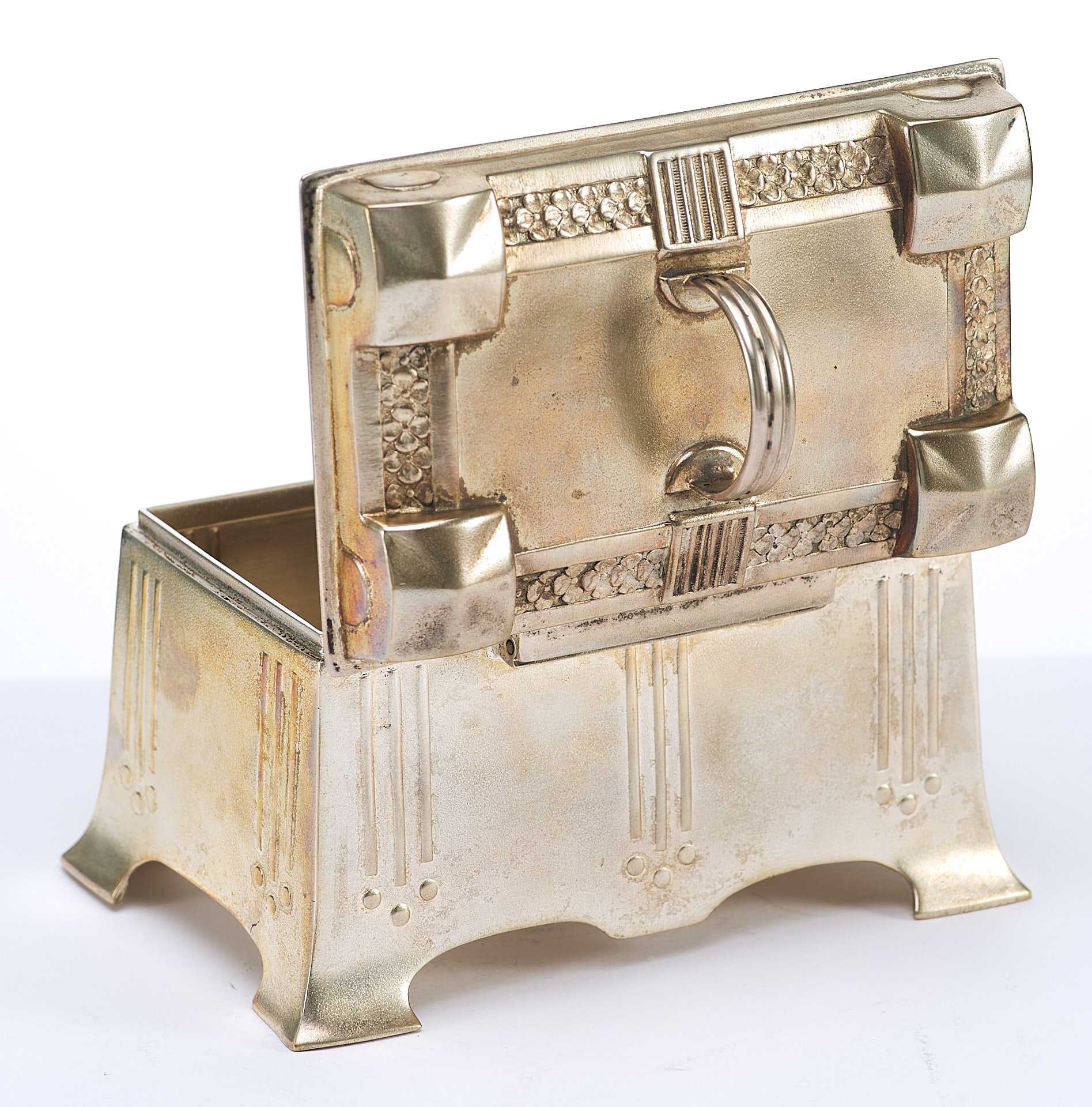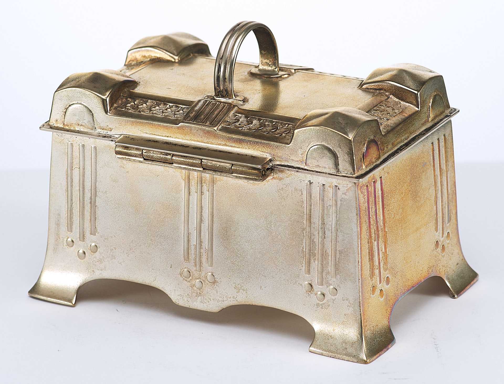 Представлена шкатулка, дизайн которой явно указывает на стилевые приемы искусства модерна, вероятнее всего немецкого югендстиля, активно проявившегося в дизайне металлических предметов бытового назначения.