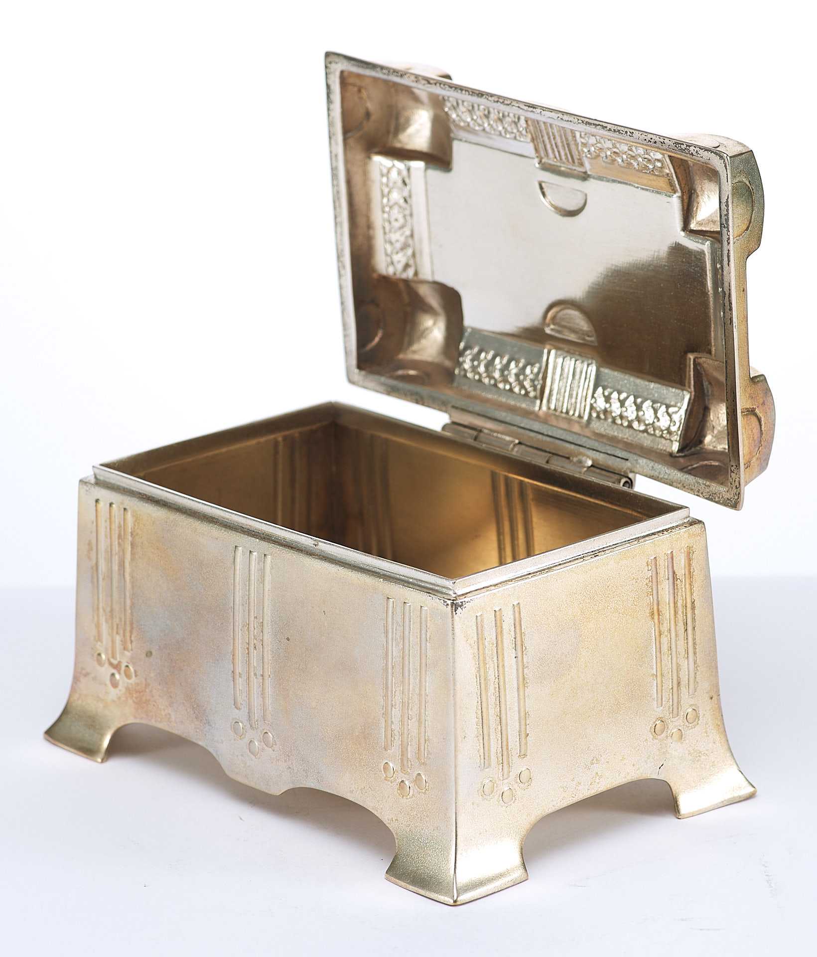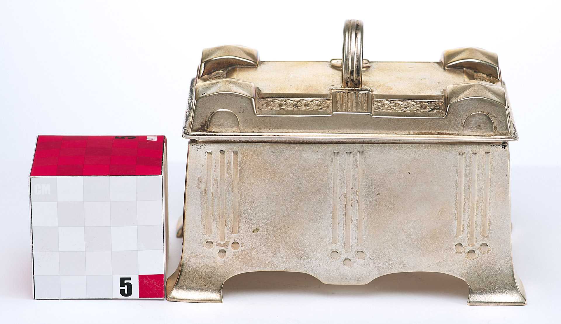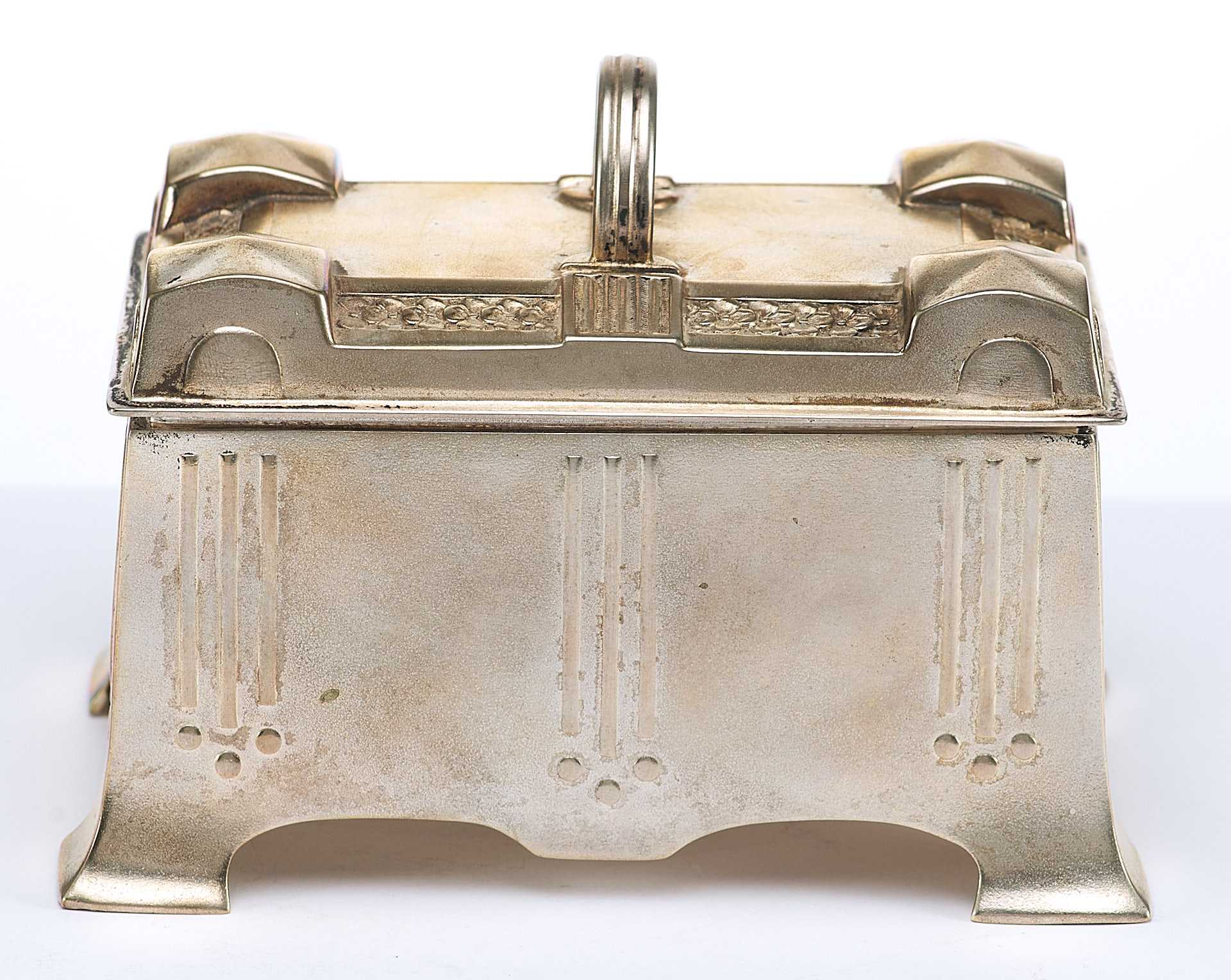 Представлена шкатулка, дизайн которой явно указывает на стилевые приемы искусства модерна, вероятнее всего немецкого югендстиля, активно проявившегося в дизайне металлических предметов бытового назначения.