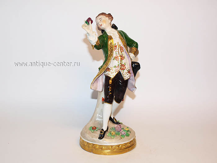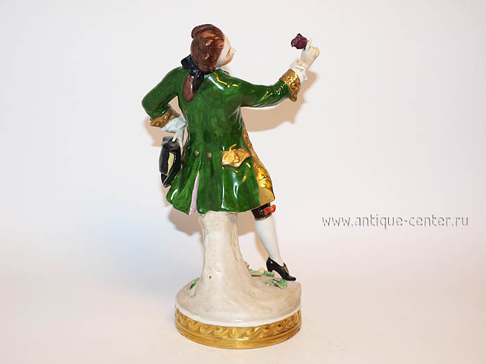 Скульптурная композиция выполнена в галантном жанре. Галантные сцены изображали идеально-красивых людей в обстановке абсолютного счастья и гармонии. Представленный Кавалер позирует, любуясь на прекрасный цветок в своей руке. Его костюм – красочен и наряден, кожа – белоснежна, поза – изысканна и аристократична.