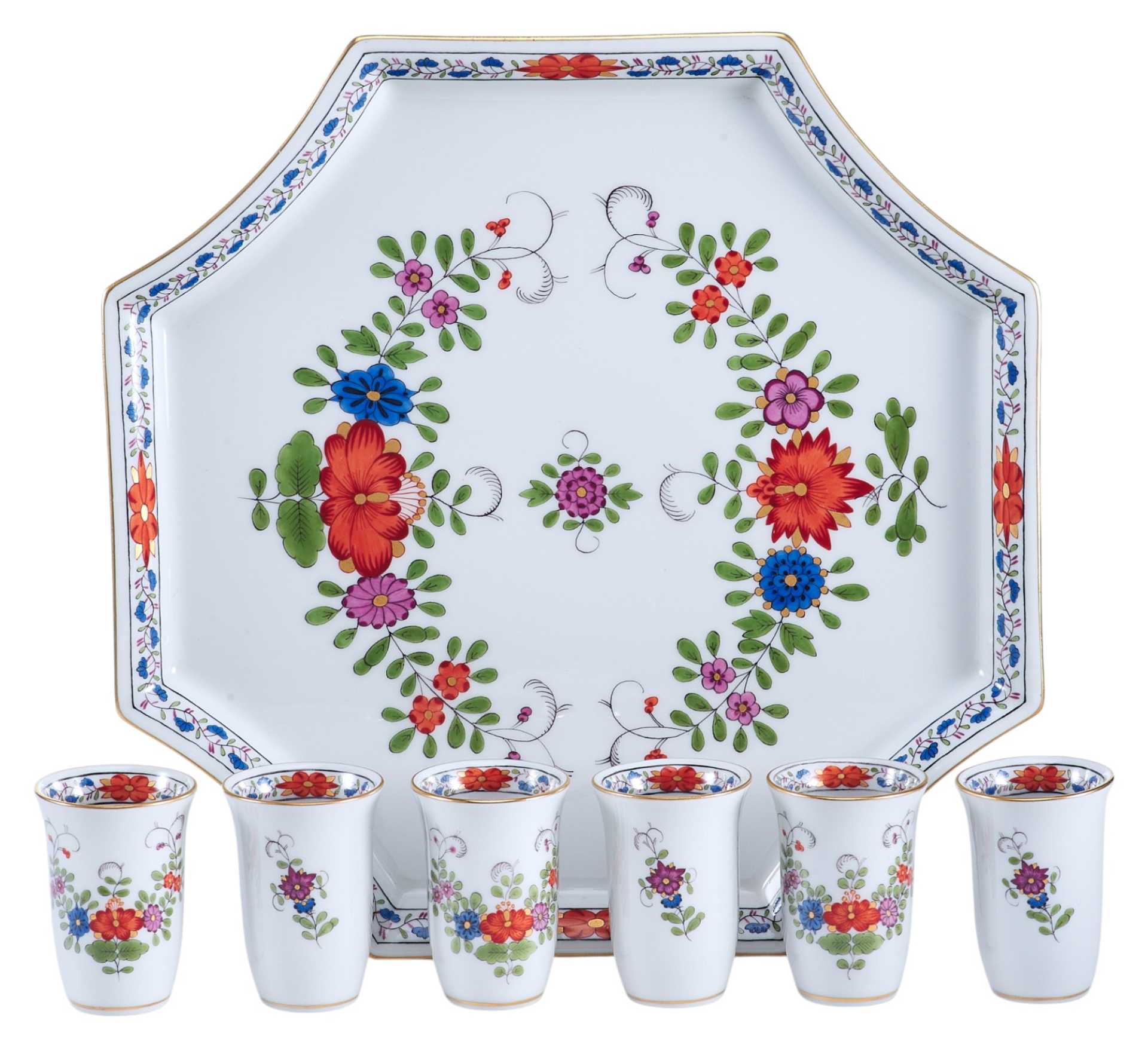 Этот антикварный набор для ликёра, изготовленный в 1960–1970-х годах на Мейсенской фарфоровой мануфактуре (Meissen, Германия), является классическим образцом высокохудожественного европейского фарфора. В состав набора входят графин, шесть стопок и поднос, украшенные ручной росписью и золочением.