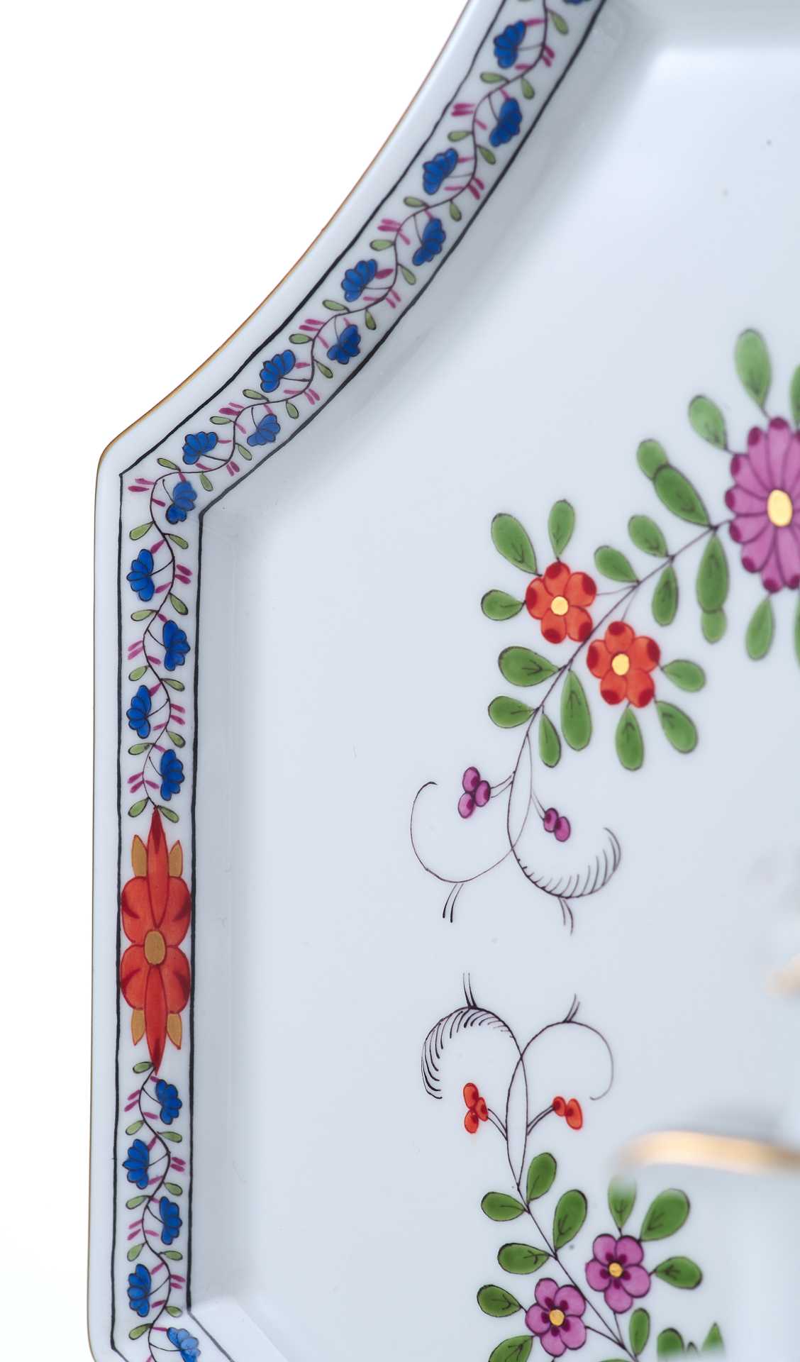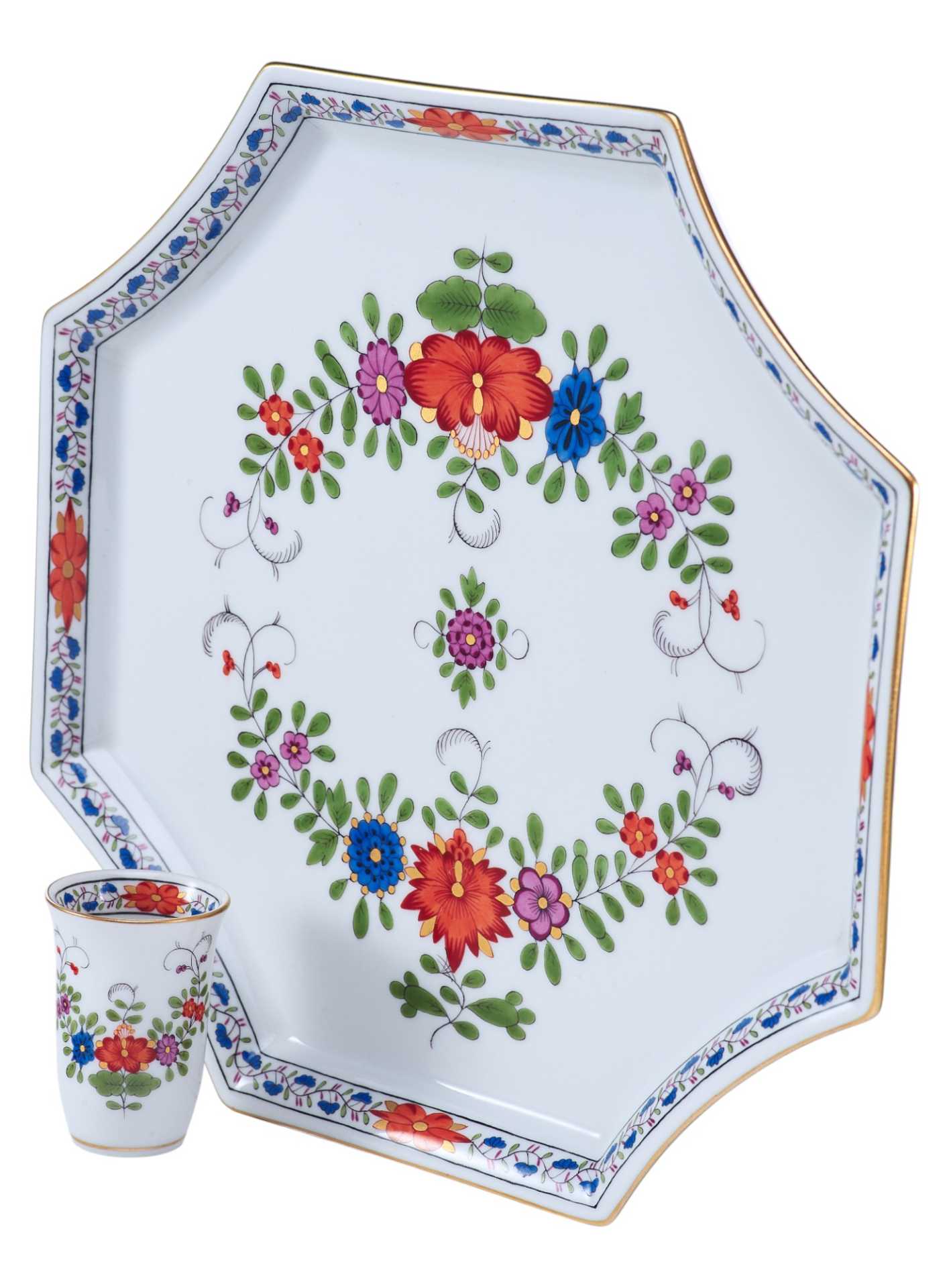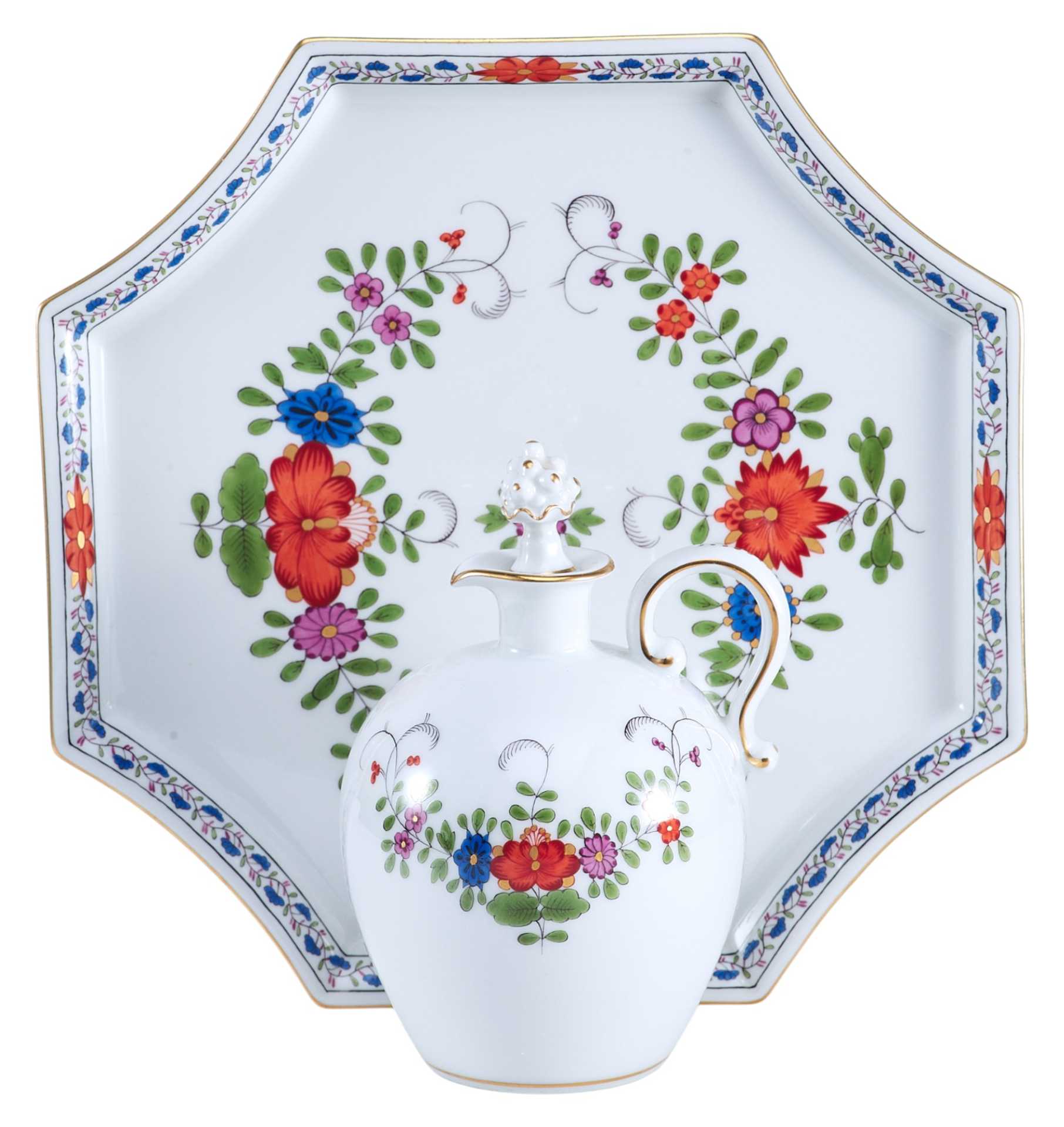 Декор набора выполнен в стиле шинуазри (chinoiserie) — популярного направления XVIII века, вдохновлённого китайскими мотивами. Он напоминает работы знаменитого мейсенского художника Иоганна Георга Хёрольда (Johann Georg Höroldt; 1696–1775), который в 1720–1733 годах обогатил палитру фарфоровой росписи и ввёл в неё огненно-красный, изумрудный, фиолетовый и жёлтый цвета. Цветочные композиции на данном наборе соответствуют традиционному восточному стилю, популярному в Мейсене на протяжении нескольких столетий.
