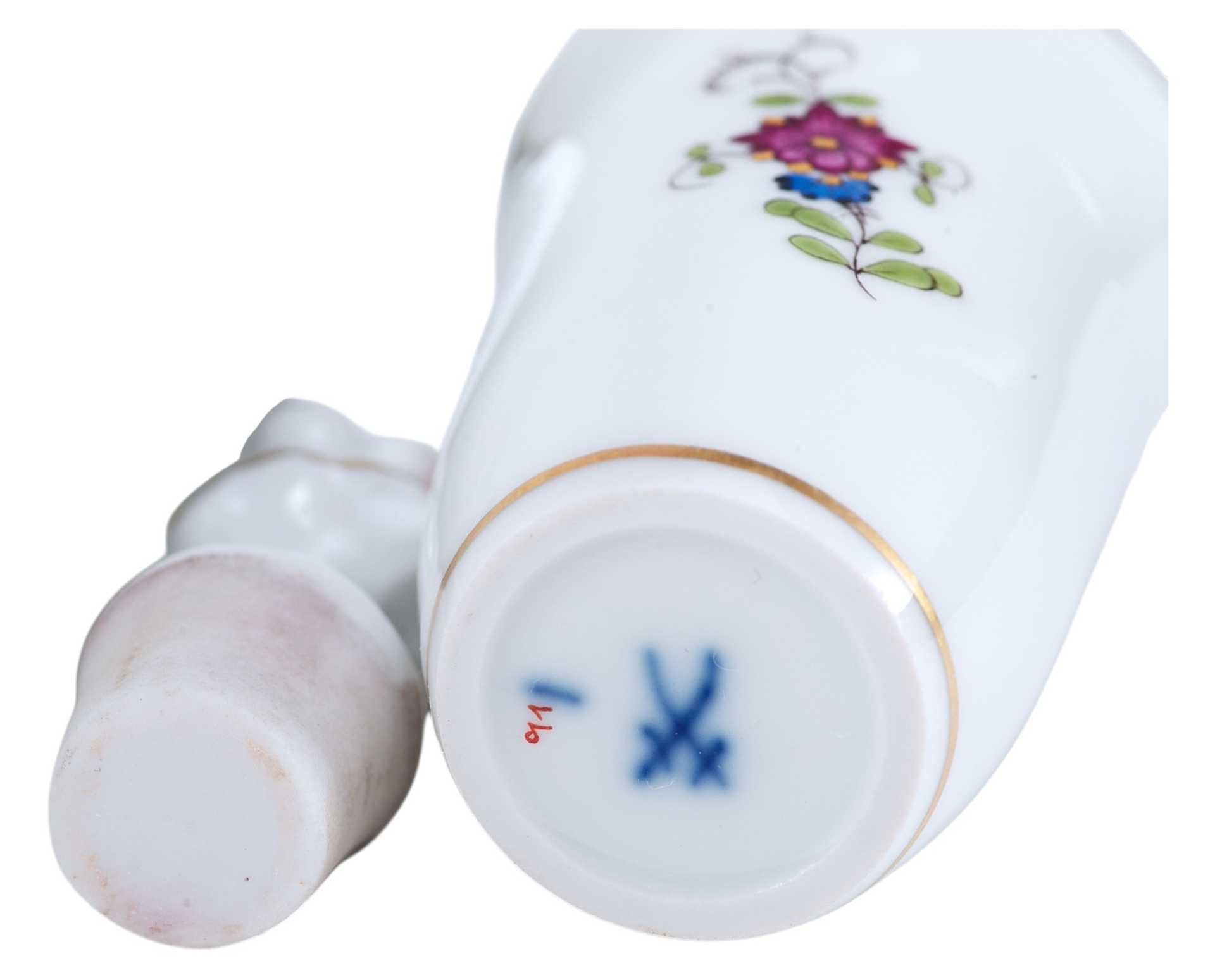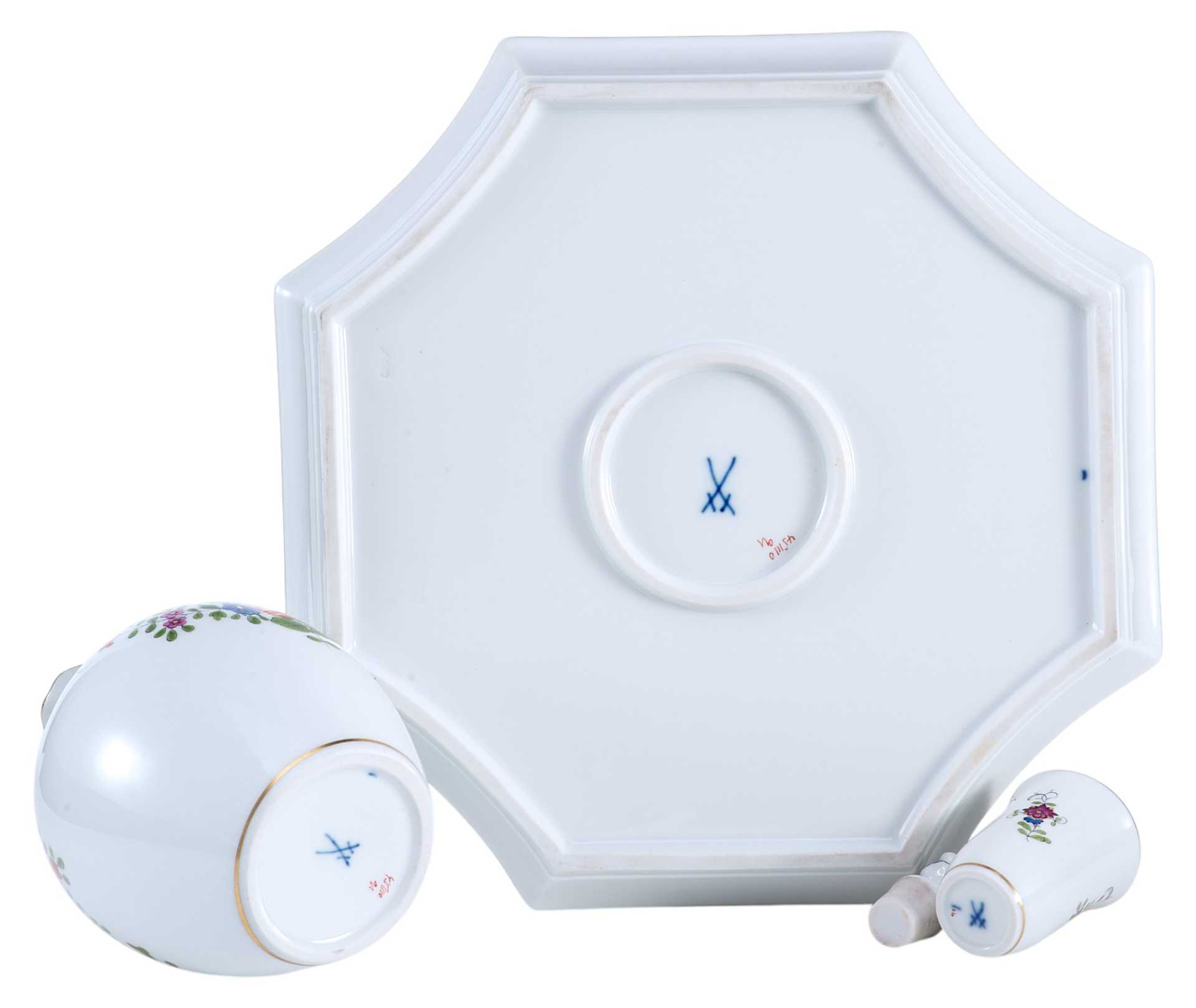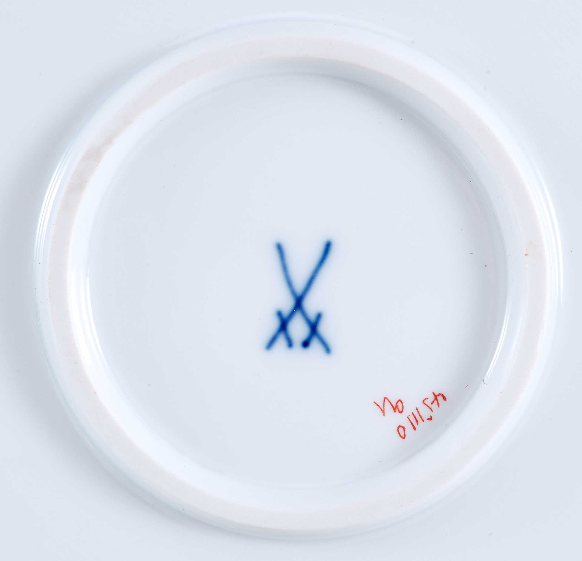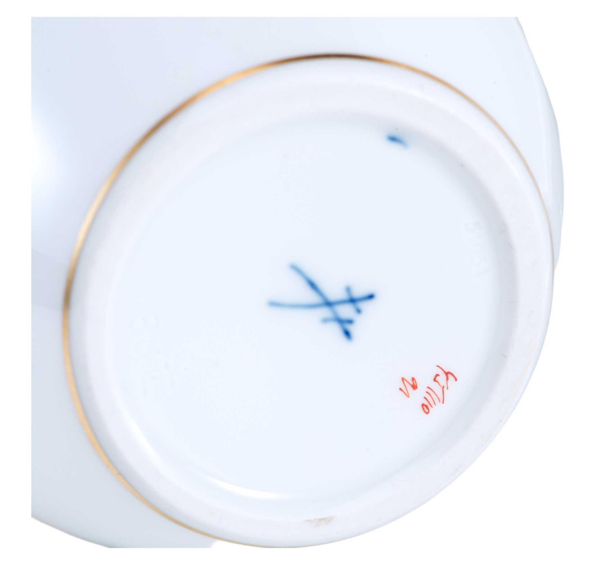 На донцах предметов набора стоит клеймо Мейсенской фарфоровой мануфактуры, относящееся к периоду после 1948 года, что подтверждает подлинность изделия. Данный вид сервизов был широко представлен в ассортименте фабрики в середине XX века и существовал в различных вариациях росписи.