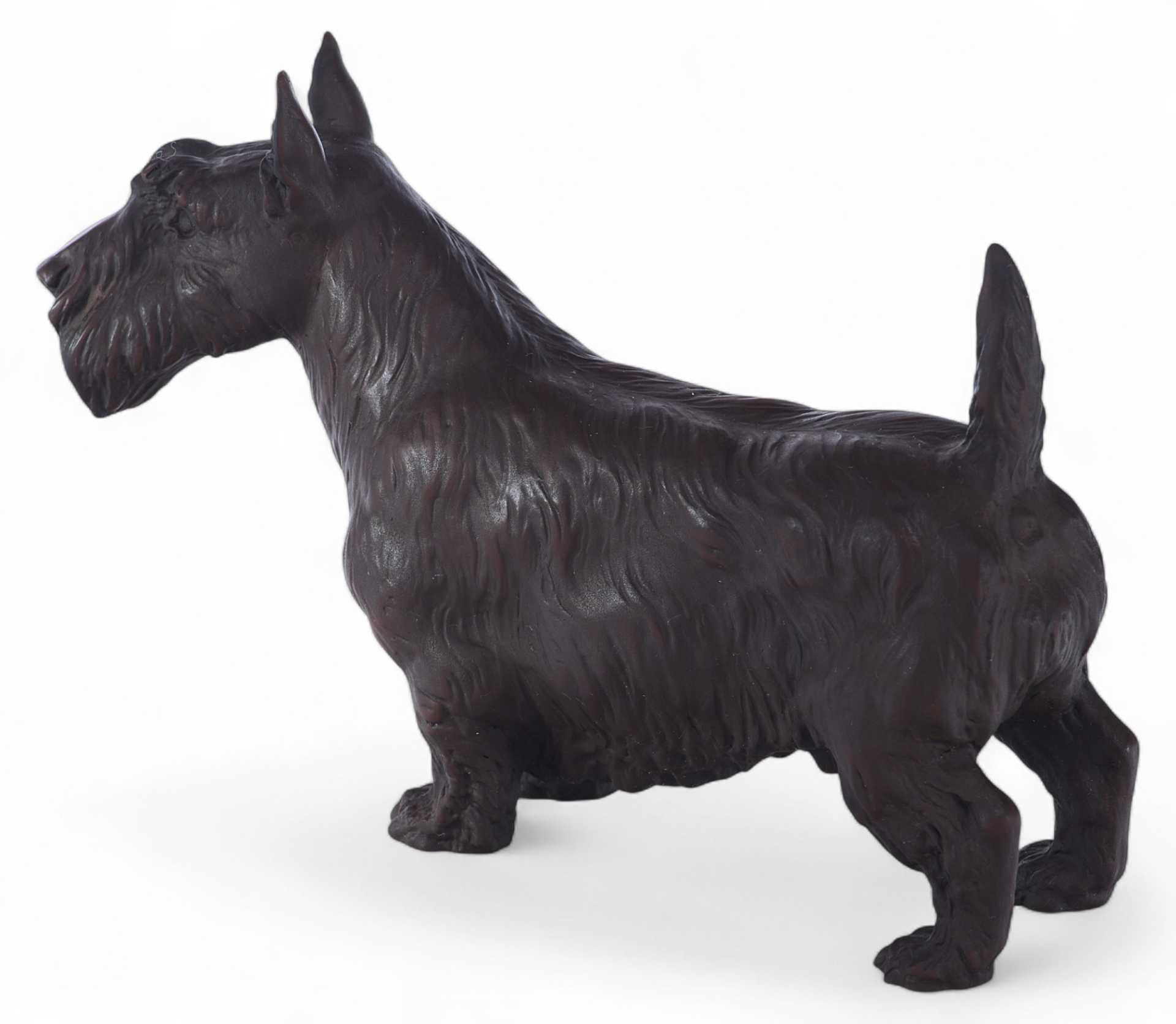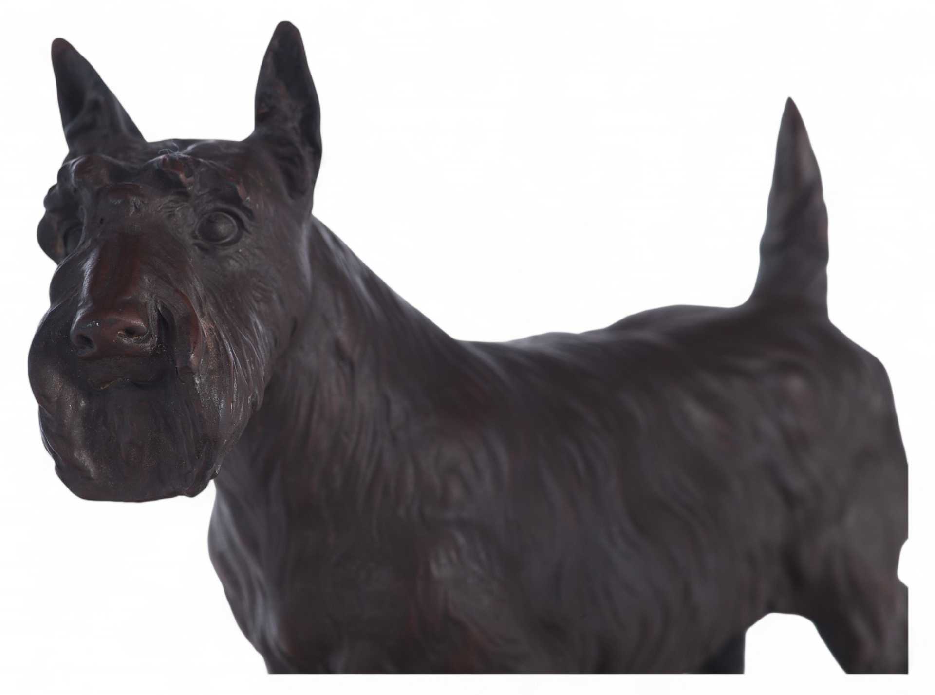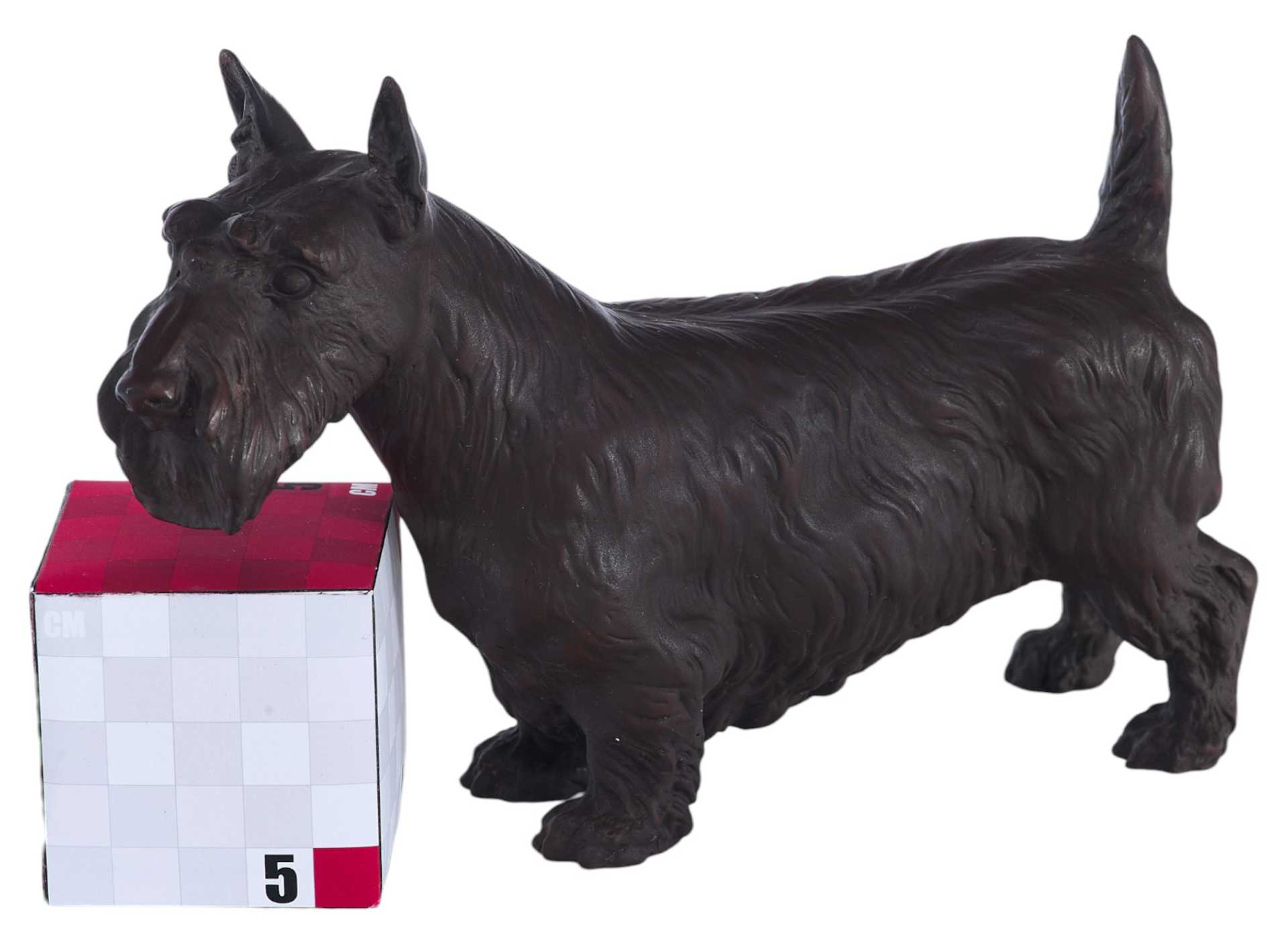 Статуэтка представляет собой фигурку собаки породы «скотч-терьер». Великолепно передана фактура шерсти животного; характерные детали образа — навостренные ушки и торчащий хвост, поза собаки — придают композиции живость и динамику. Изделие выполнено очень изящно, на высоком уровне, в лучших традициях анималистического жанра, что