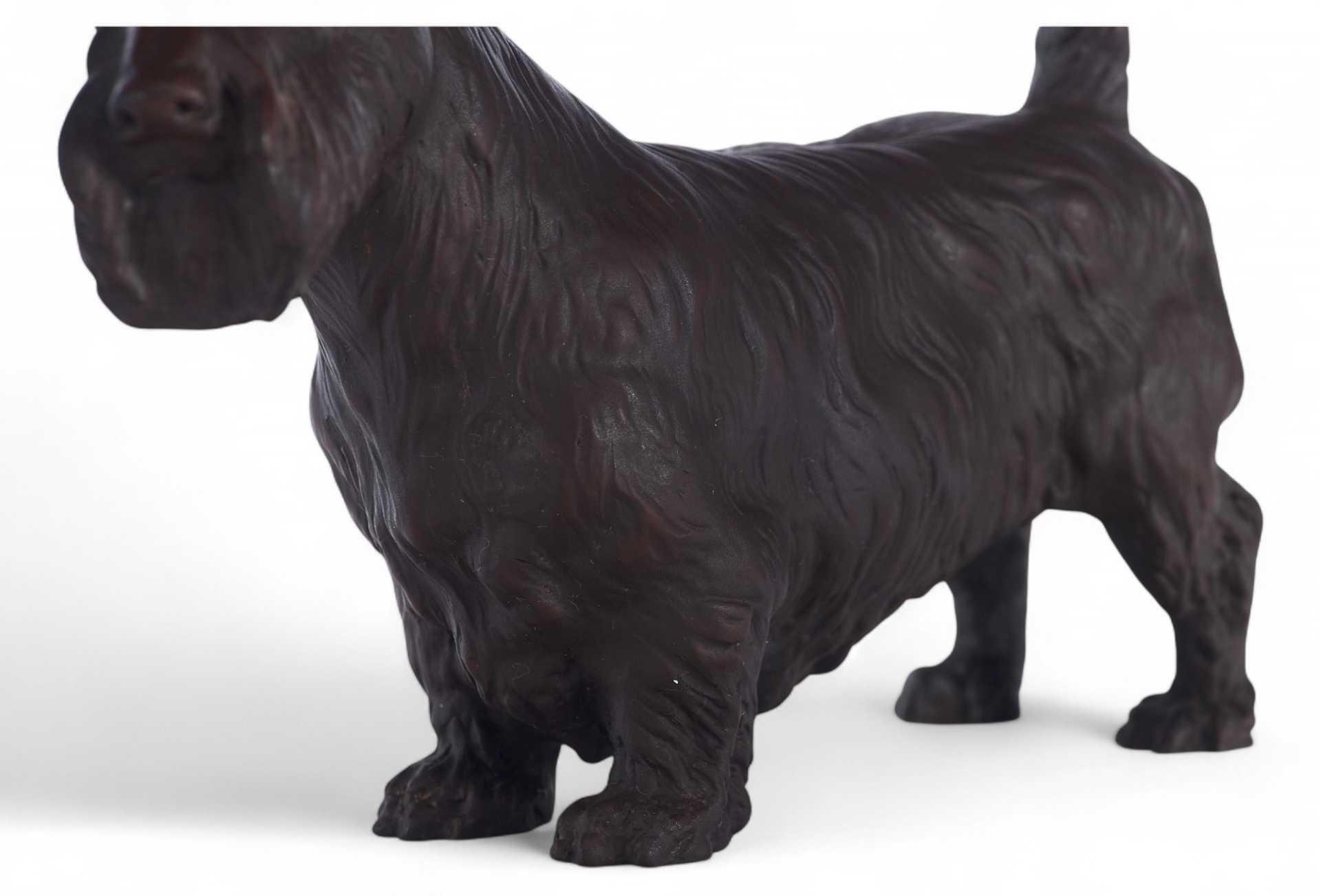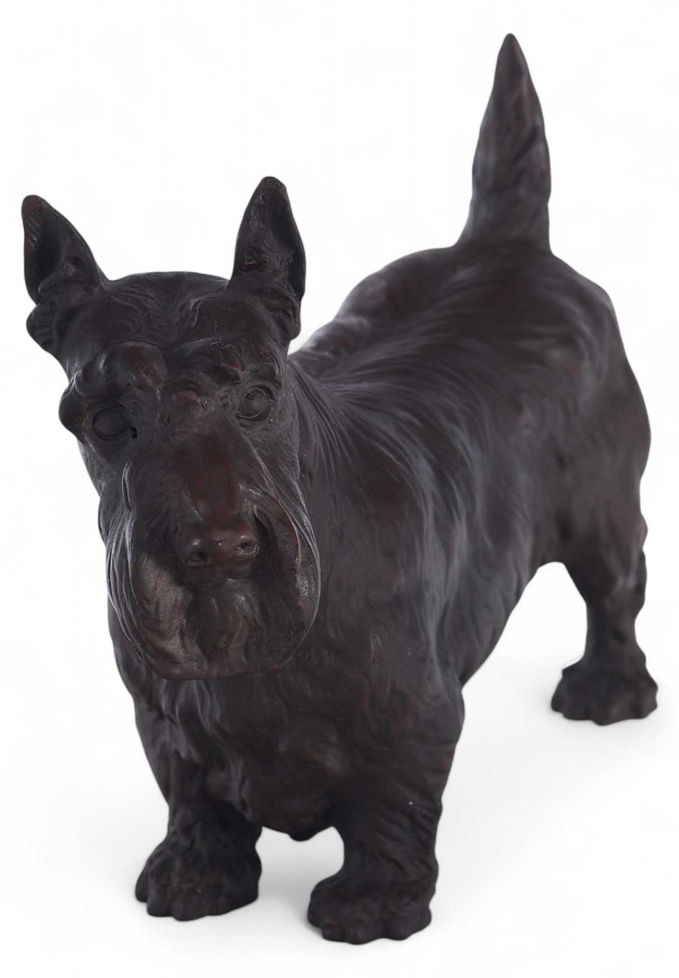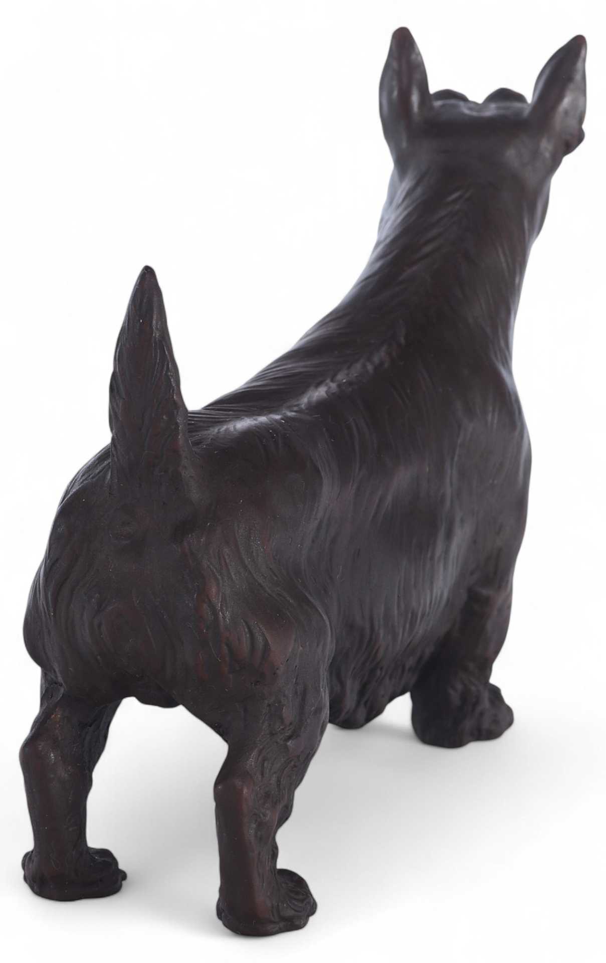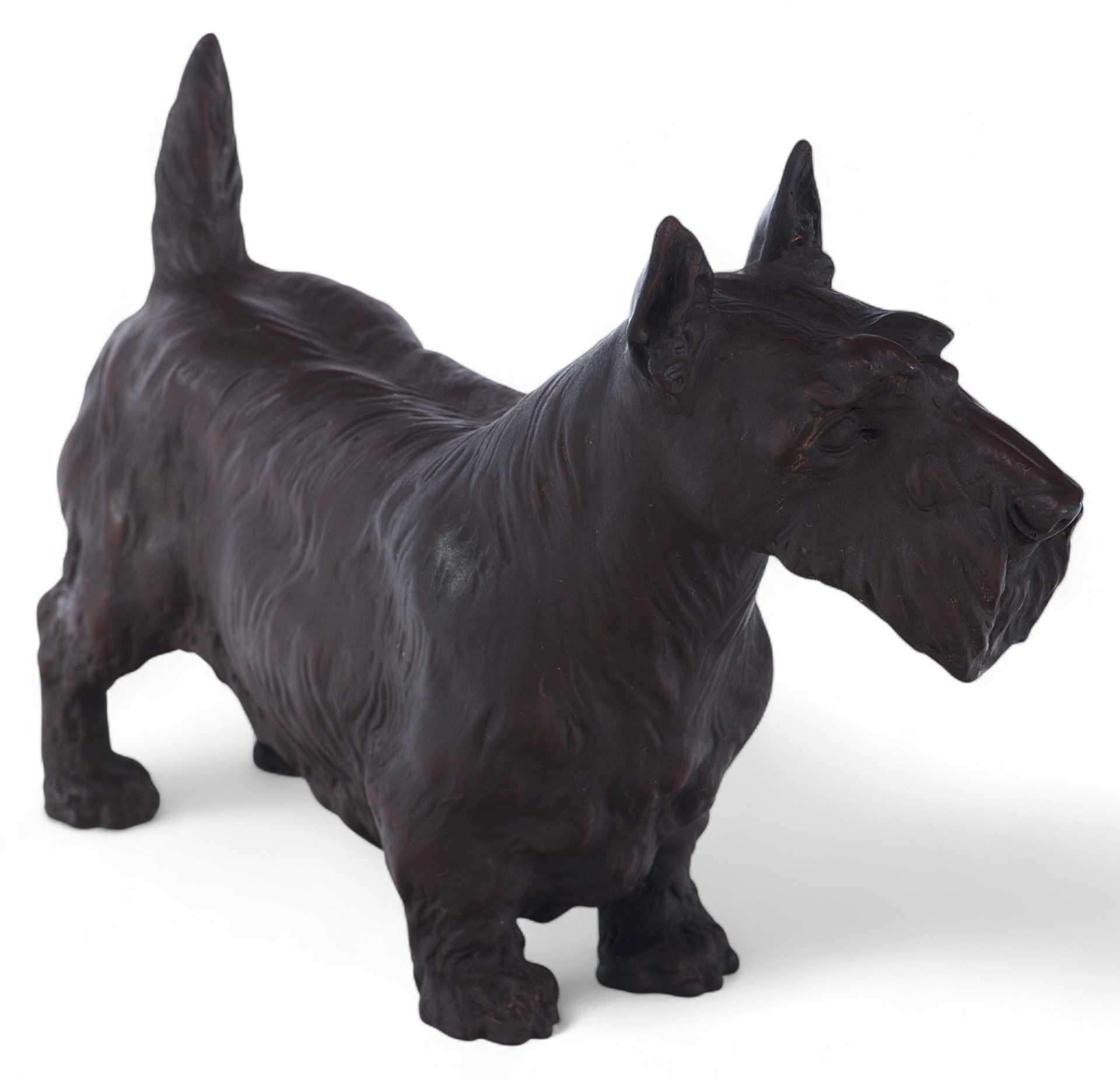 Статуэтка представляет собой фигурку собаки породы «скотч-терьер». Великолепно передана фактура шерсти животного; характерные детали образа — навостренные ушки и торчащий хвост, поза собаки — придают композиции живость и динамику. Изделие выполнено очень изящно, на высоком уровне, в лучших традициях анималистического жанра, что