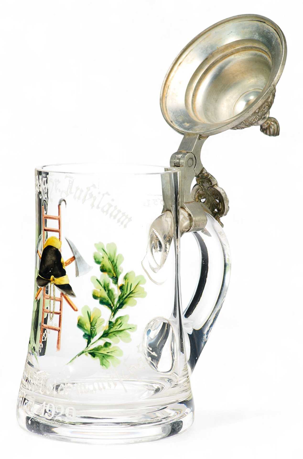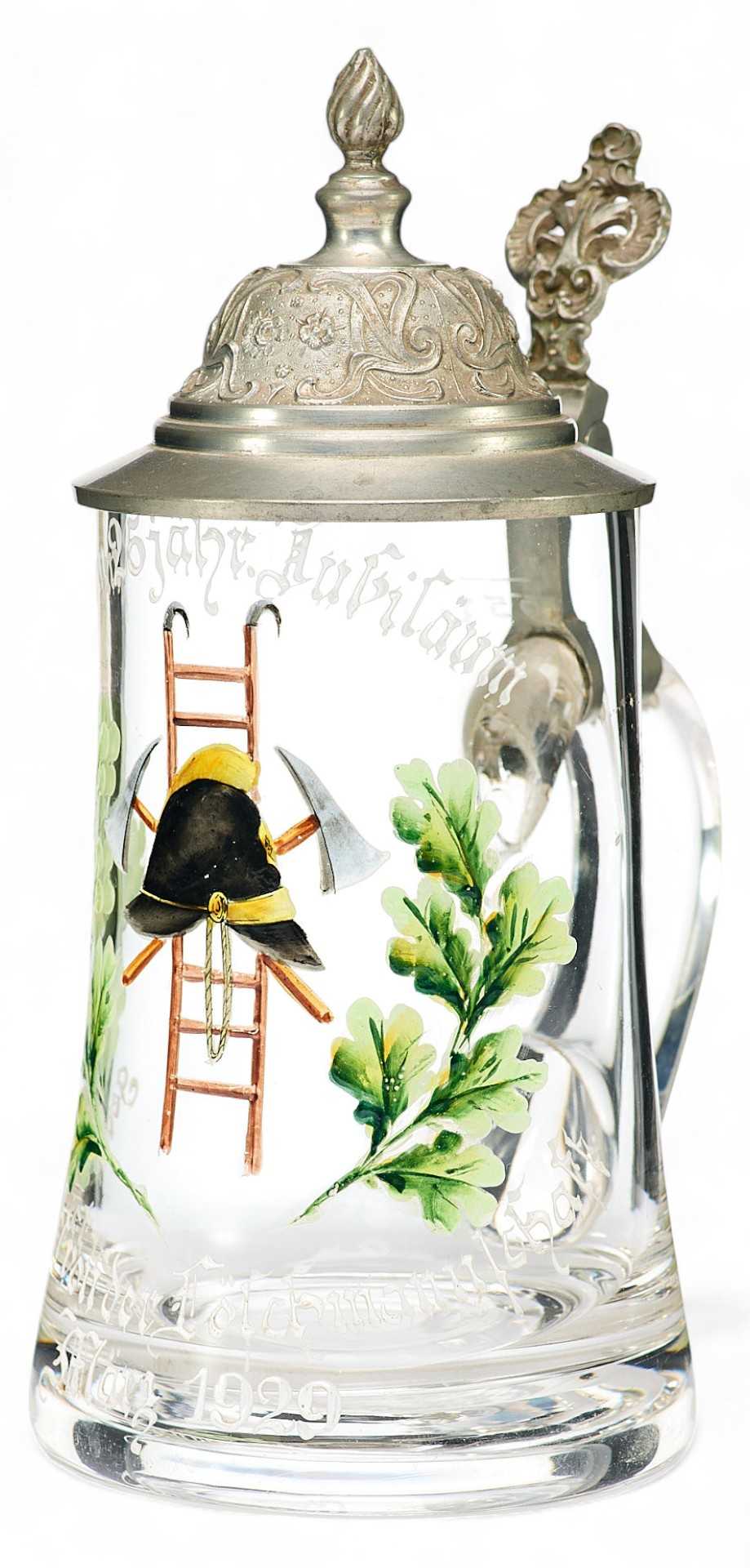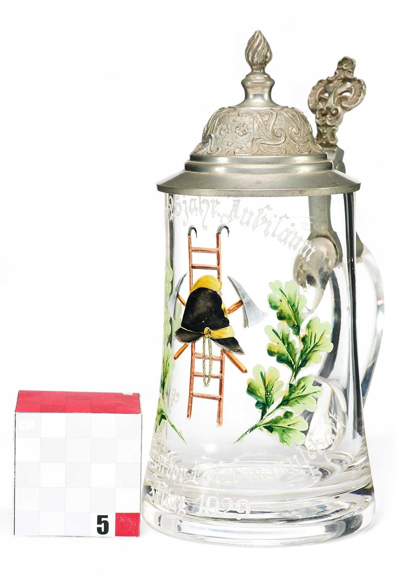 изображающей пожарную каску на фоне перекрещенных пожарных топоров и лестницы. По сторонам от пожарной атрибутики изображены два венка из дубовых листьев. Вверху и внизу изображение обрамляет памятная надпись с датой - 1929 г., свидетельствующая о юбилейном 25-летнем сроке службы. Первые пивные кружки стали появляться в Германии в начале 16 века.