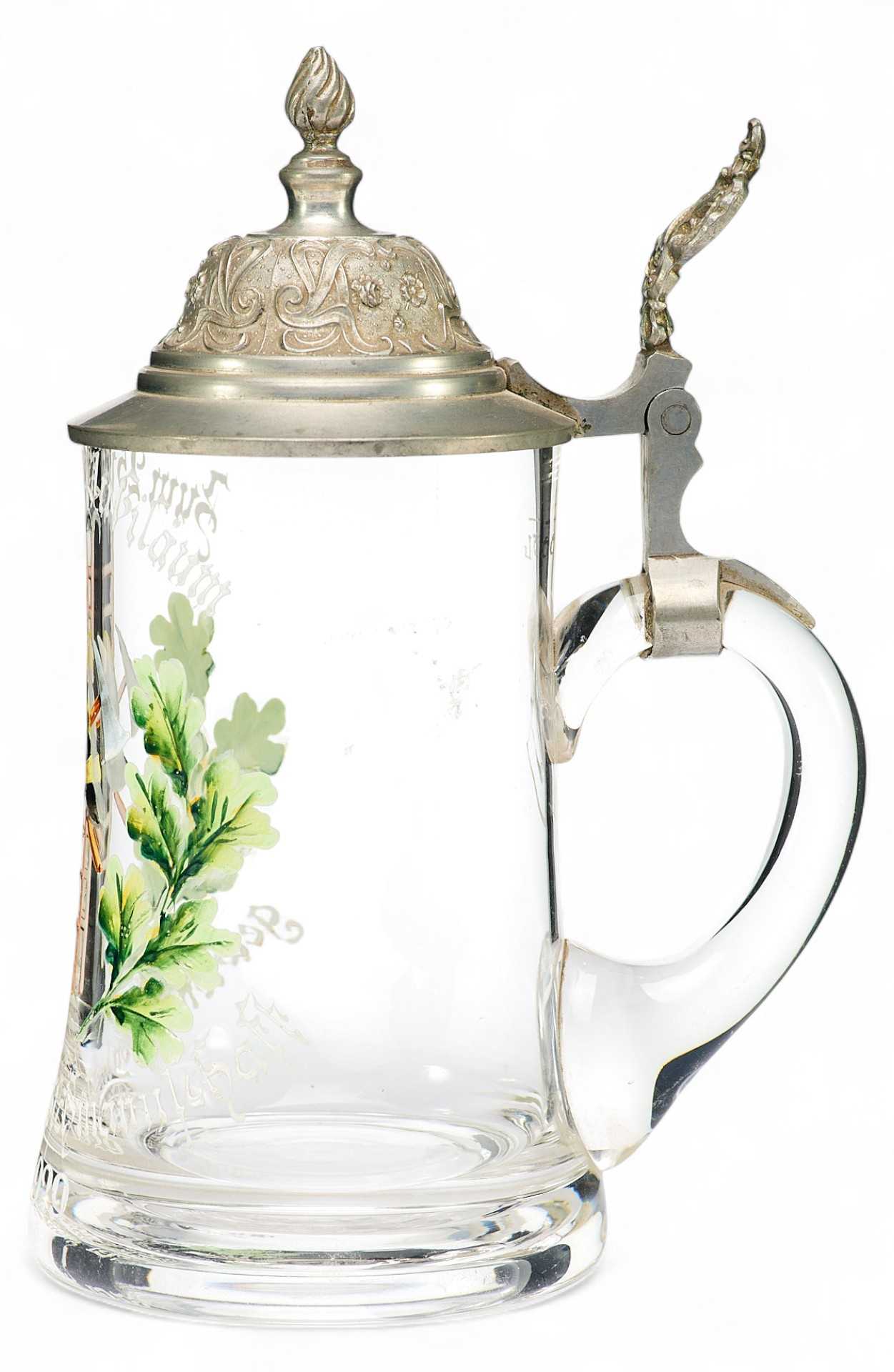 Стеклянная пивная кружка с высокой декоративной крышкой в стиле барокко. Стенки кружки украшены эмалевой росписью