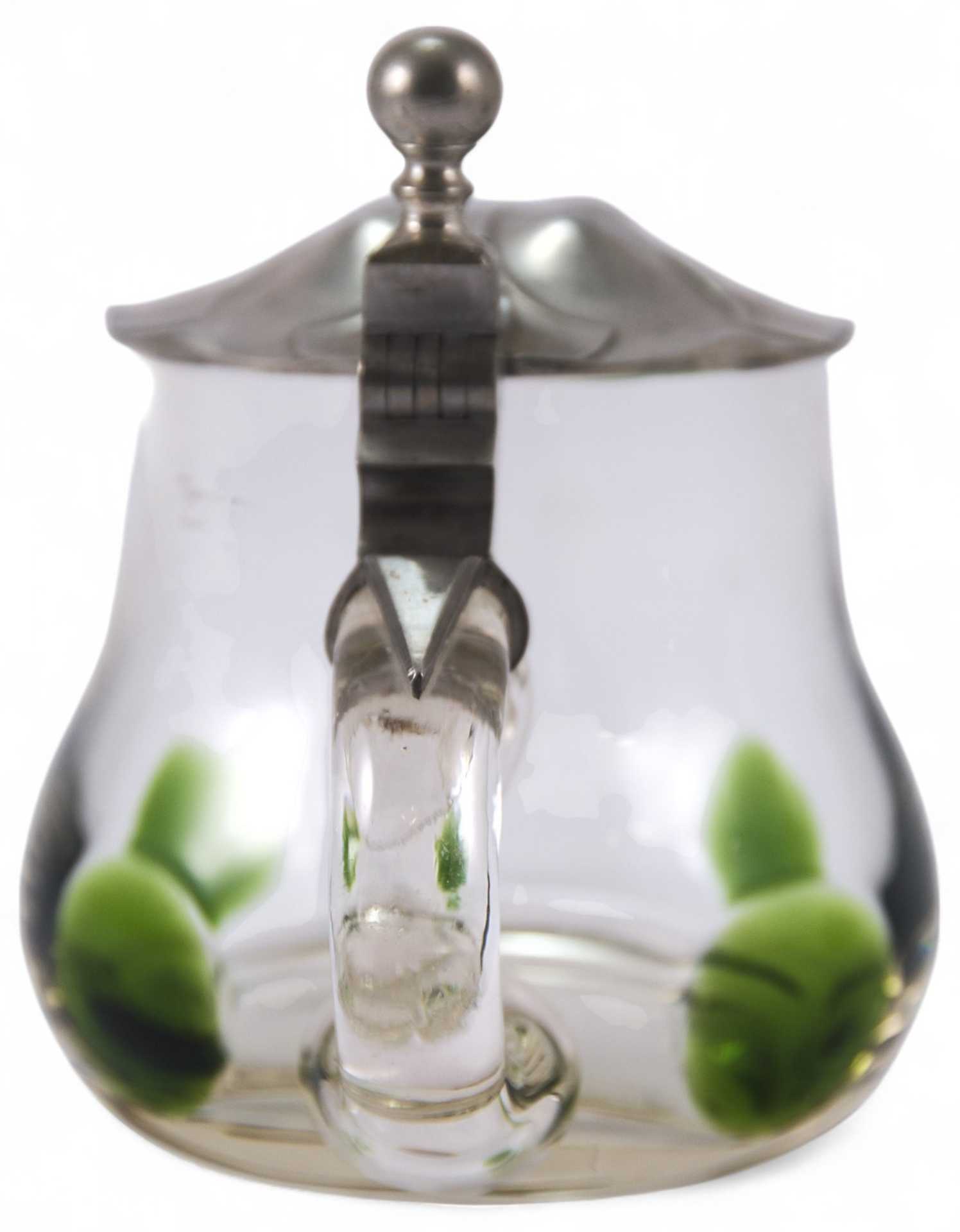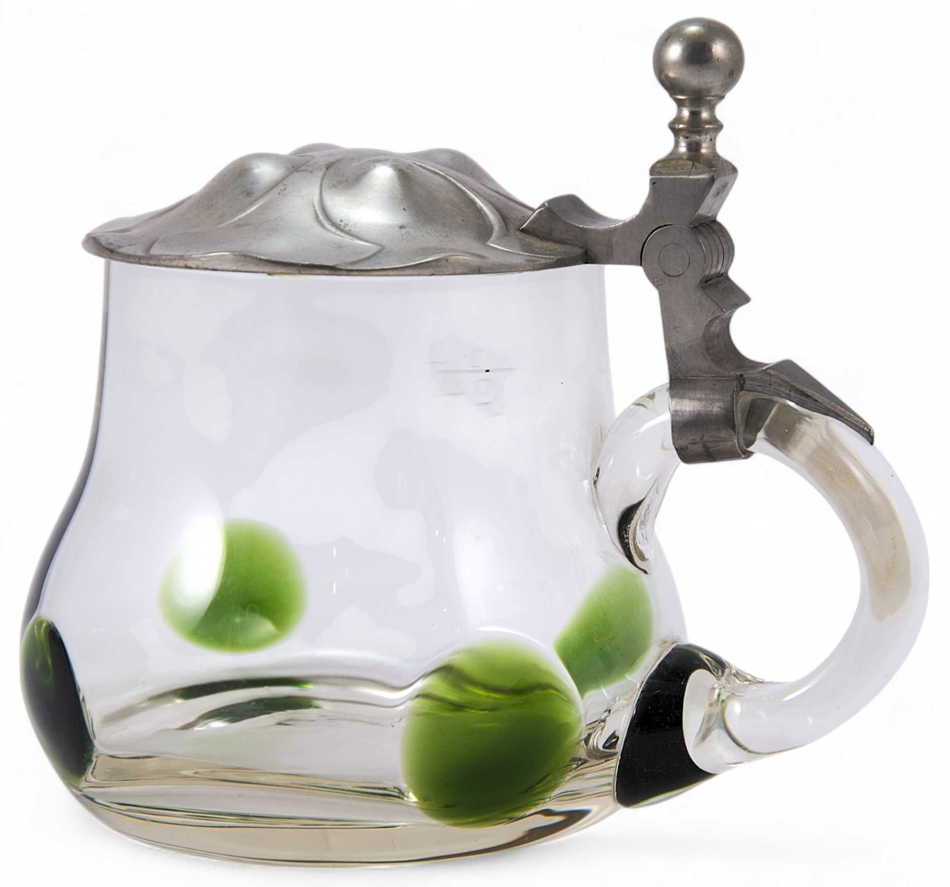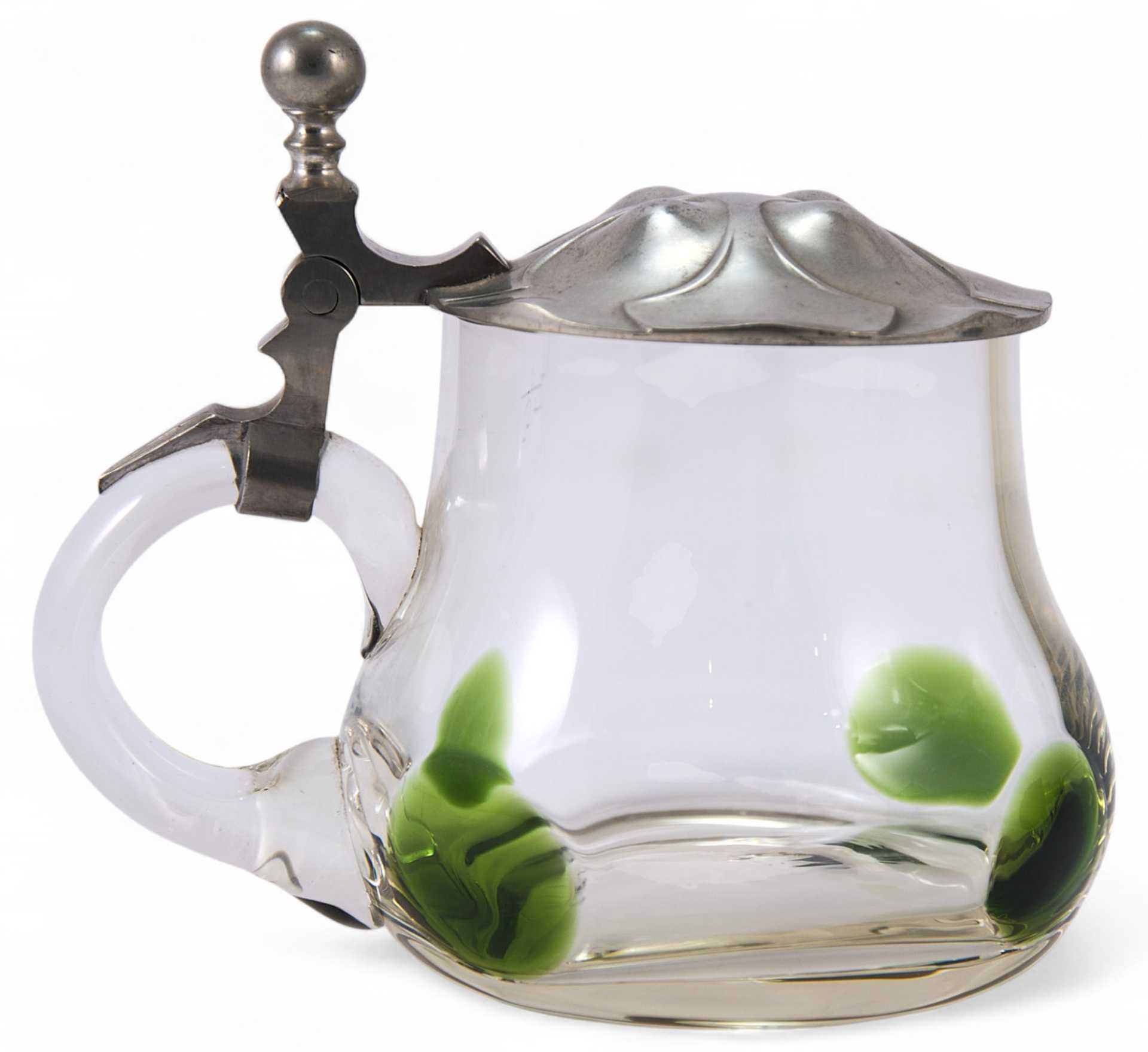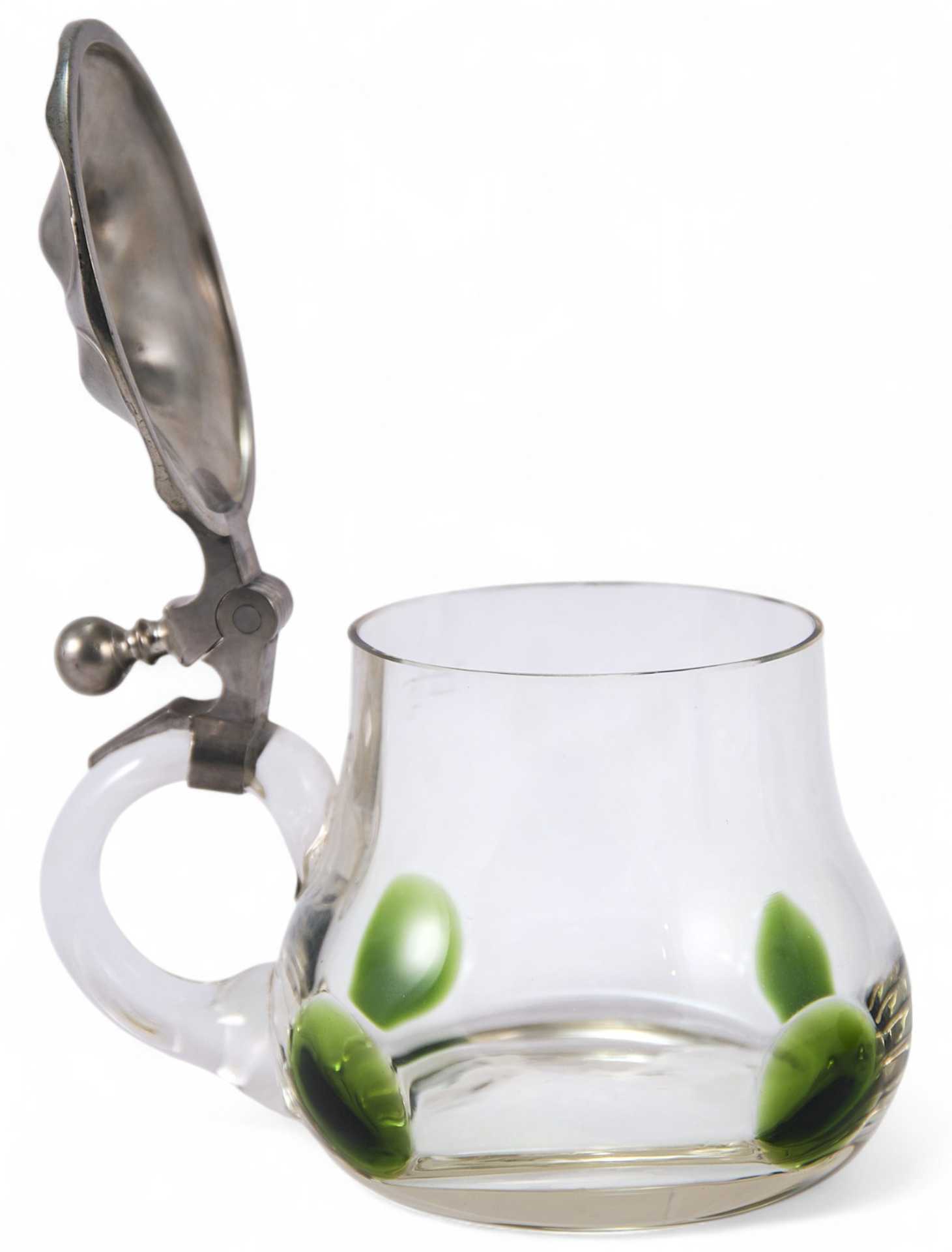 По краю имеется гравировка, указывающая литраж емкости: Ѵг L Крышка выполнена в соответствии ср стилевыми признаками стиля сецессион. Толщина и качество обработки стекла позволяют предположить, что предмет был
