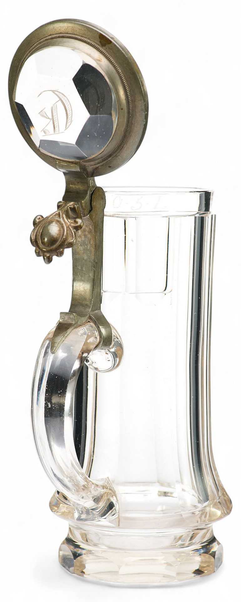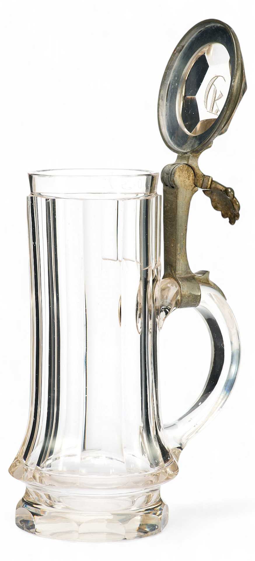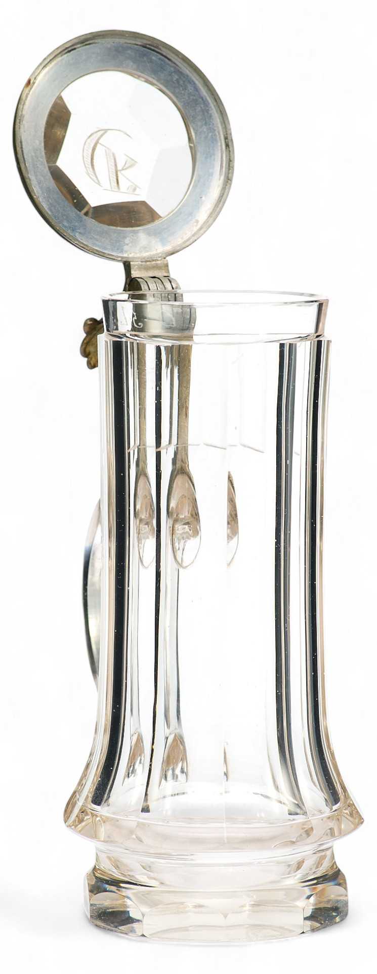Представлена пивная кружка с крышкой, украшенная изображением ландышей. На крышке гравировка: полумесяц и буква R .