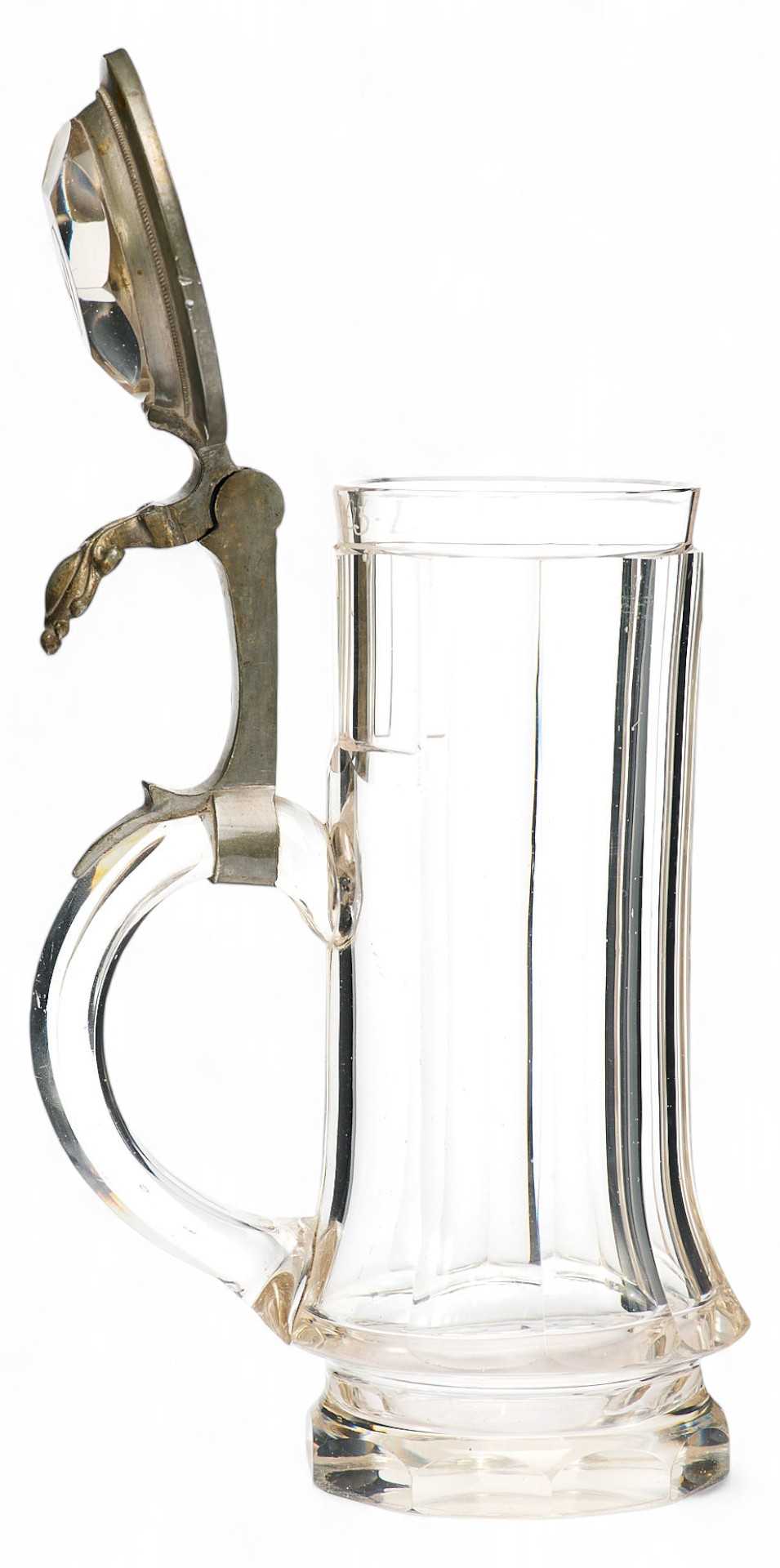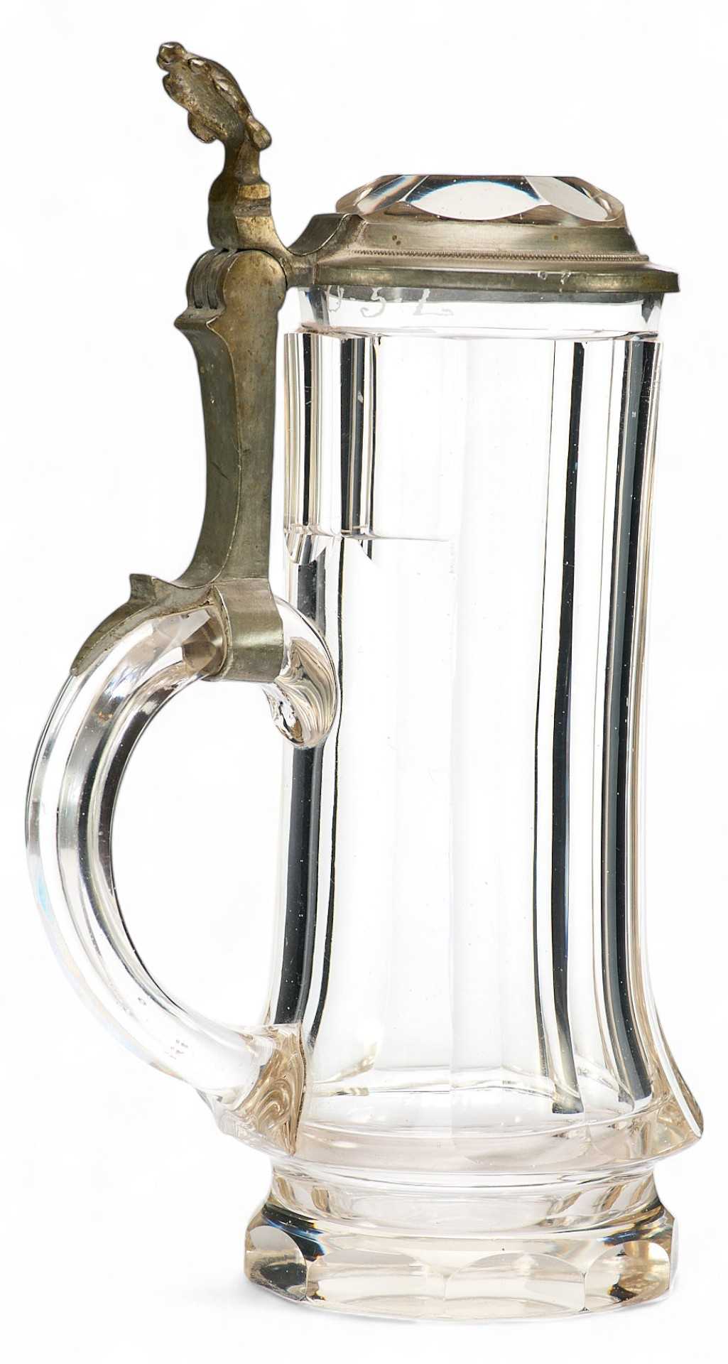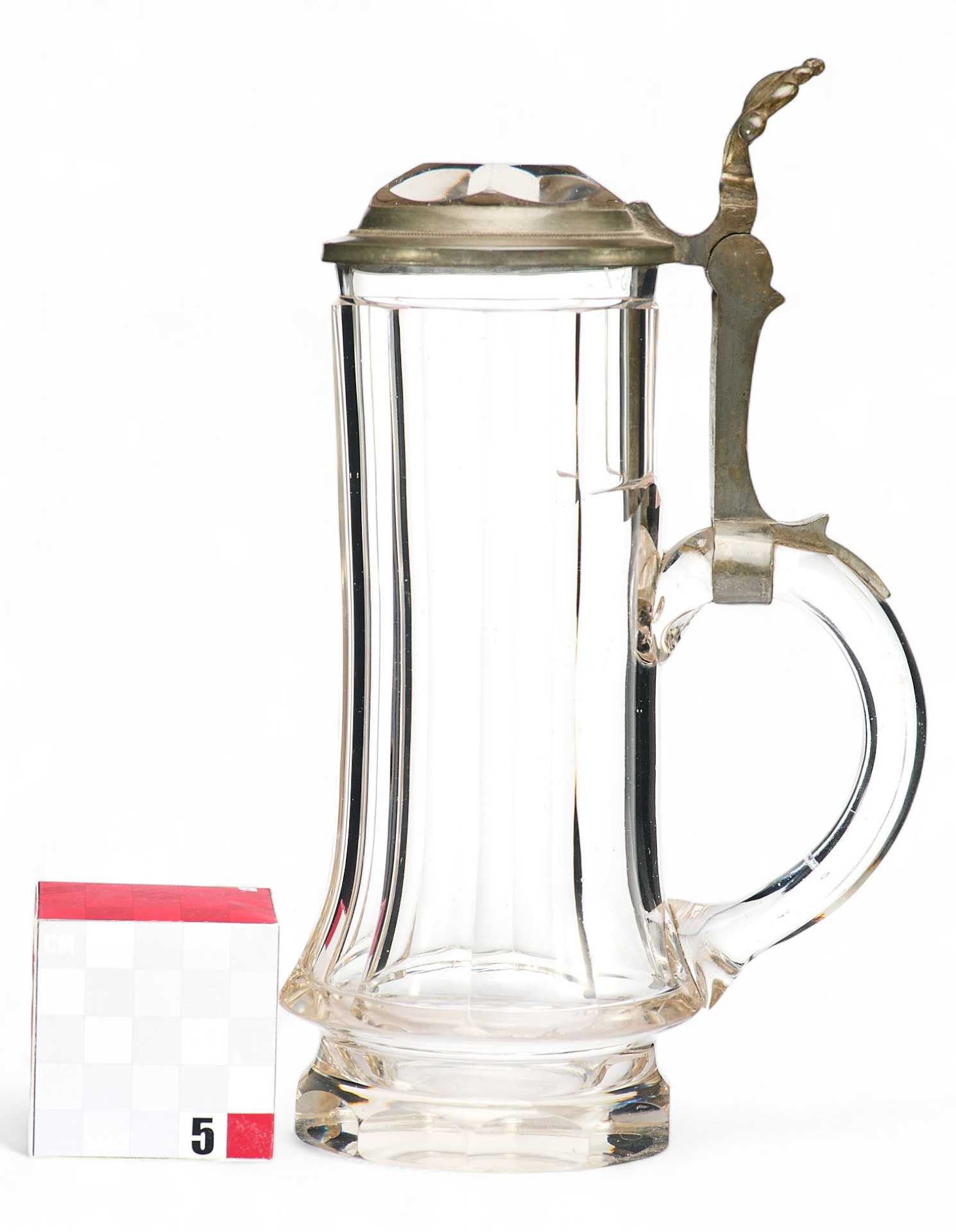 Представлена пивная кружка с крышкой, украшенная изображением ландышей. На крышке гравировка: полумесяц и буква R .
