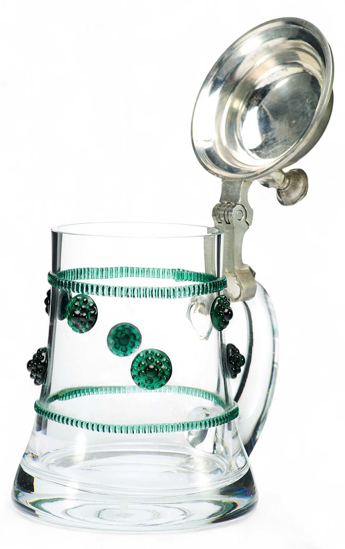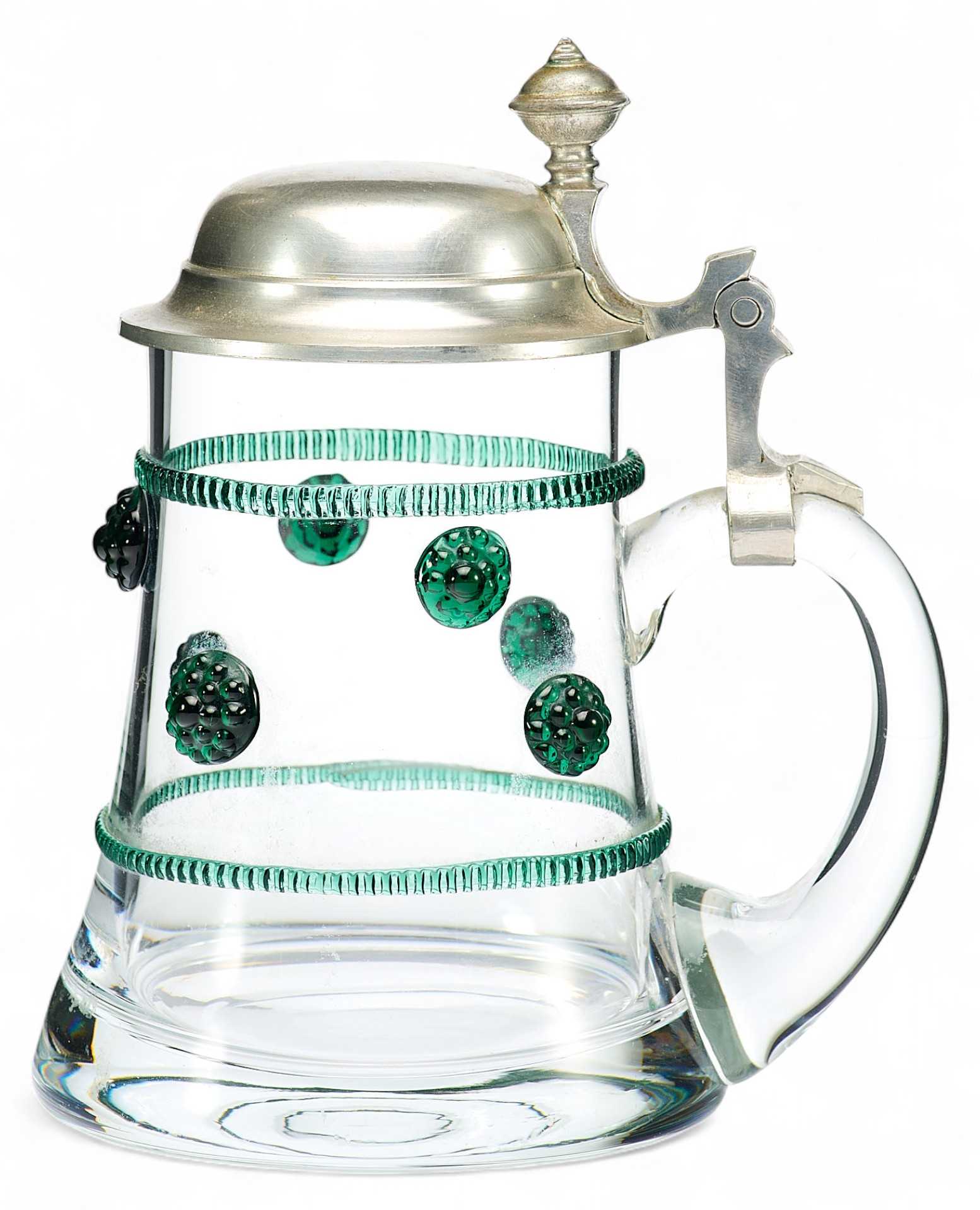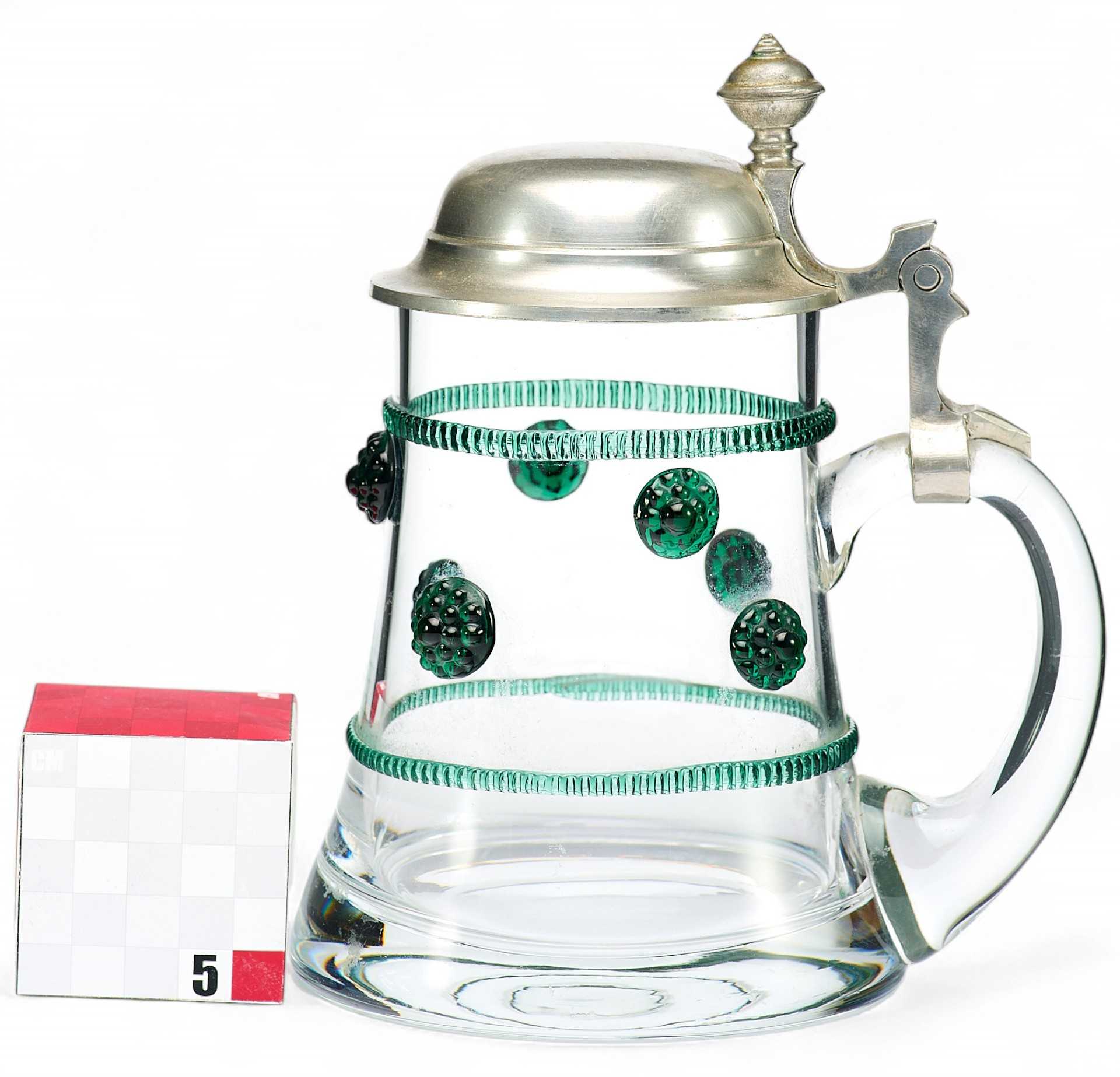 Кружка цилиндрическая с выпуклой откидной крышкой с шарообразным упором. Ручка С-образной формы. Тулово декорировано двумя рельефными поясками и круглыми рельефными вставками в виде ягод ежевики. I Іо своим художественным и стилистическим признакам и качеству обработки материала пивная кружка относится к продукции богемских мастерских начала XX века.