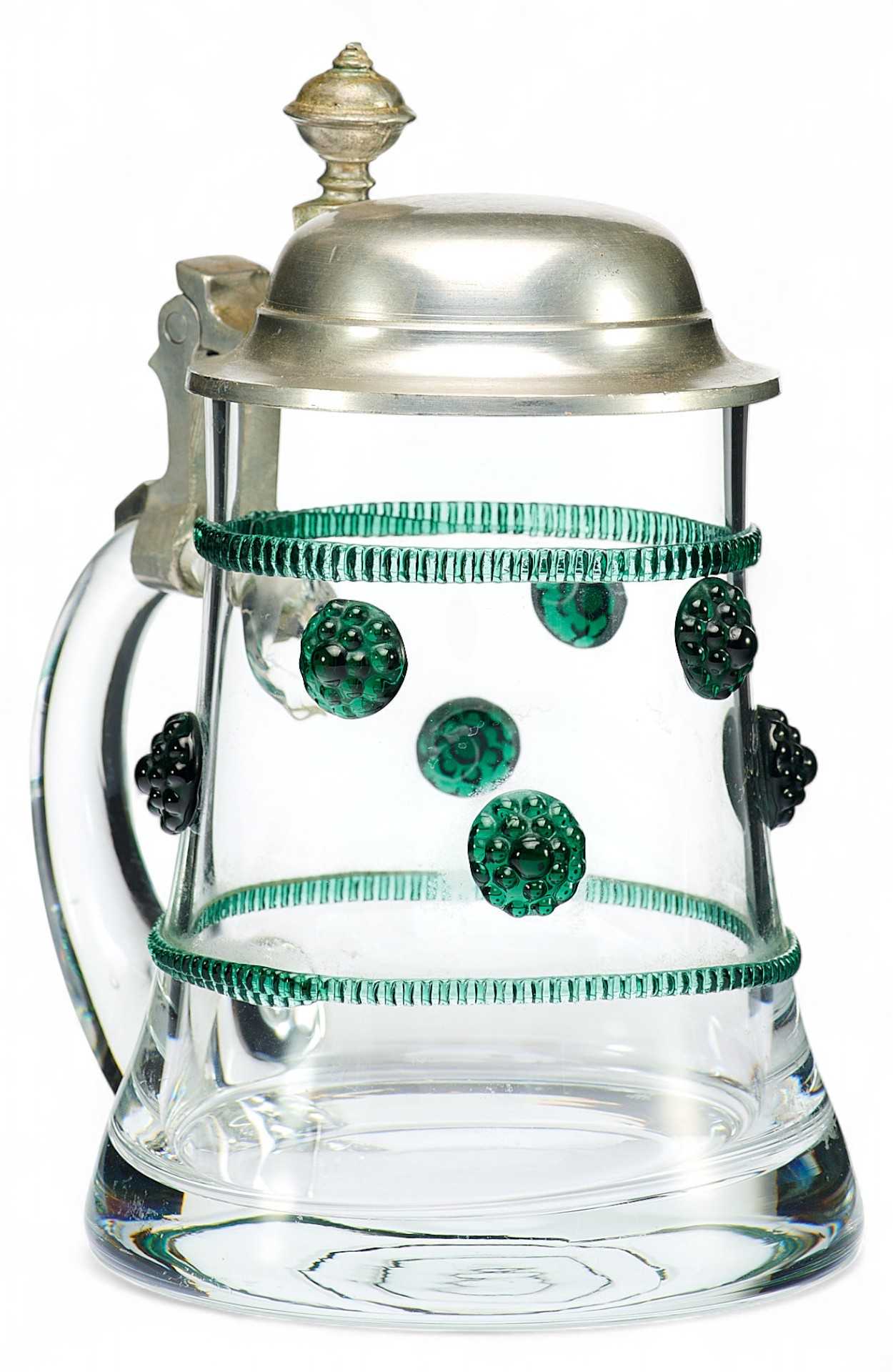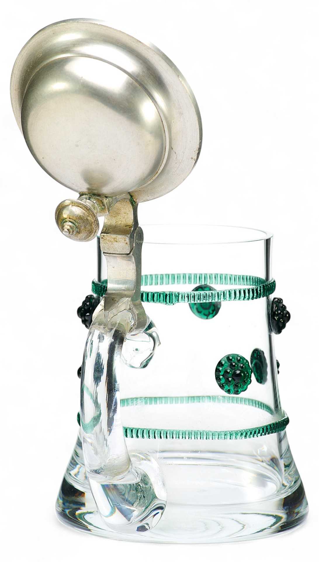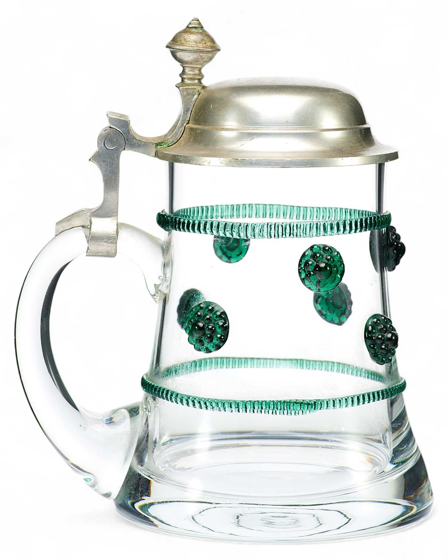 Кружка цилиндрическая с выпуклой откидной крышкой с шарообразным упором. Ручка С-образной формы. Тулово декорировано двумя рельефными поясками и круглыми рельефными вставками в виде ягод ежевики. I Іо своим художественным и стилистическим признакам и качеству обработки материала пивная кружка относится к продукции богемских мастерских начала XX века.