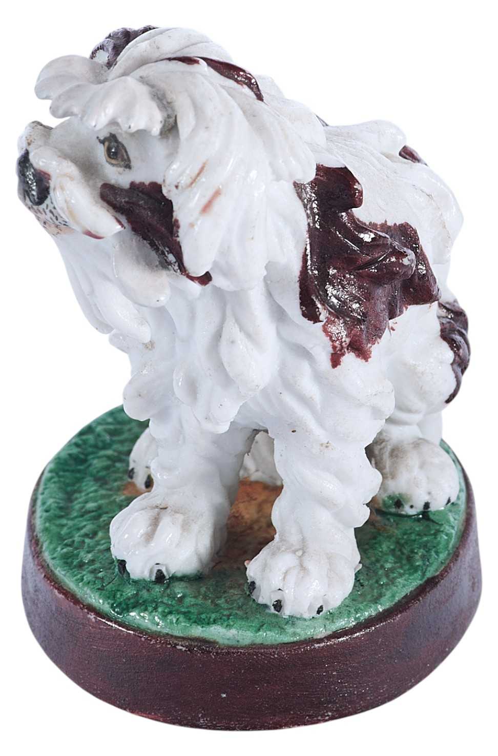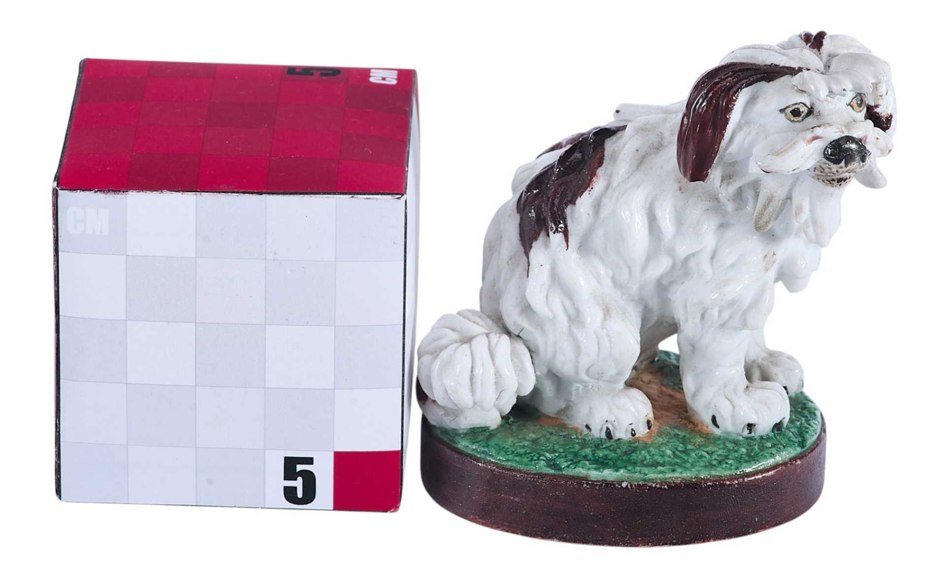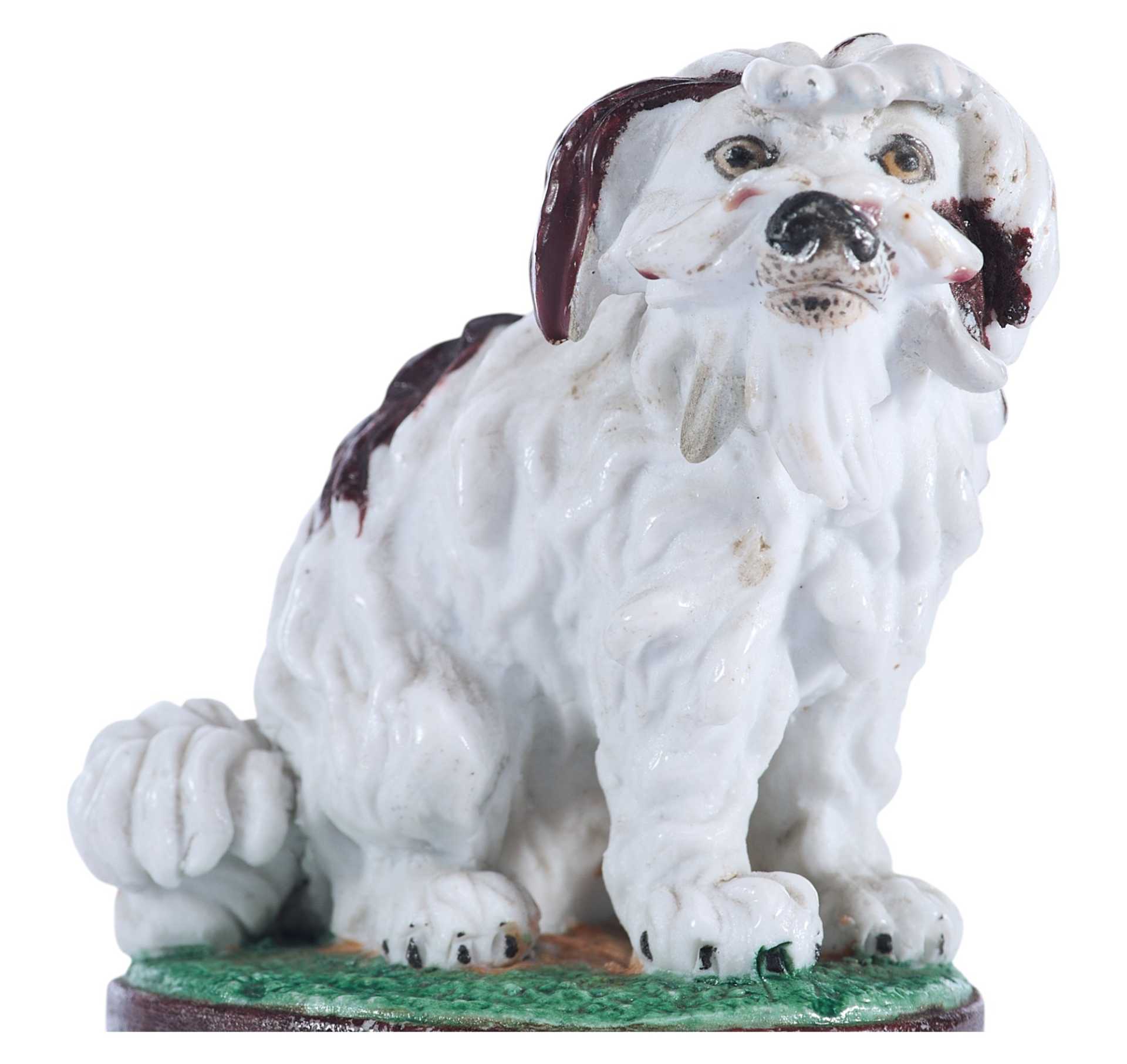 Данная скульптура изготавливалась, как интерпретация аналогичной фарфоровой фигуры собаки-болонки выполненной И. И. Кендлером и изготавливавшейся на Мейсенской фарфоровой мануфактуре с ХVIII в. На основании скульптуры клеймо фарфорового завода Гарднера, периода конца XIX в. «В тесте» - АГ.