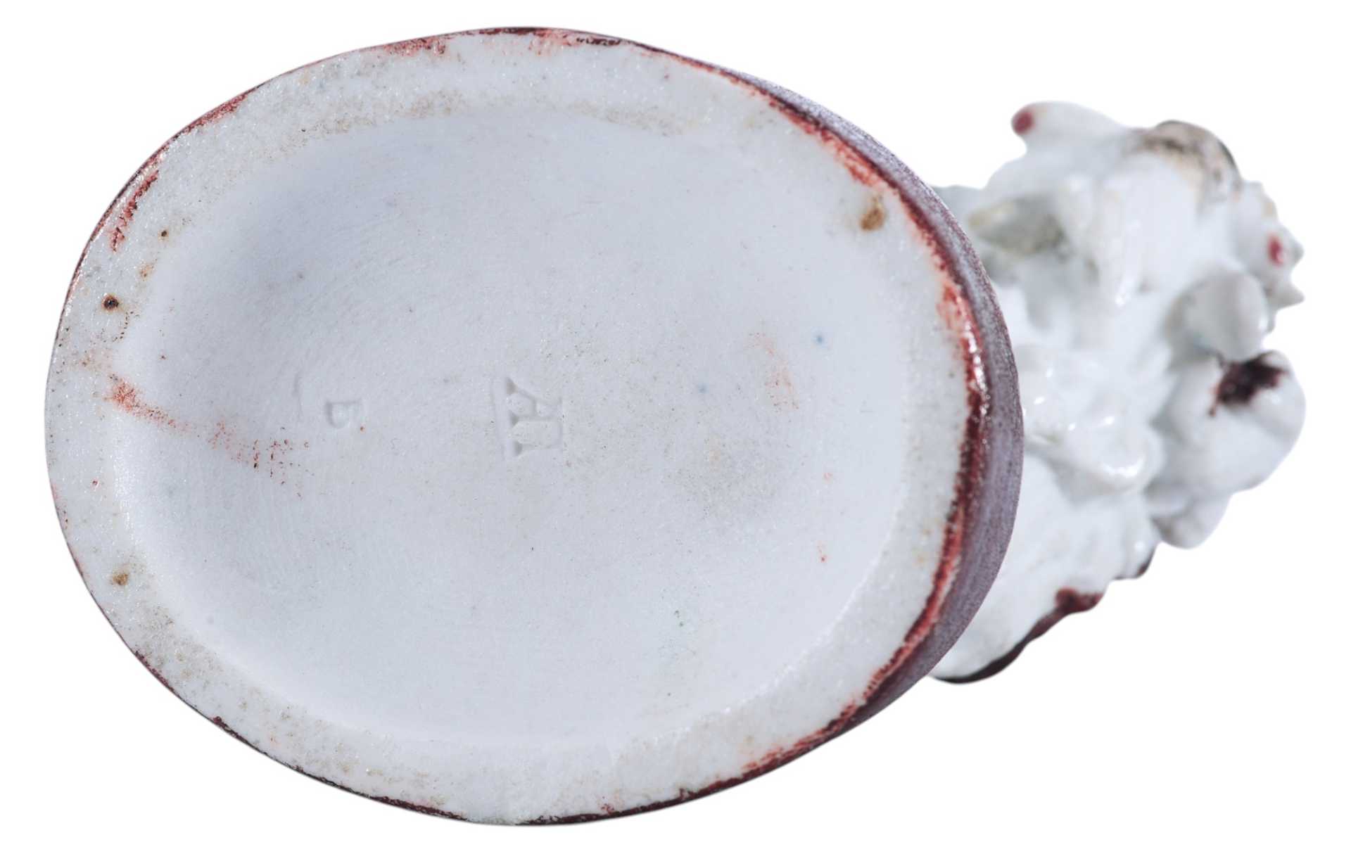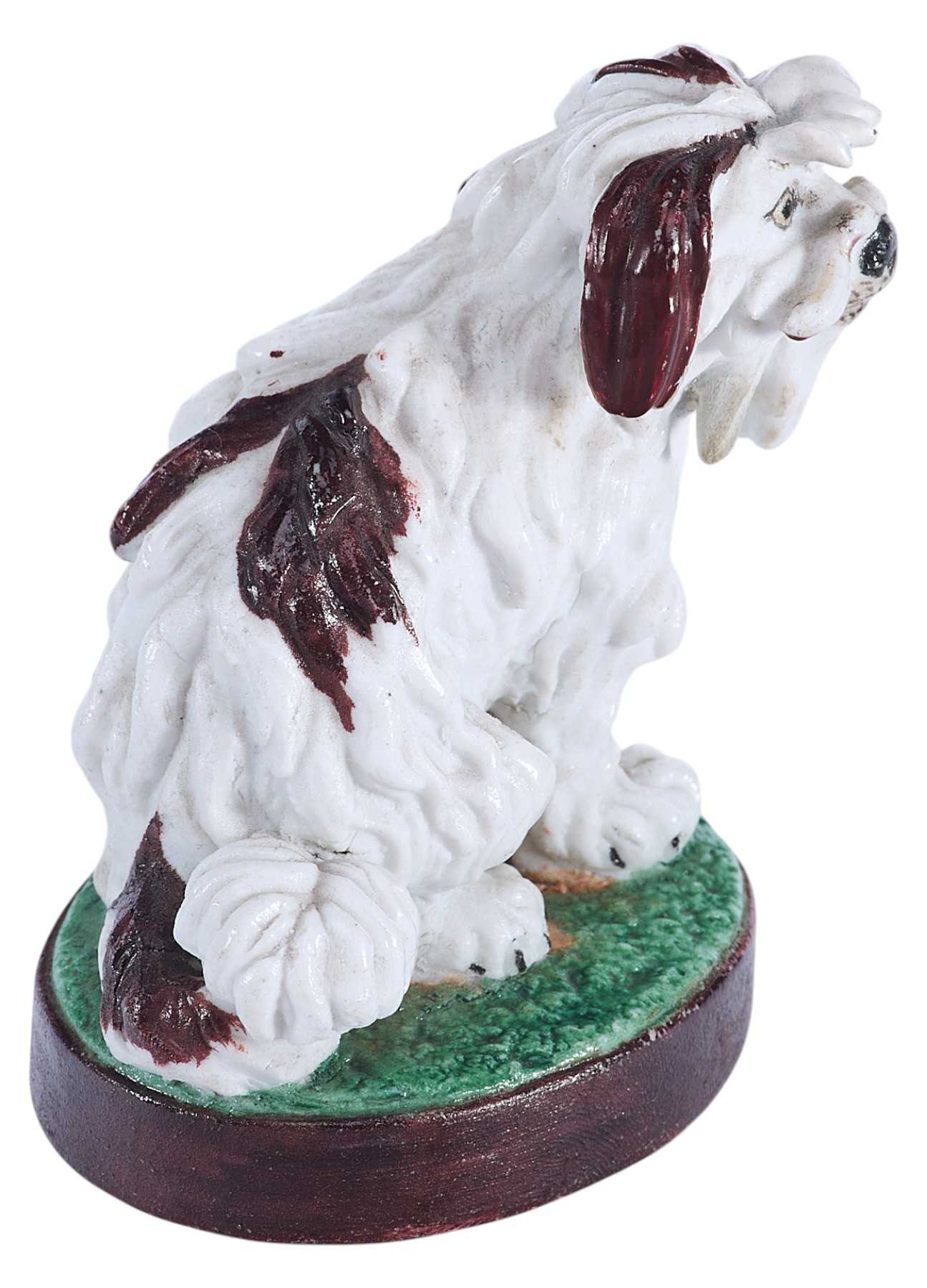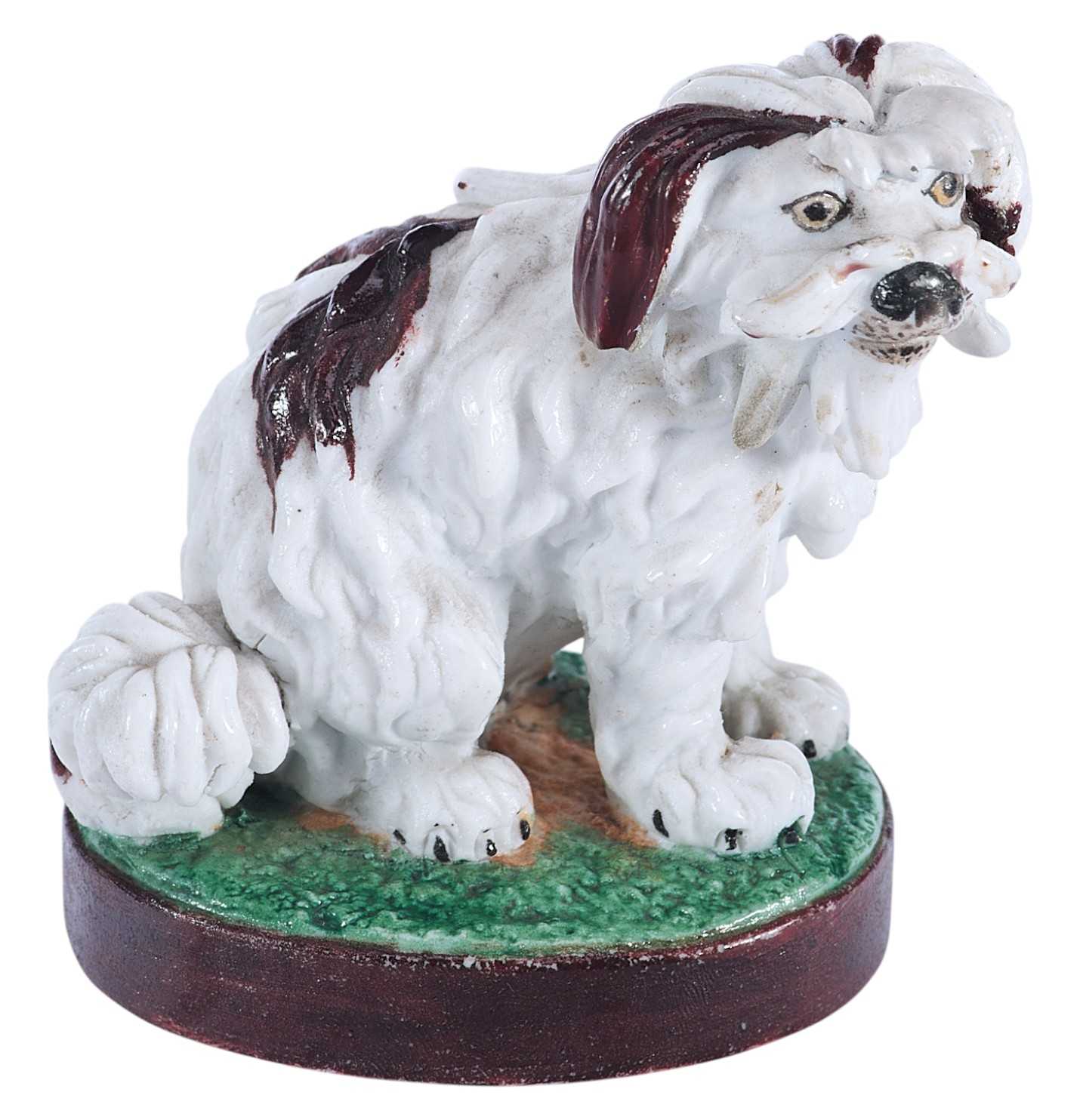 Данная скульптура изготавливалась, как интерпретация аналогичной фарфоровой фигуры собаки-болонки выполненной И. И. Кендлером и изготавливавшейся на Мейсенской фарфоровой мануфактуре с ХVIII в. На основании скульптуры клеймо фарфорового завода Гарднера, периода конца XIX в. «В тесте» - АГ.