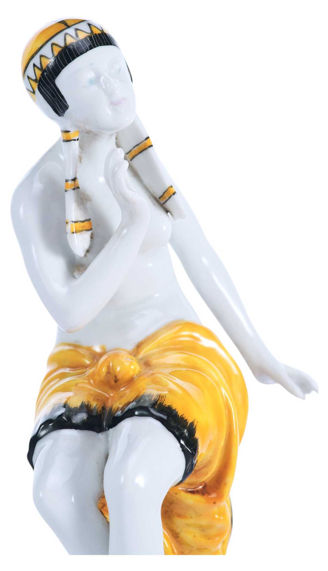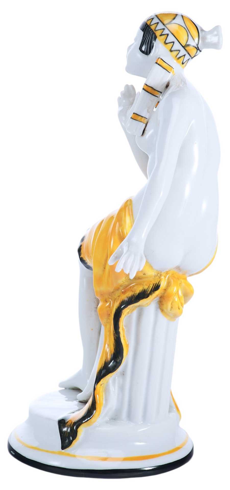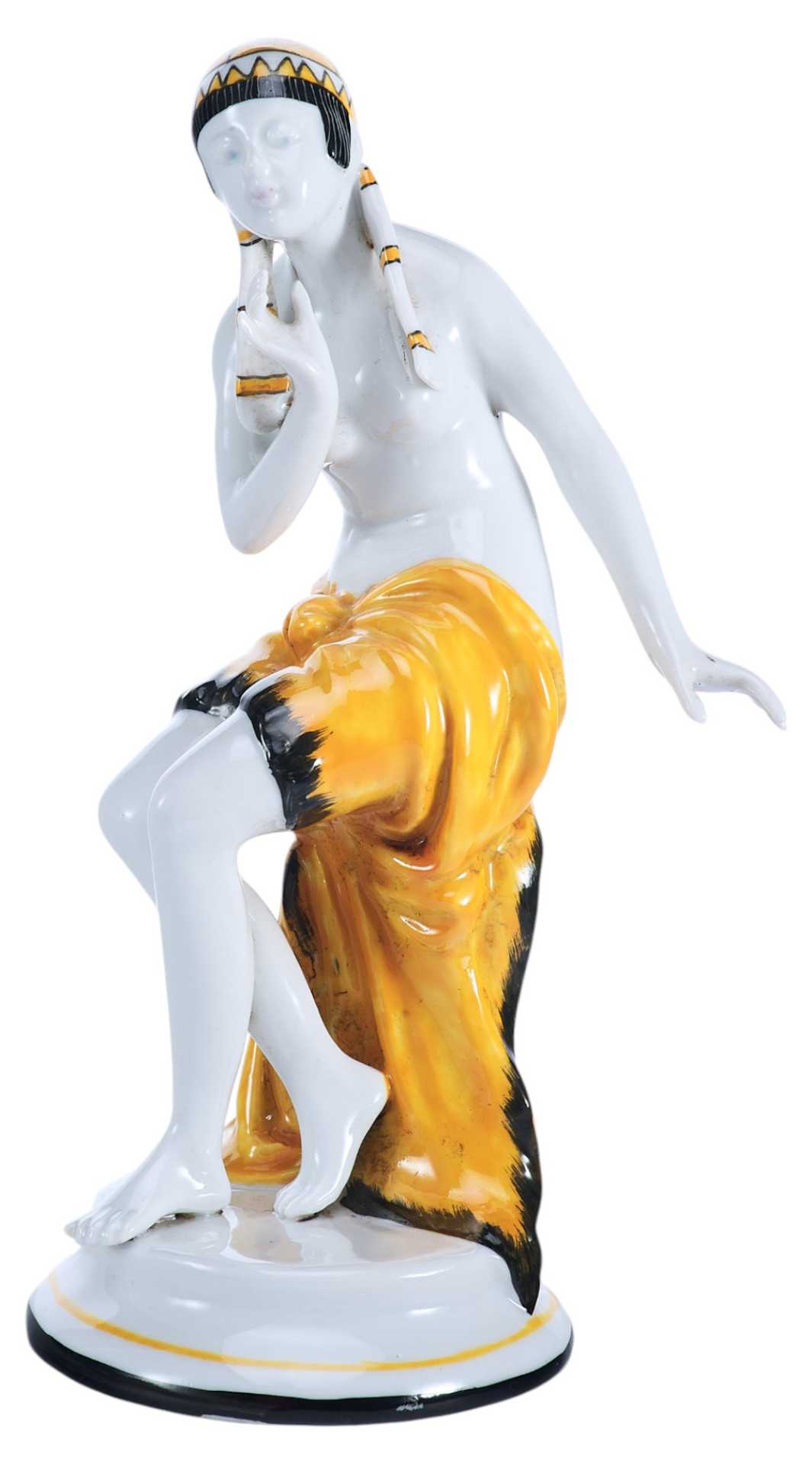 Скульптура молодой обнаженной женщины. По костюму, с явными элементами Востока, можно сказать, что скульптура представляет собой пример пластики периода ар-деко. Первые модели одежды ар-деко сочетали в себе большое количество стилей и мотивов: восточных, элементов старины, русский конструктивизм, абстракционизм, кубизм, модерн. Яркие и необычные для того времени цветовые сочетания, этника, геометрические узоры делали одежду ар-деко помпезной и претенциозной. Ар-деко (Ар Деко от франц. Art Deco по названию выставки 1925г. в Париже "Art Decoration" - "Декоративное искусство") зародился в Париже в период между первой и второй мировыми войнами. Ар-деко - представлял собой синтез модерна и неоклассицизма. Этот стиль явился своего рода продуктом сочетания конструктивизма, кубизма, модернизма плюс архаичности древнего Востока, Египта и Африки. Отличительные черты — строгая закономерность, этнические геометрические узоры, роскошь, богатство, шик. Ар-деко мастерски обыгрывал цвет и фактуру самых разных материалов.
