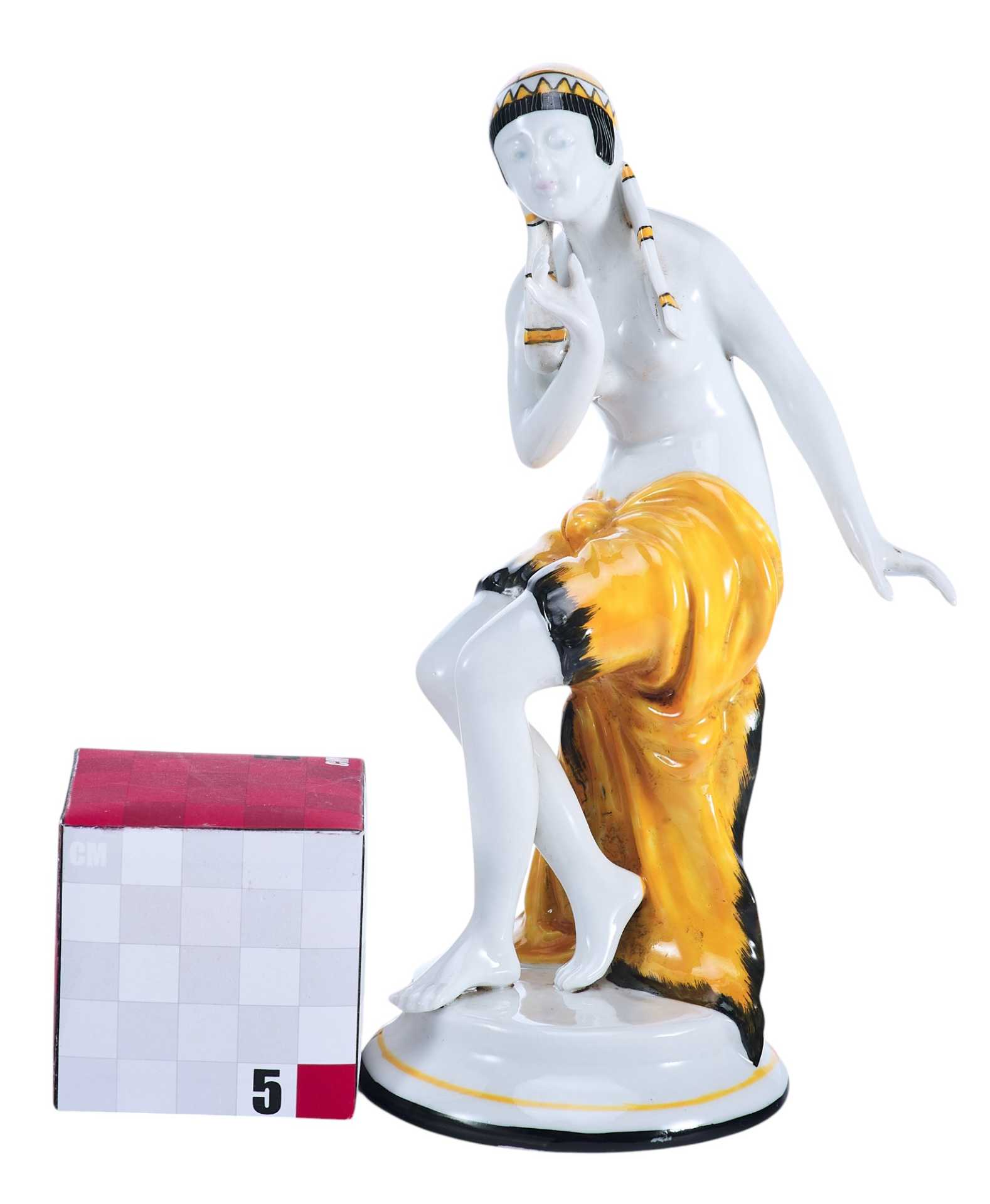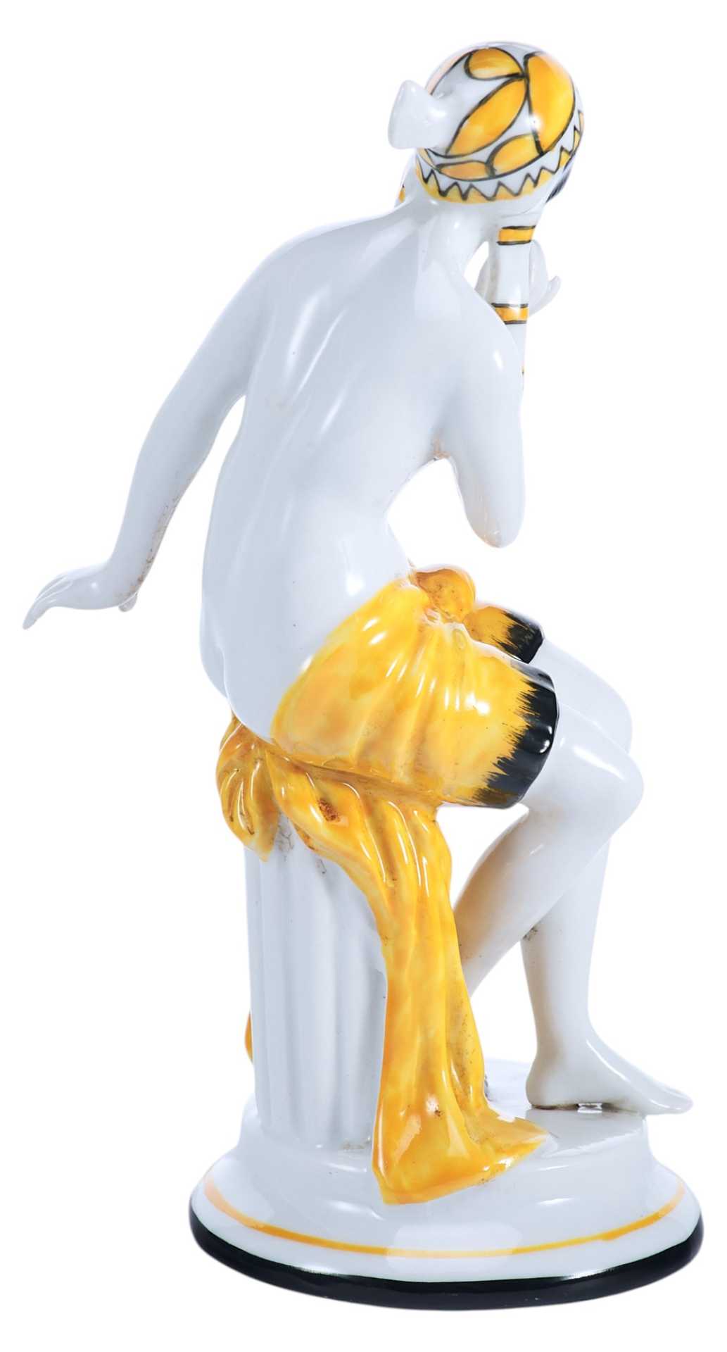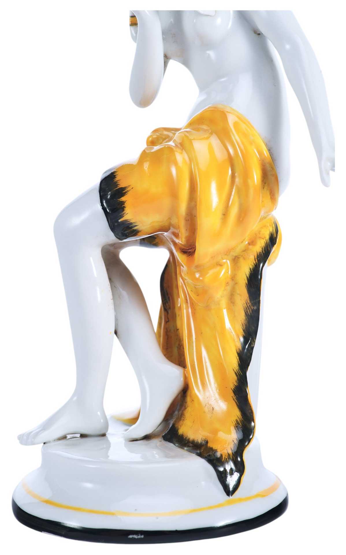 Скульптура молодой обнаженной женщины. По костюму, с явными элементами Востока, можно сказать, что скульптура представляет собой пример пластики периода ар-деко. Первые модели одежды ар-деко сочетали в себе большое количество стилей и мотивов: восточных, элементов старины, русский конструктивизм, абстракционизм, кубизм, модерн. Яркие и необычные для того времени цветовые сочетания, этника, геометрические узоры делали одежду ар-деко помпезной и претенциозной. Ар-деко (Ар Деко от франц. Art Deco по названию выставки 1925г. в Париже "Art Decoration" - "Декоративное искусство") зародился в Париже в период между первой и второй мировыми войнами. Ар-деко - представлял собой синтез модерна и неоклассицизма. Этот стиль явился своего рода продуктом сочетания конструктивизма, кубизма, модернизма плюс архаичности древнего Востока, Египта и Африки. Отличительные черты — строгая закономерность, этнические геометрические узоры, роскошь, богатство, шик. Ар-деко мастерски обыгрывал цвет и фактуру самых разных материалов.