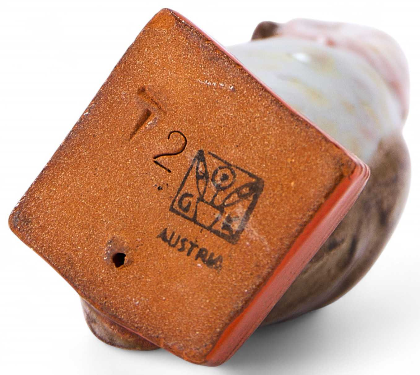 На основании скульптуры клеймо фирмы «Gmundner Keramik Manufaktur GmbH», ставившееся до начала Второй Мировой войны. В «тесте» воспроизведен серийный номер. На глазури имеется авторская подпись. Gmundner Keramik - это многолетние традиции качества. Более 300 лет это предприятие производит высококачественную керамическую посуду ручной работы.