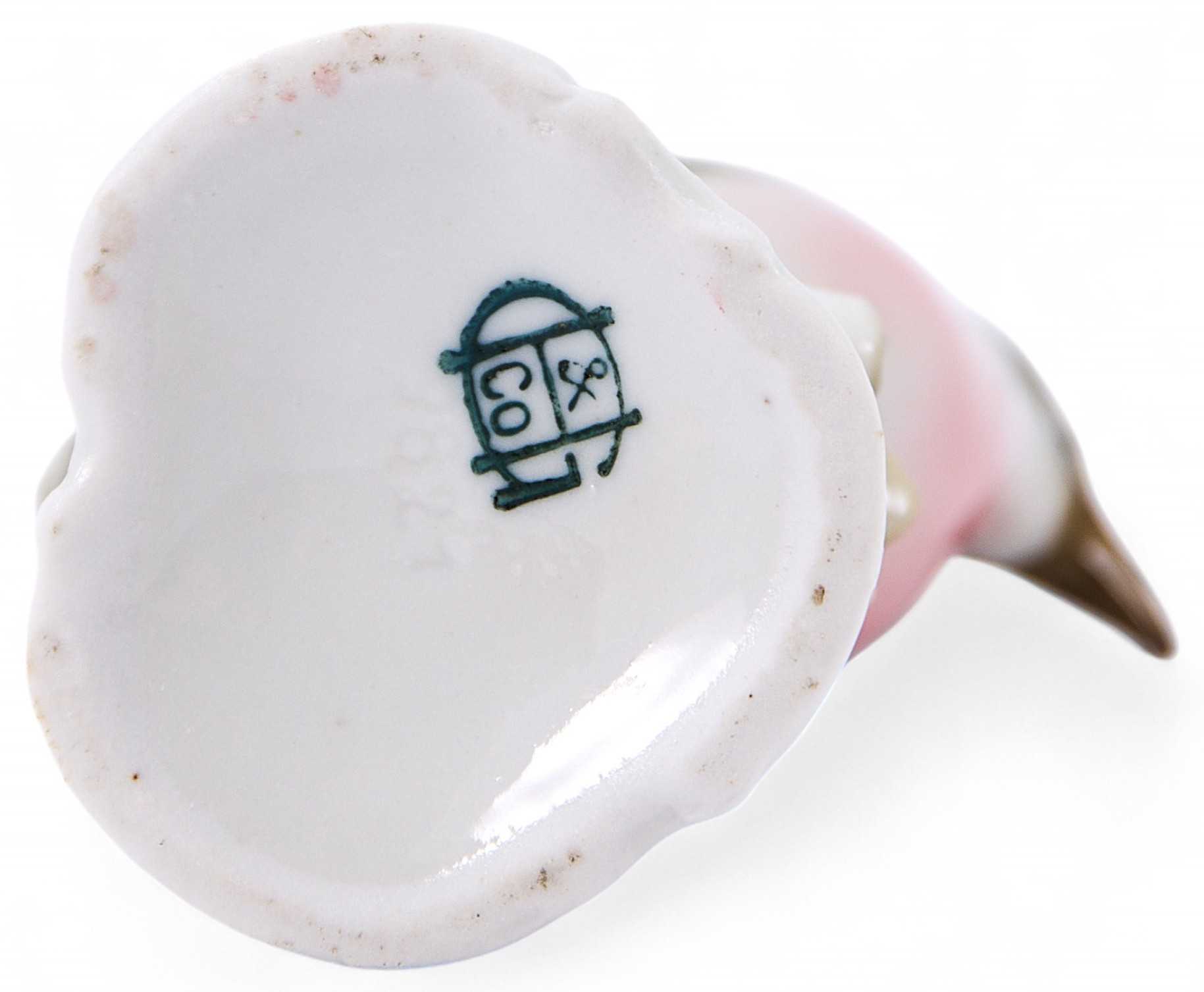 Фигура птицы с коротким гребешком. На основании фигуры производственный номер «в тесте» - 9821 и клеймо фабрики HG&Co. По аббревиатуре монограммы можно предположить, что клеймо принадлежит фирме «Gater Hall & Со», существовавшей с 1905 по 1943 гг., близ Веджвуда. Фабрика Gater Hall & Со. (Англия). Мануфактура, открытая Ральфом Хеммерсли, перенесший свою мануфактуру из Church Bank Pottery близ Тансталла, к 1883 г. преобразовалось в