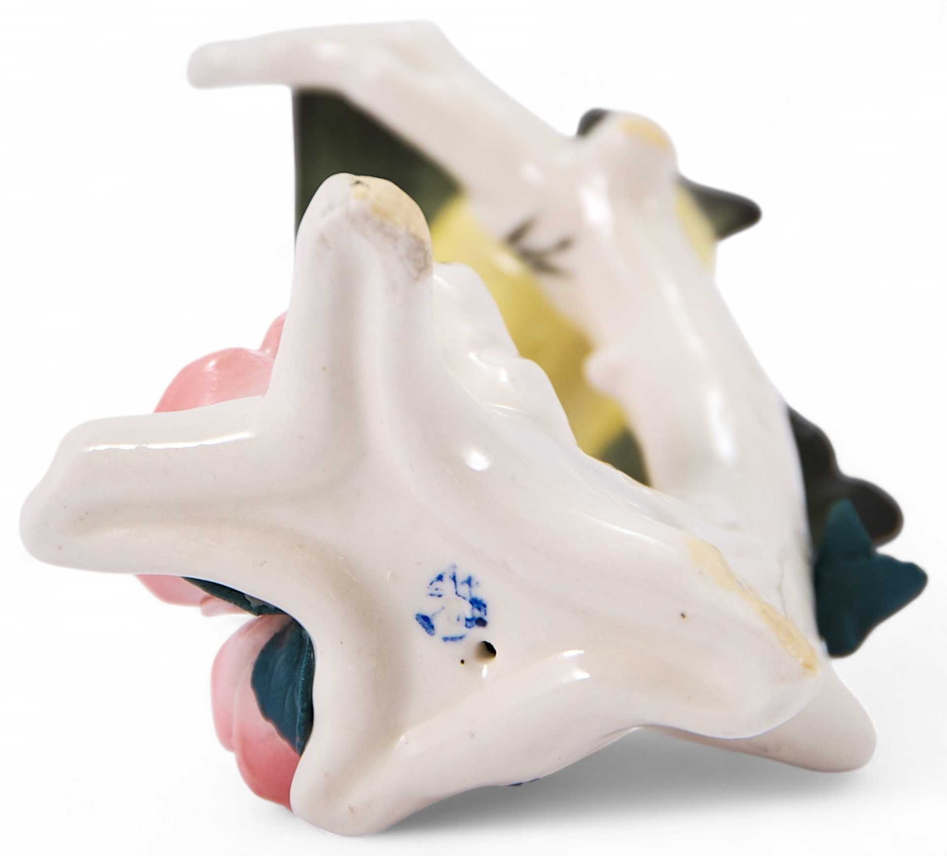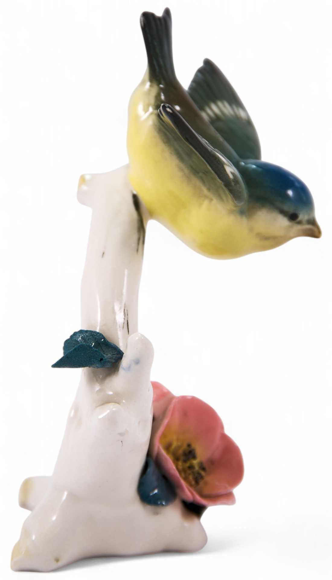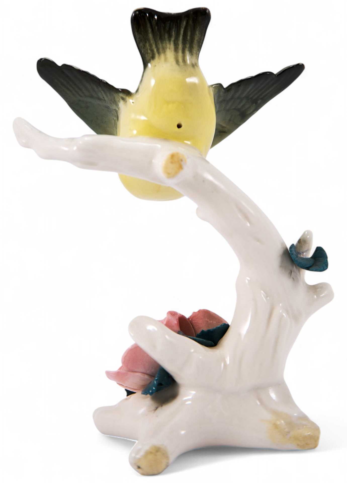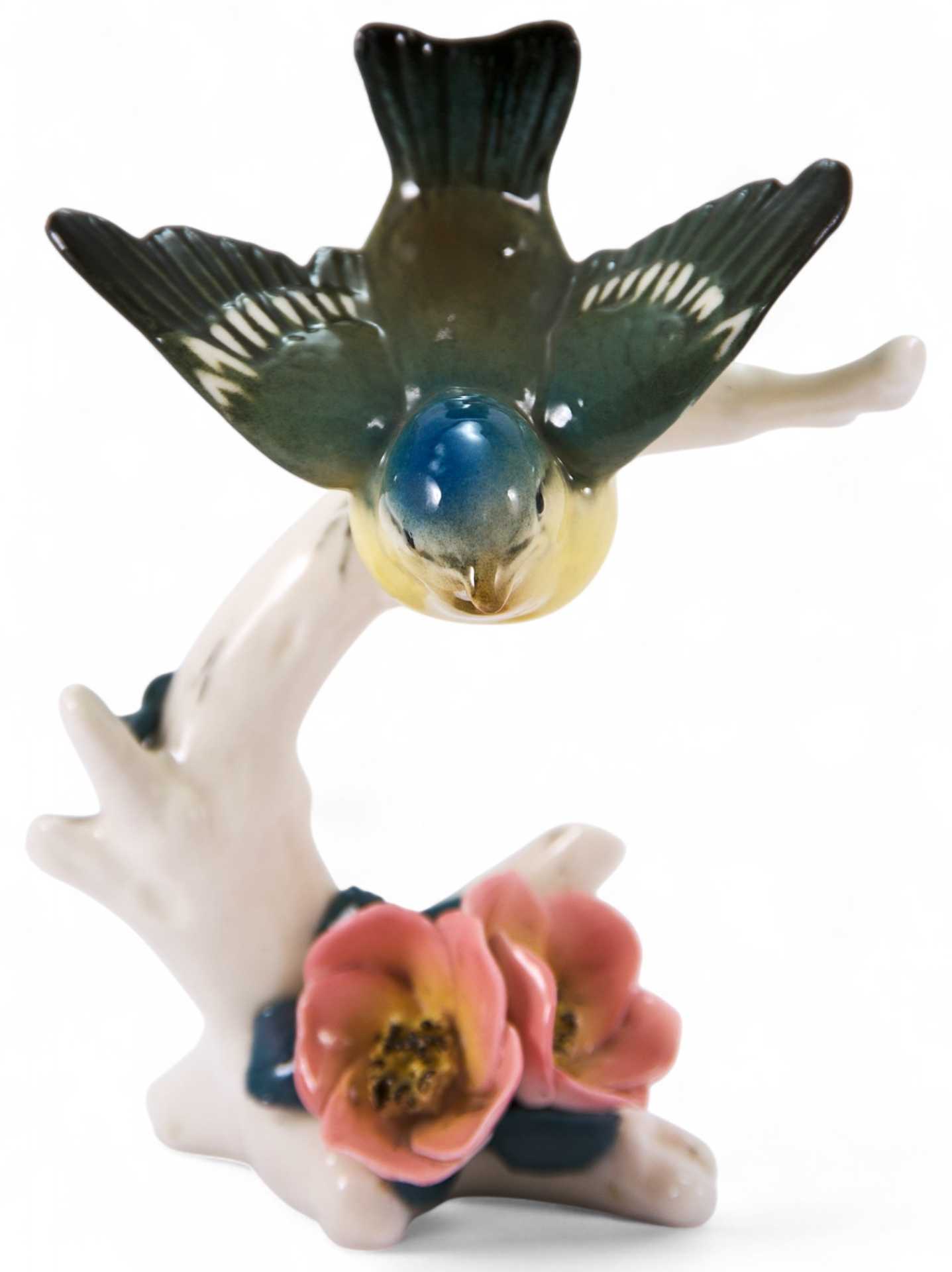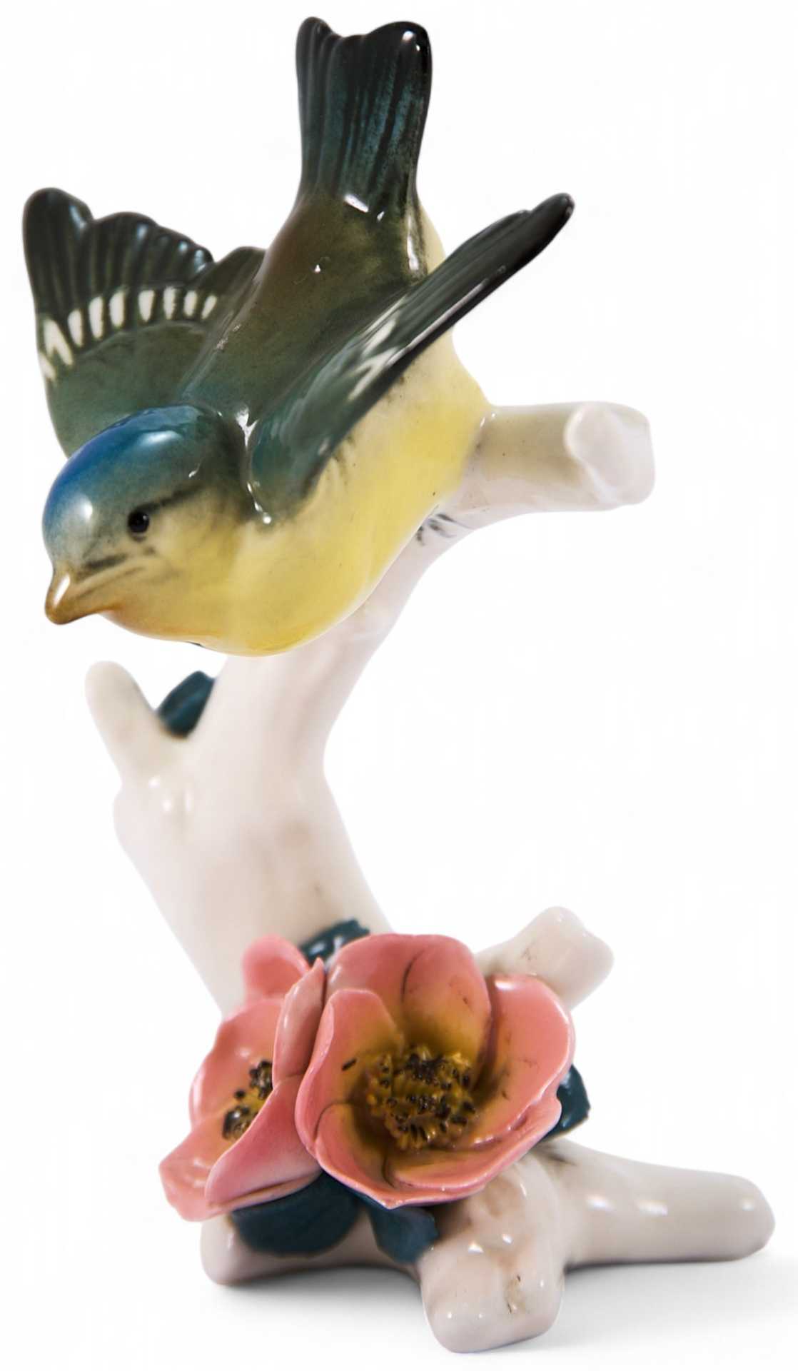 Скульптура желтобрюхой мухоловки-тоди слетающей с ветки дерева. Эта фигура относится к серии аналогичных скульптур изображающих различные виды мелких птиц. На основании скульптуры синее клеймо фарфорового завода «Karl Ens»,