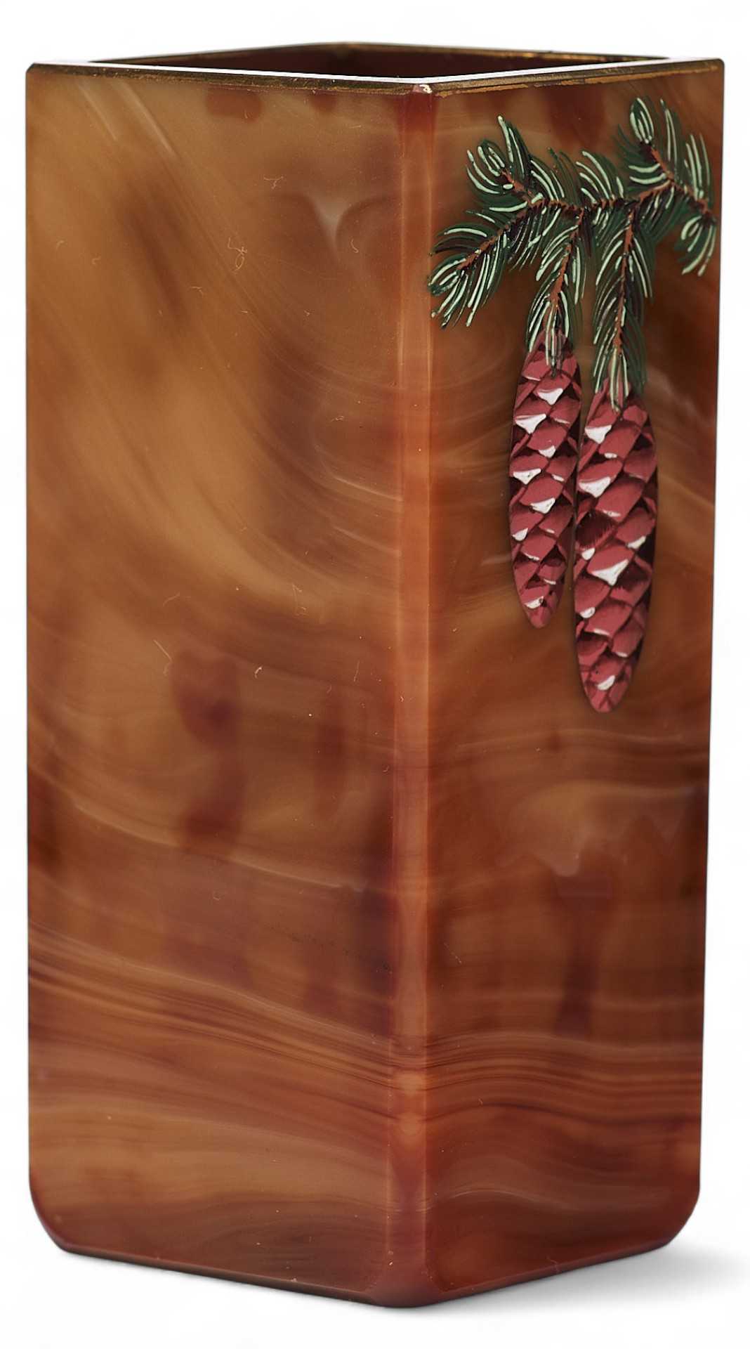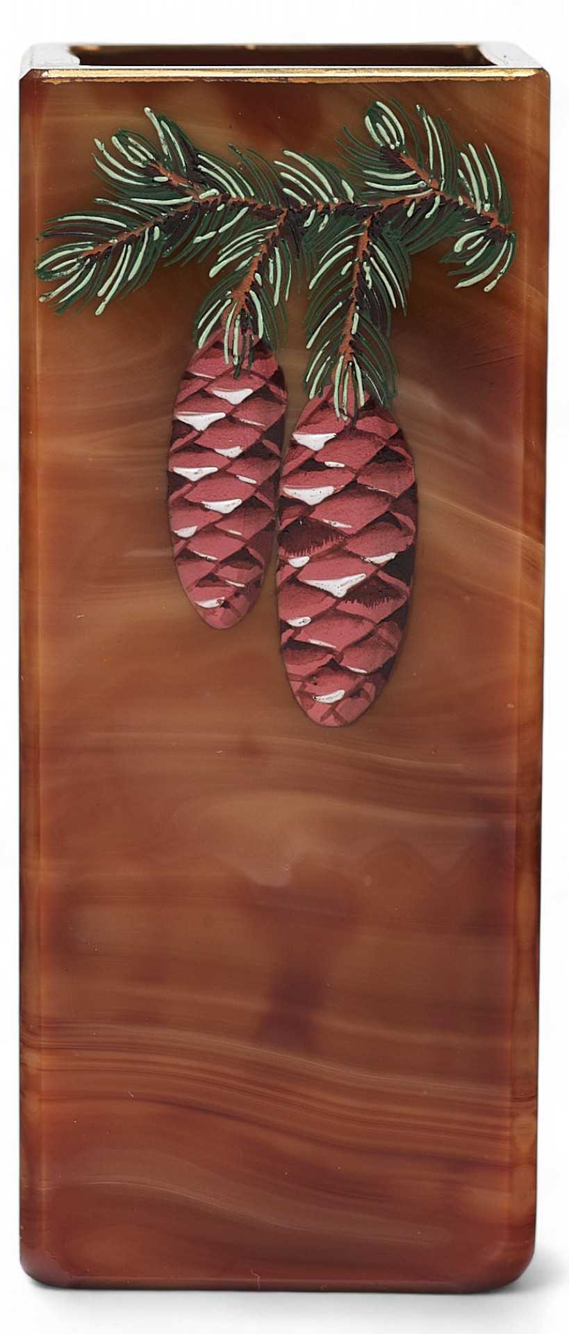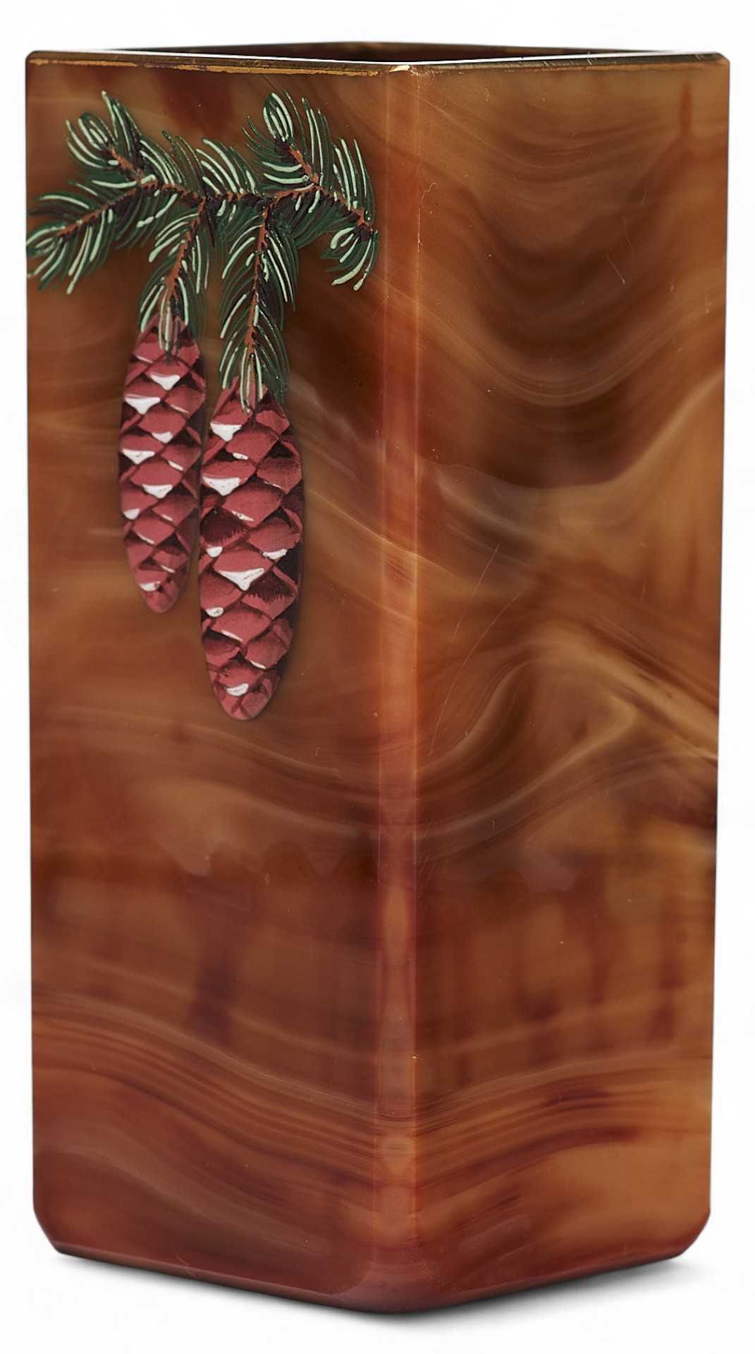 Настольная ваза из цветного стекла. Экспертное заключение Ваза украшена росписью эмалевыми красками. Края вазы позолочены. Начало росписи стекла эмалью связывается с именем знаменитого мастера и выдающегося химика Анджело Баровьеро. Изначально эмалью расписывались сосуды из цветного прозрачного стекла, позже росписью стали покрывать и