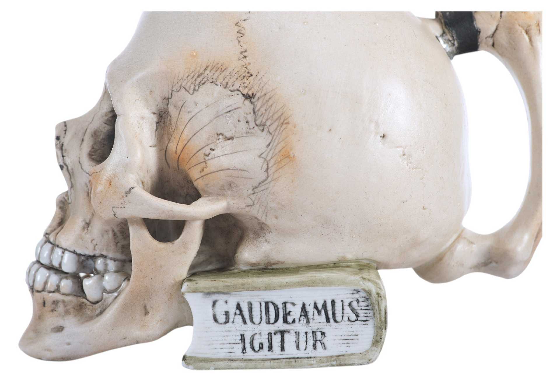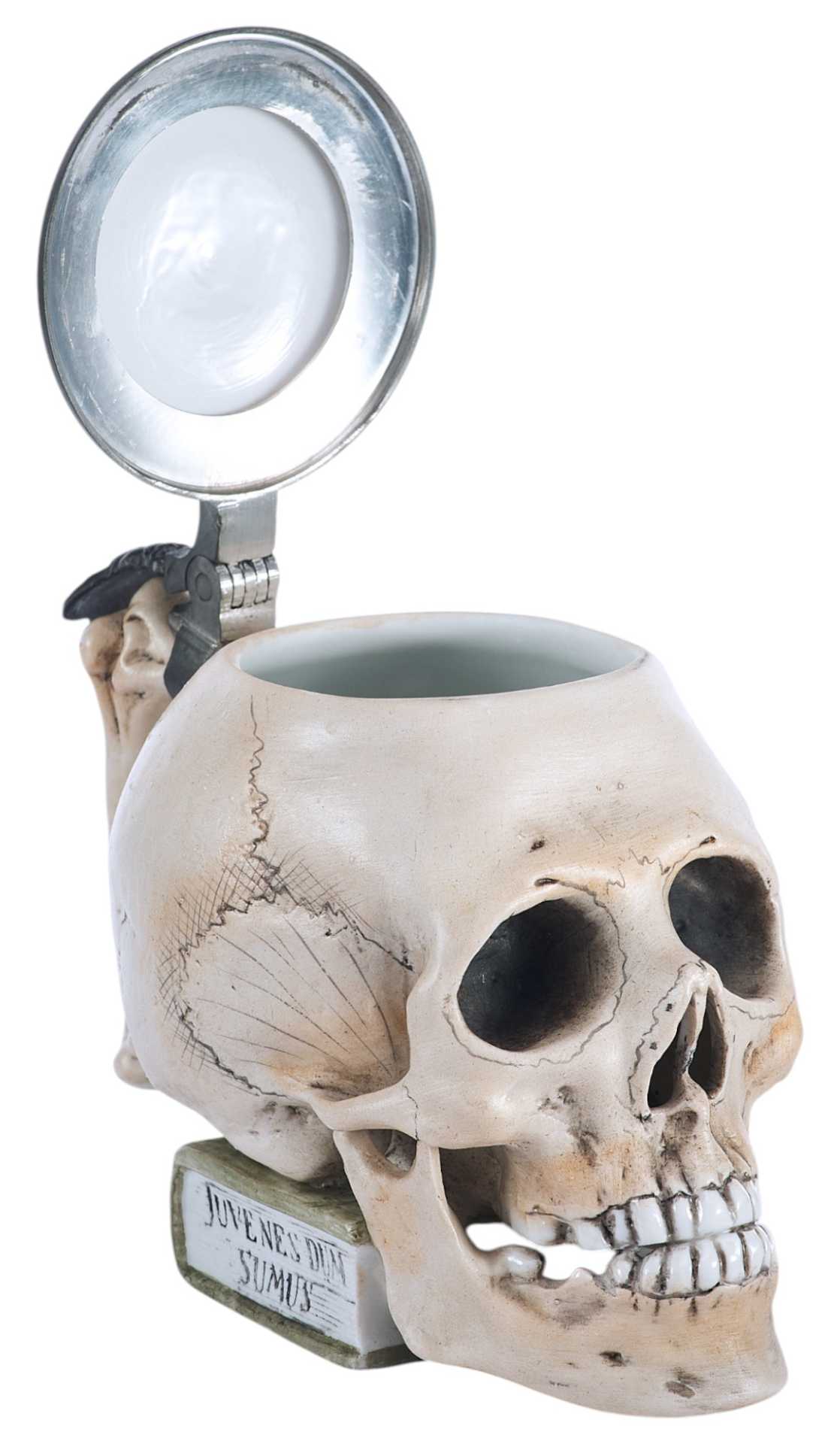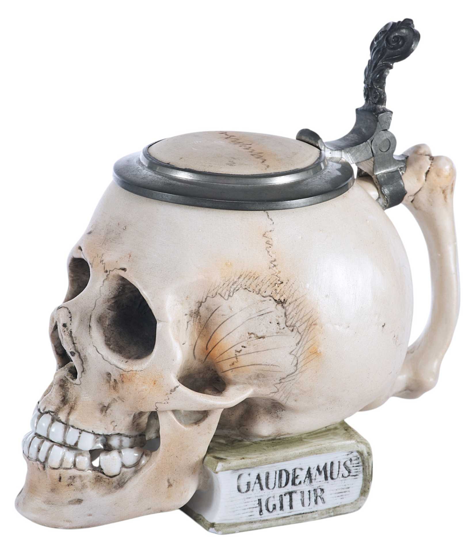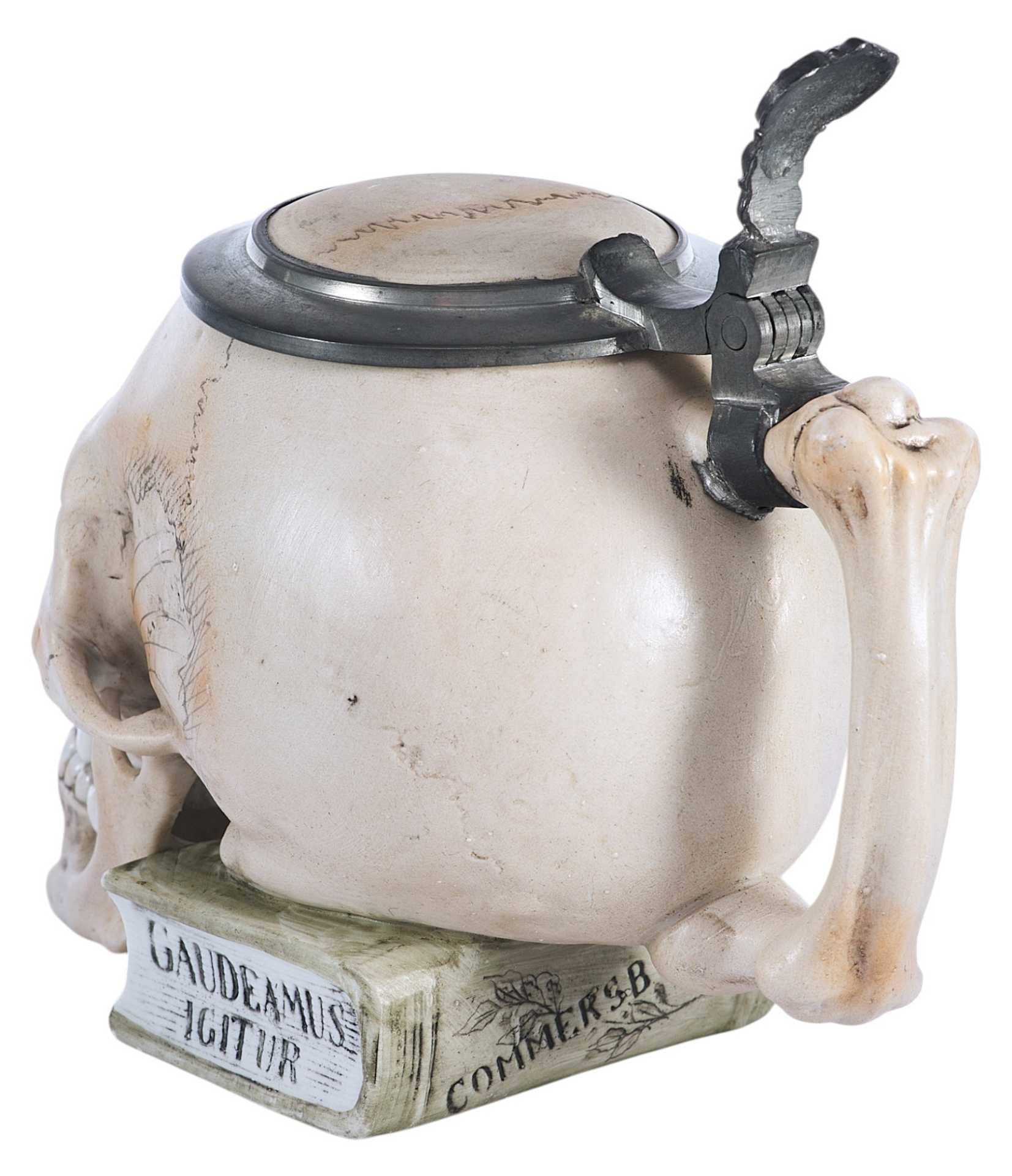 Кружка стилизованна под человеческий череп с подставкой в виде книги. На «затылке» есть ручка в виде кости; верхняя часть черепа с металлической окантовкой является крышкой с упором для пальца. Череп выполнен анатомически достоверно, тщательно проработаны детали, аккуратно выполнена роспись. На верхних обрезах есть надпись, с двух сторон «Gaudeamus igitur», «Juvenes dum sumus», что в переводе с латыни означает «Будем веселиться, пока мы молоды!».