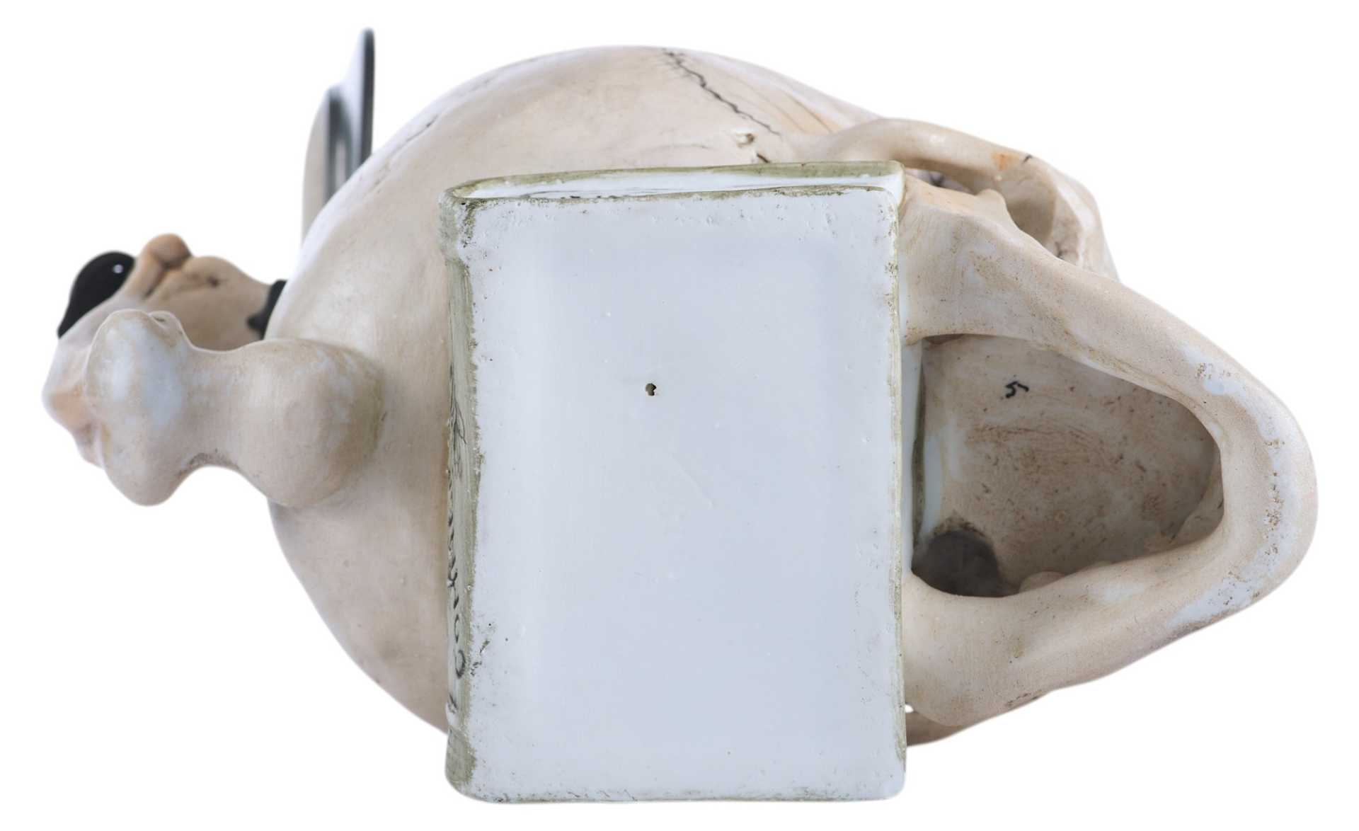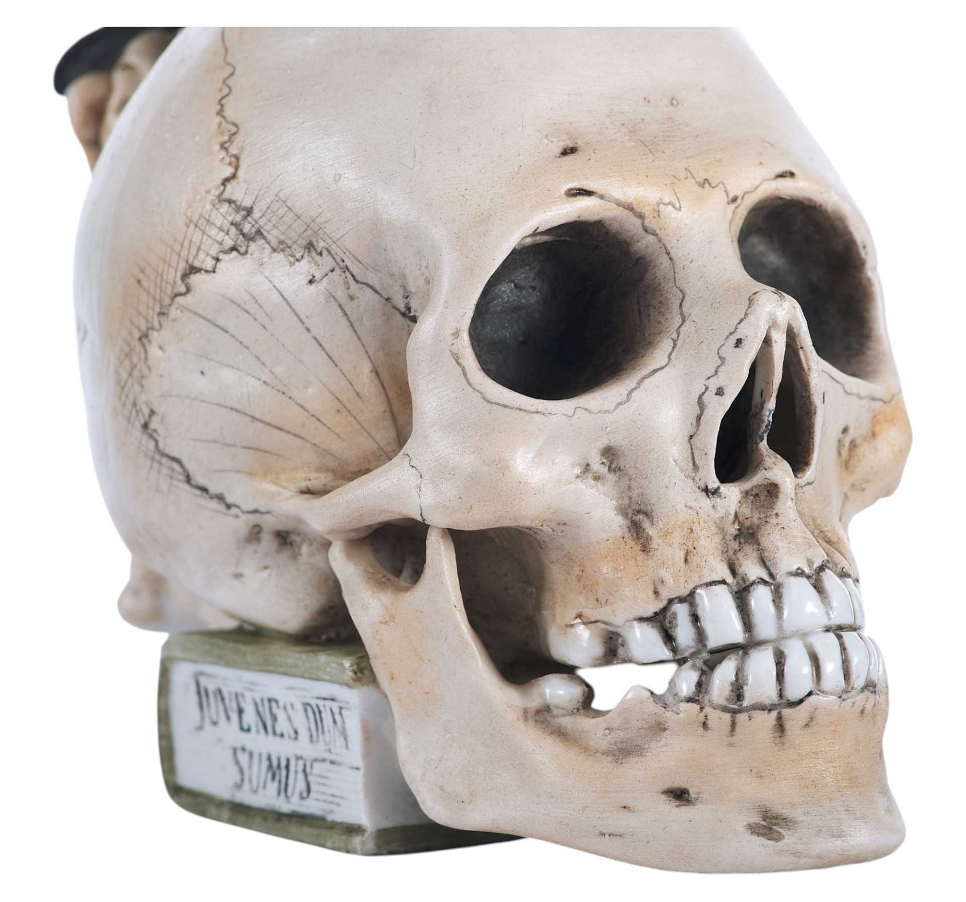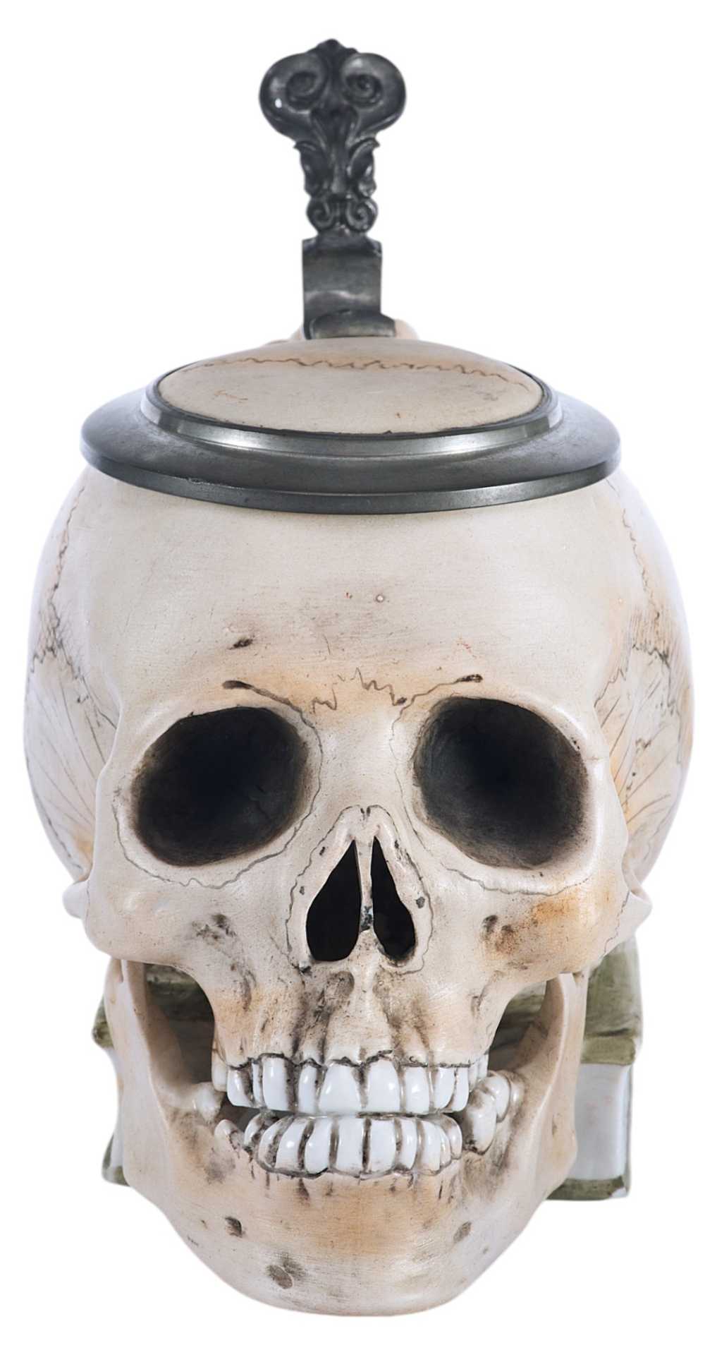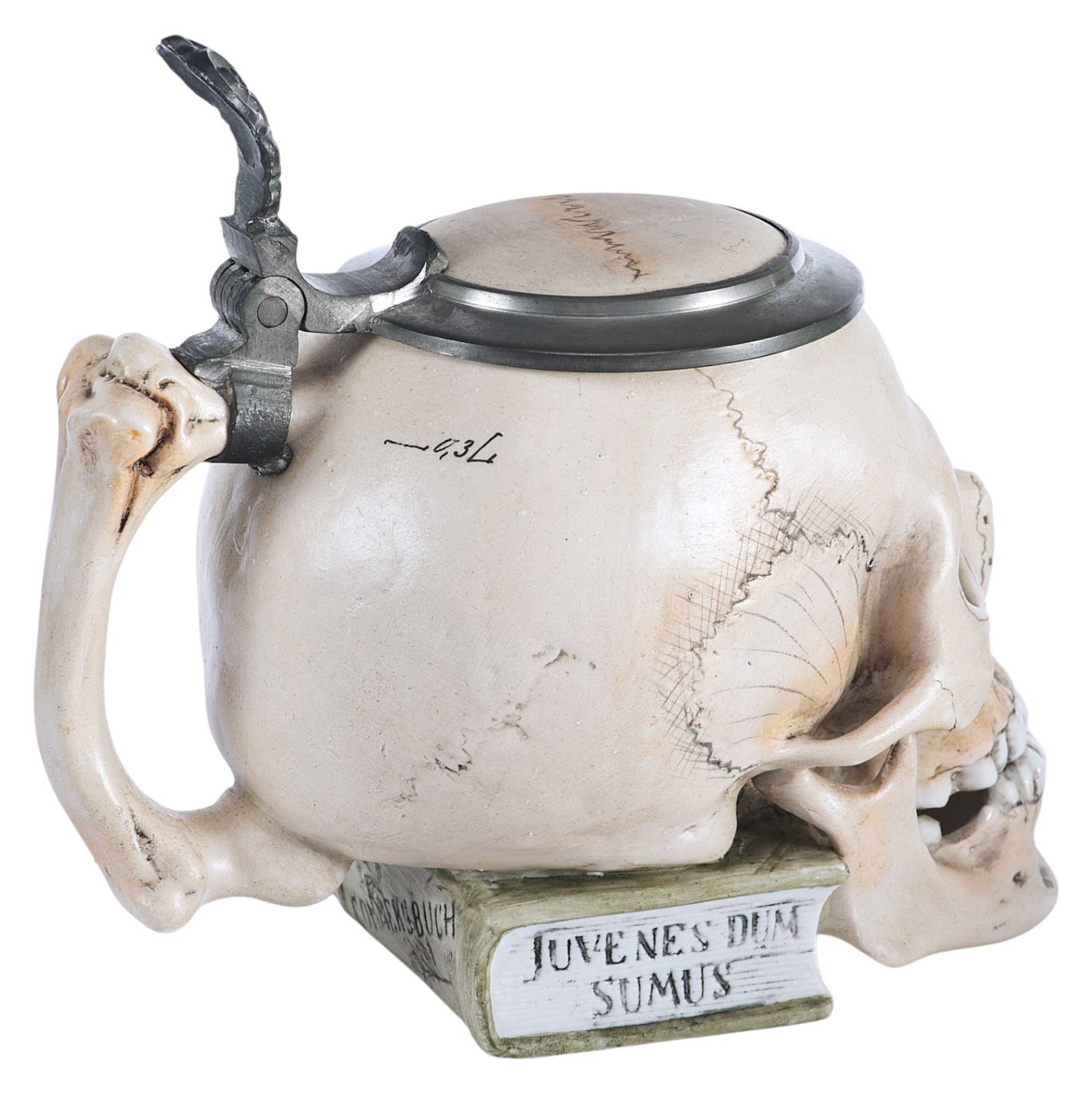 Кружка стилизованна под человеческий череп с подставкой в виде книги. На «затылке» есть ручка в виде кости; верхняя часть черепа с металлической окантовкой является крышкой с упором для пальца. Череп выполнен анатомически достоверно, тщательно проработаны детали, аккуратно выполнена роспись. На верхних обрезах есть надпись, с двух сторон «Gaudeamus igitur», «Juvenes dum sumus», что в переводе с латыни означает «Будем веселиться, пока мы молоды!».