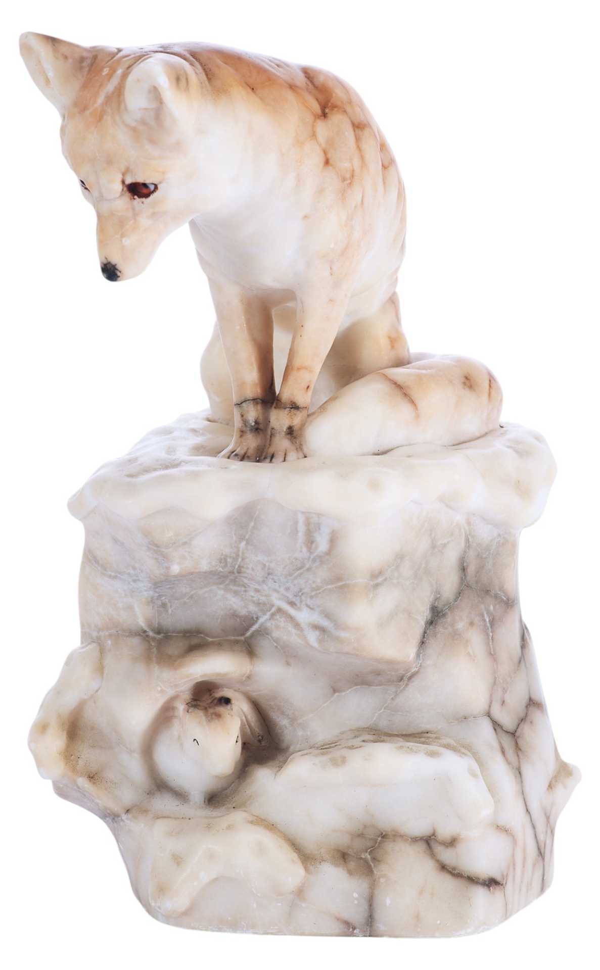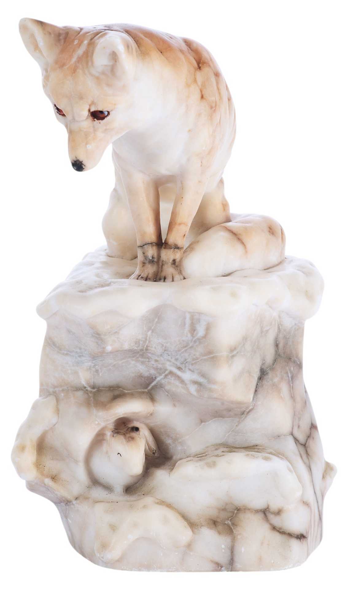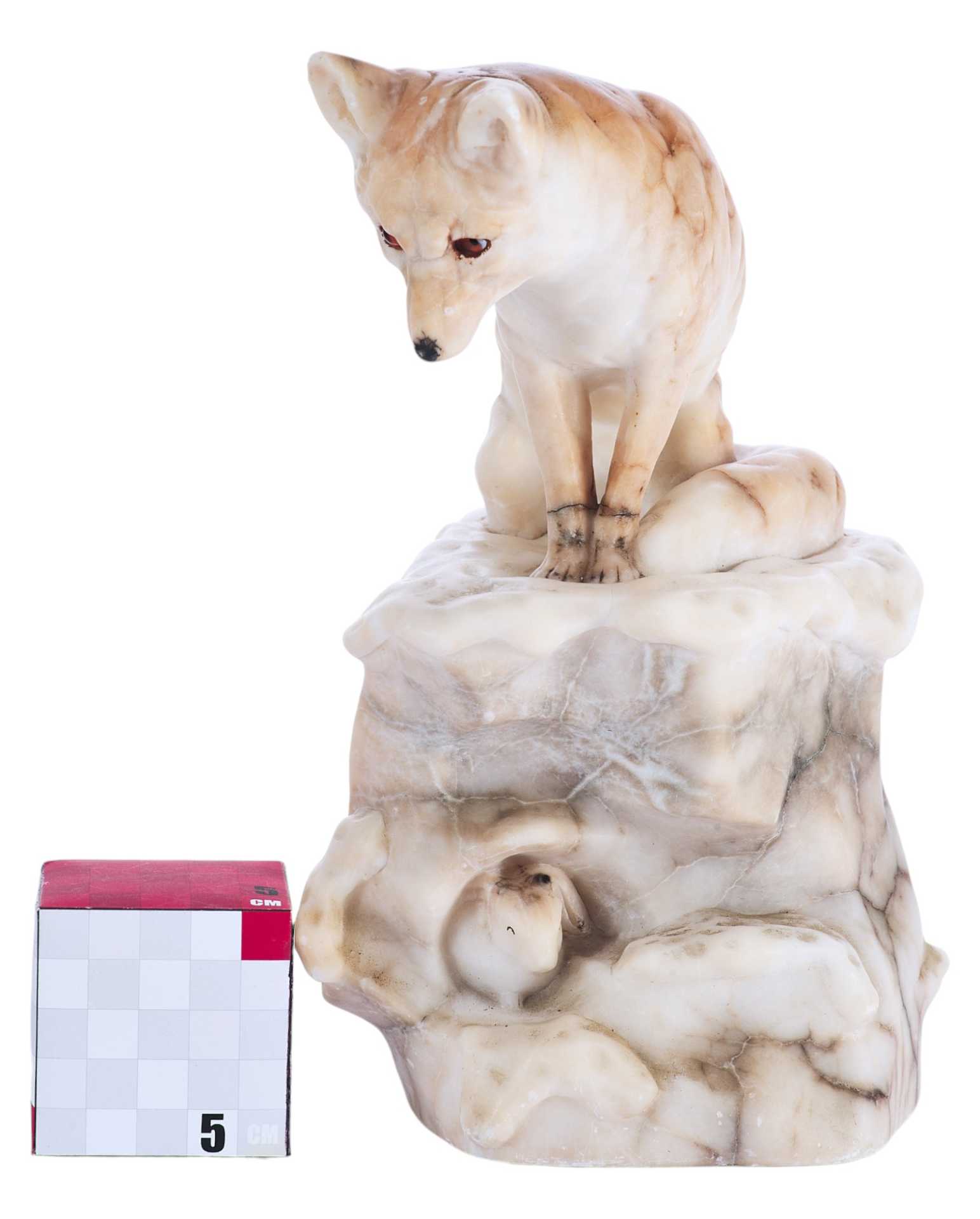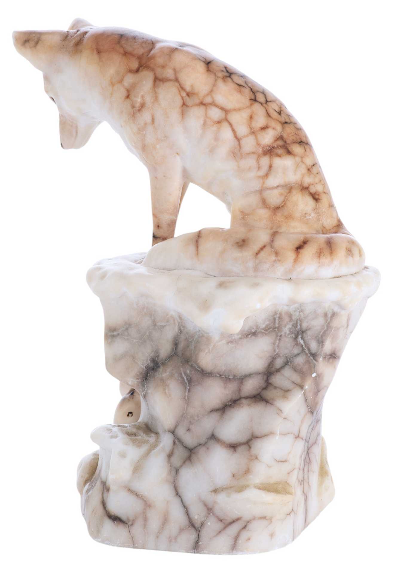 На дне статуэтки присутствуют клеймо: круглый бронзовый медальон с изображением герба над словом «Kochendörfer», и пущенная по кругу надпись: «Original Hofkunstanstalt / Medaille F. Kunst. München 1891». Скульптурная композиция представляет собой реалистическое изображение лисы, сидящей на уступе и напряженно высматривающей свою добычу.