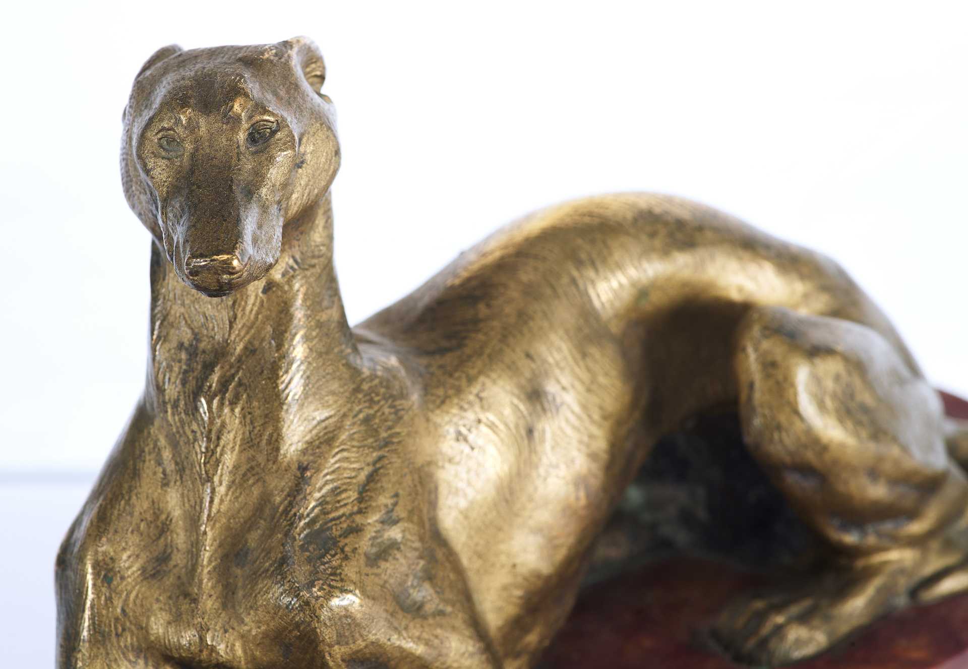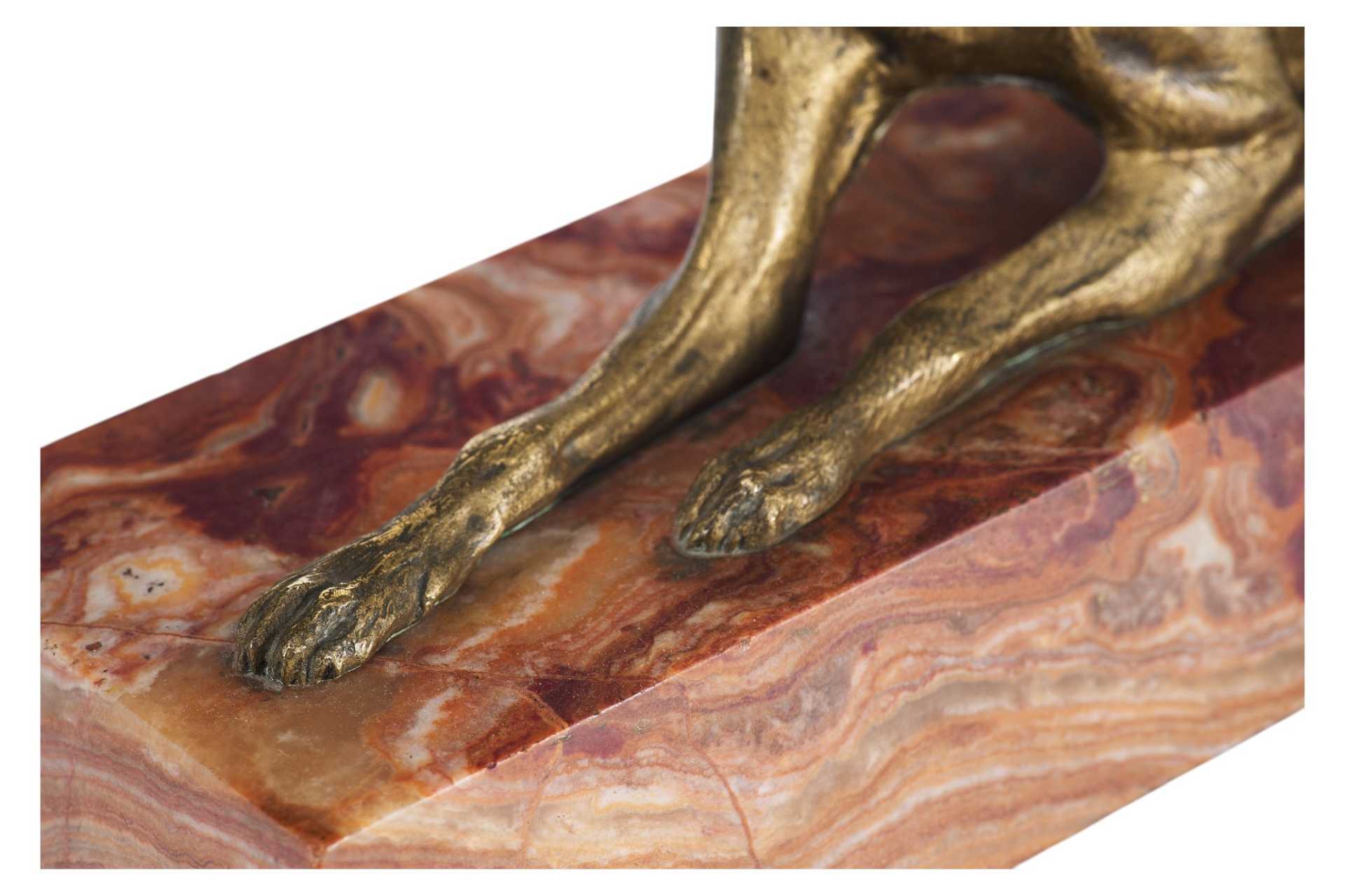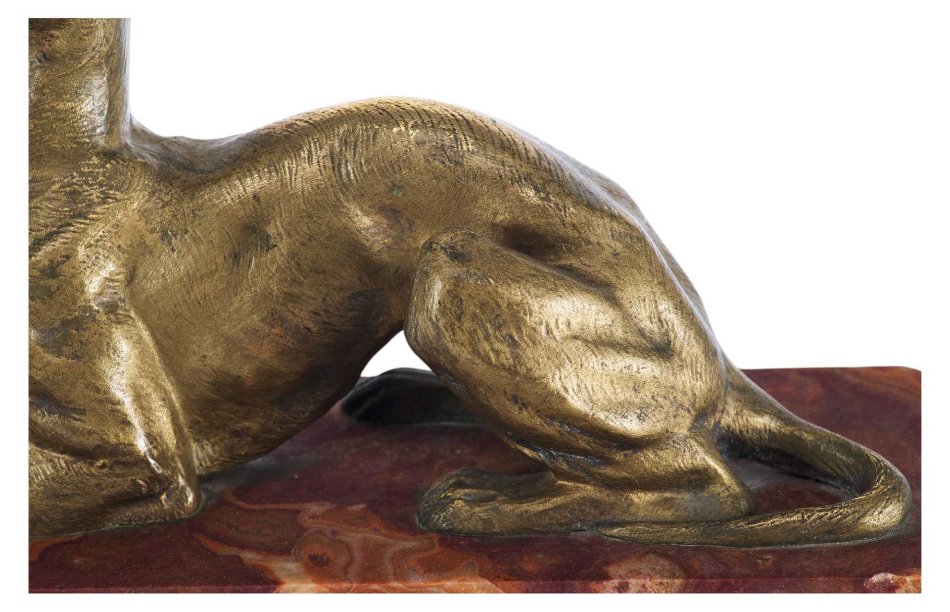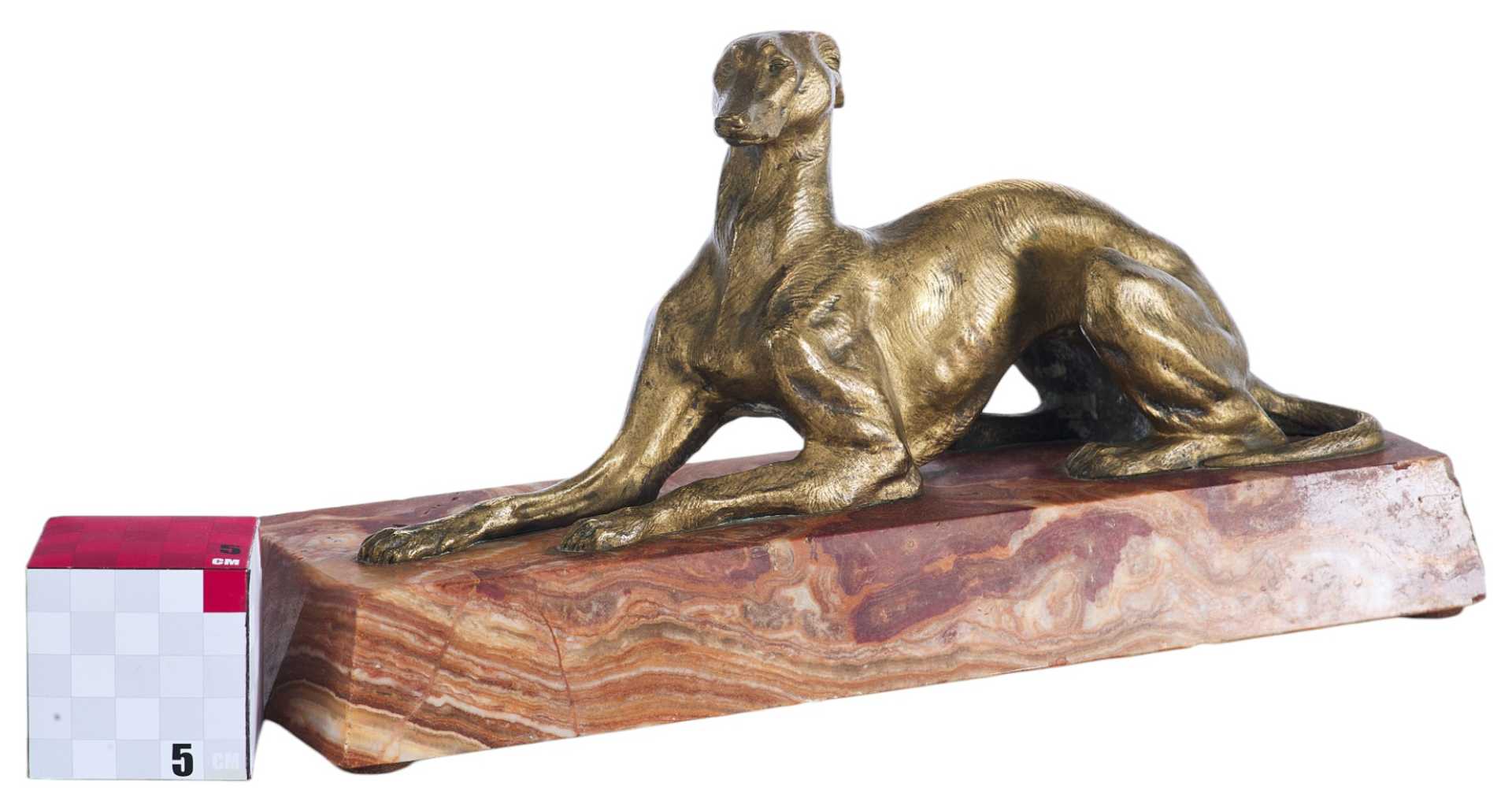 Представленная композиция выполнена в стилистике ар-деко на анималистический сюжет. Изображена лежащая собака породы «борзая», поставленная на массивное мраморное основание. Борзые собаки - группа пород охотничьих ловчих собак, для безружейной охоты (травли) на зверей. Они отличаются невероятной грациозностью и аристократической благородностью, необычные анатомические же особенности породистых борзых (изгибы фигуры и пропорциональность) привлекали внимание анималистов по всему миру. Подобная композиция, выполненная в дорогих материалах, была достойна самых лучших интерьеров, и могла служить прекрасным подарком, как любителям охоты, так и заводчикам этих великолепных животных. Технически композиция выполнена на очень хорошем уровне, по модели профессионального скульптора.
