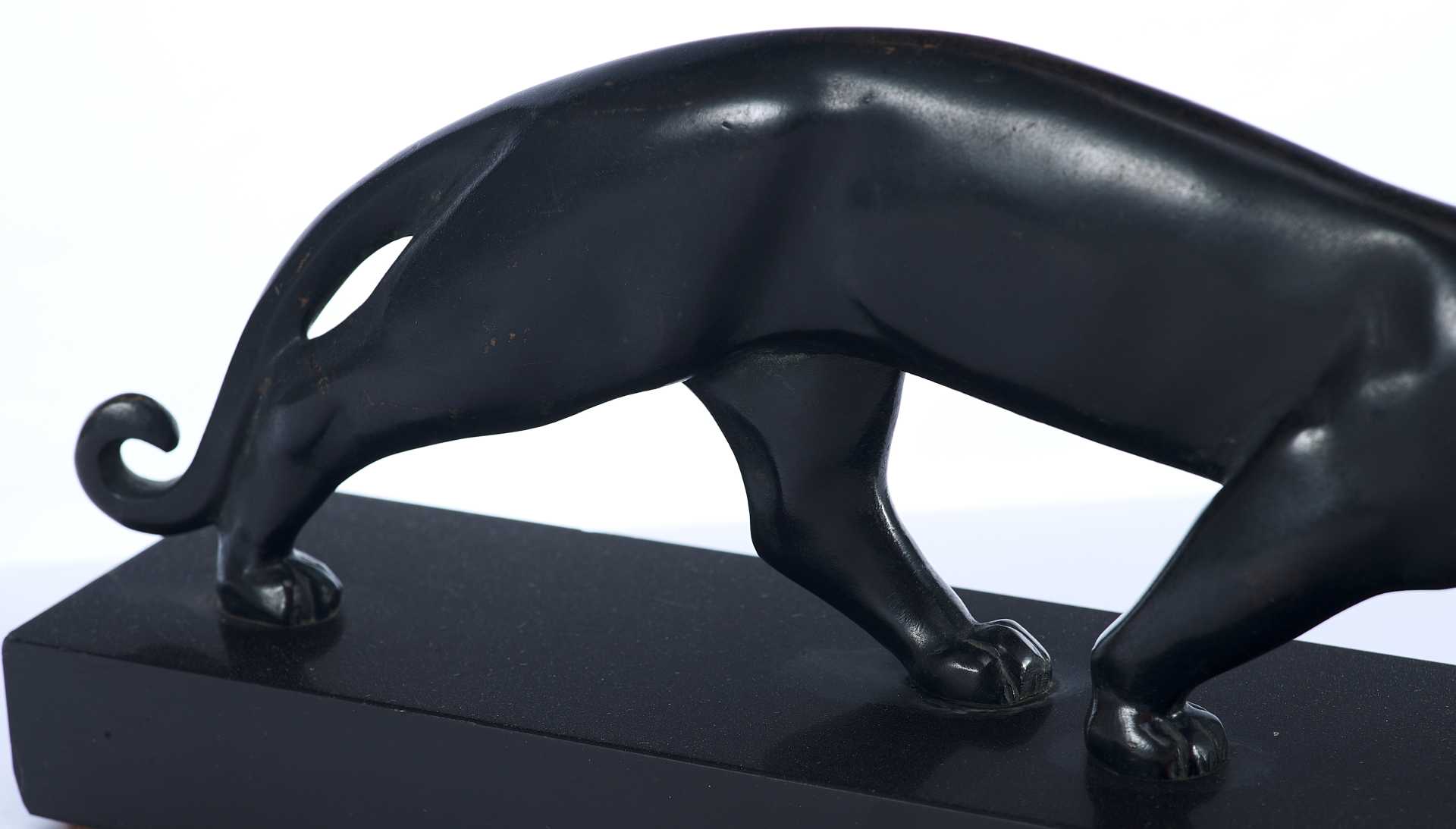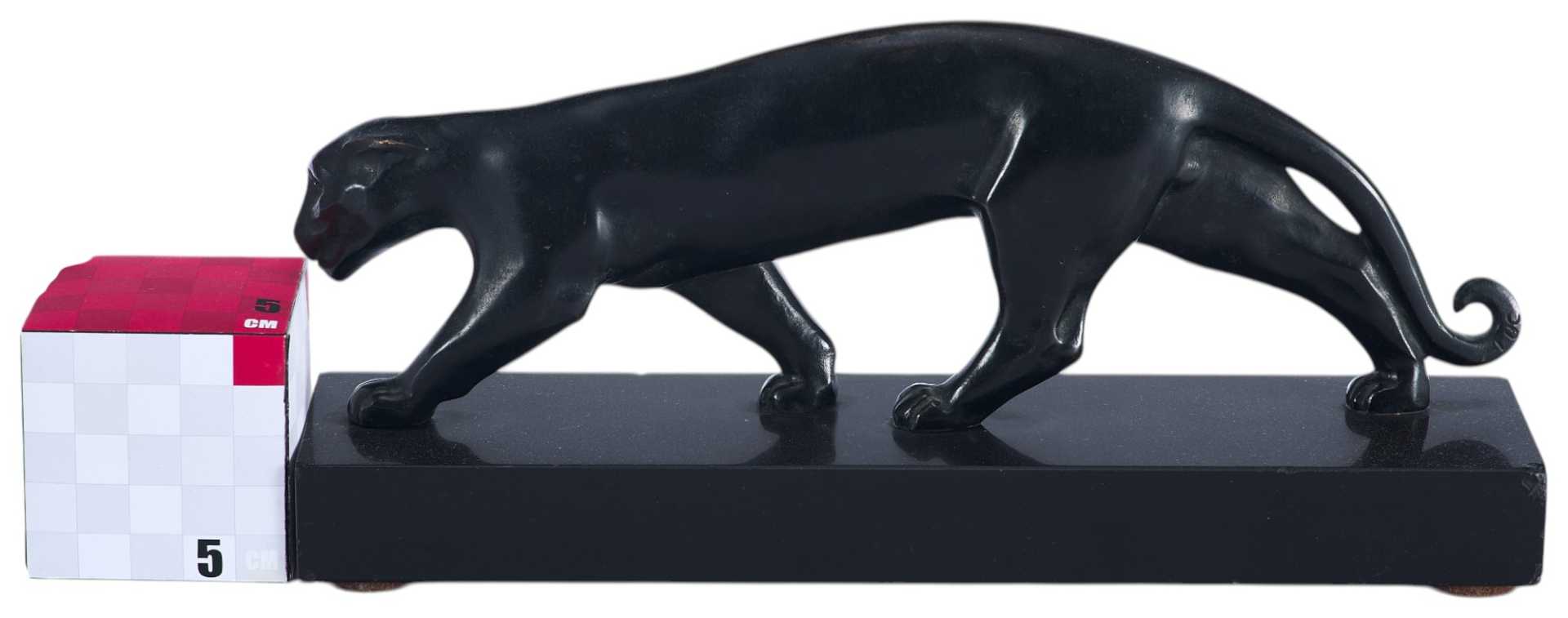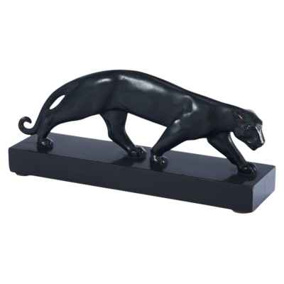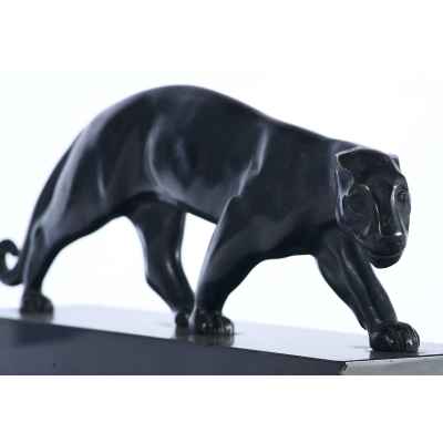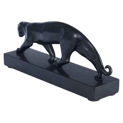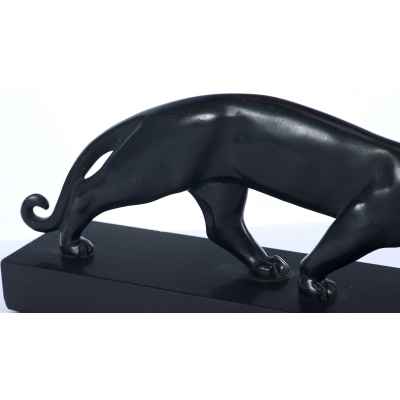 Представленная композиция выполнена в стилистике ар-деко в жанре анималистики. Скульптура небольшая по размеру, отлита из бронзы и покрыта темно-коричневой, почти черной патиной. Статуэтка поставлена на прямоугольное мраморное основание. Изображение животного стилизованное: фигура неправдоподобно узкая, если смотреть на нее анфас; в профиль же пантера практически реалистична. Силуэт обтекаемый и не детализованный, что придает композиции дополнительную утонченность и изящество; отсутствует декор, линии строгие и лаконичные. Статуэтка выполнена на хорошем техническом и художественном уровне профессиональным автором и является превосходным образцом декоративного искусства своей эпохи.