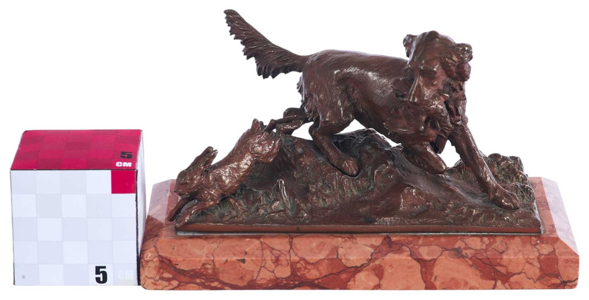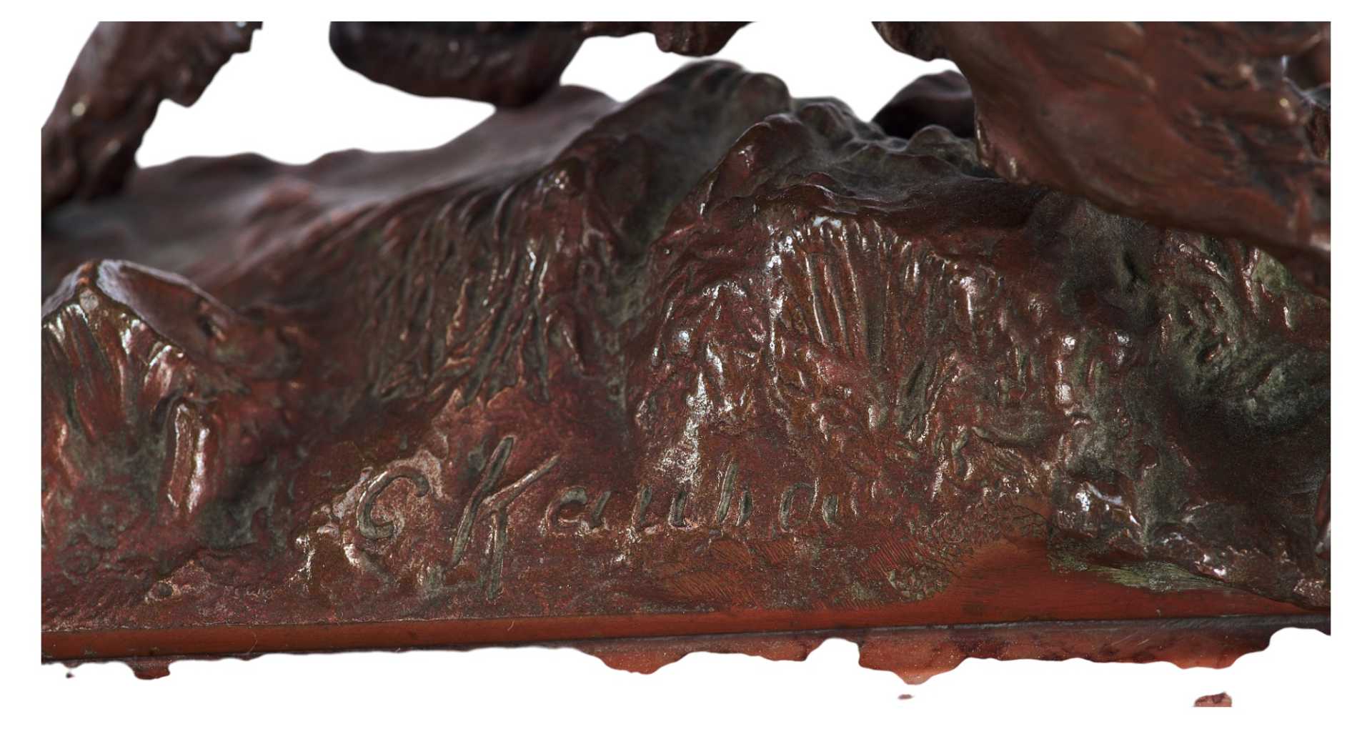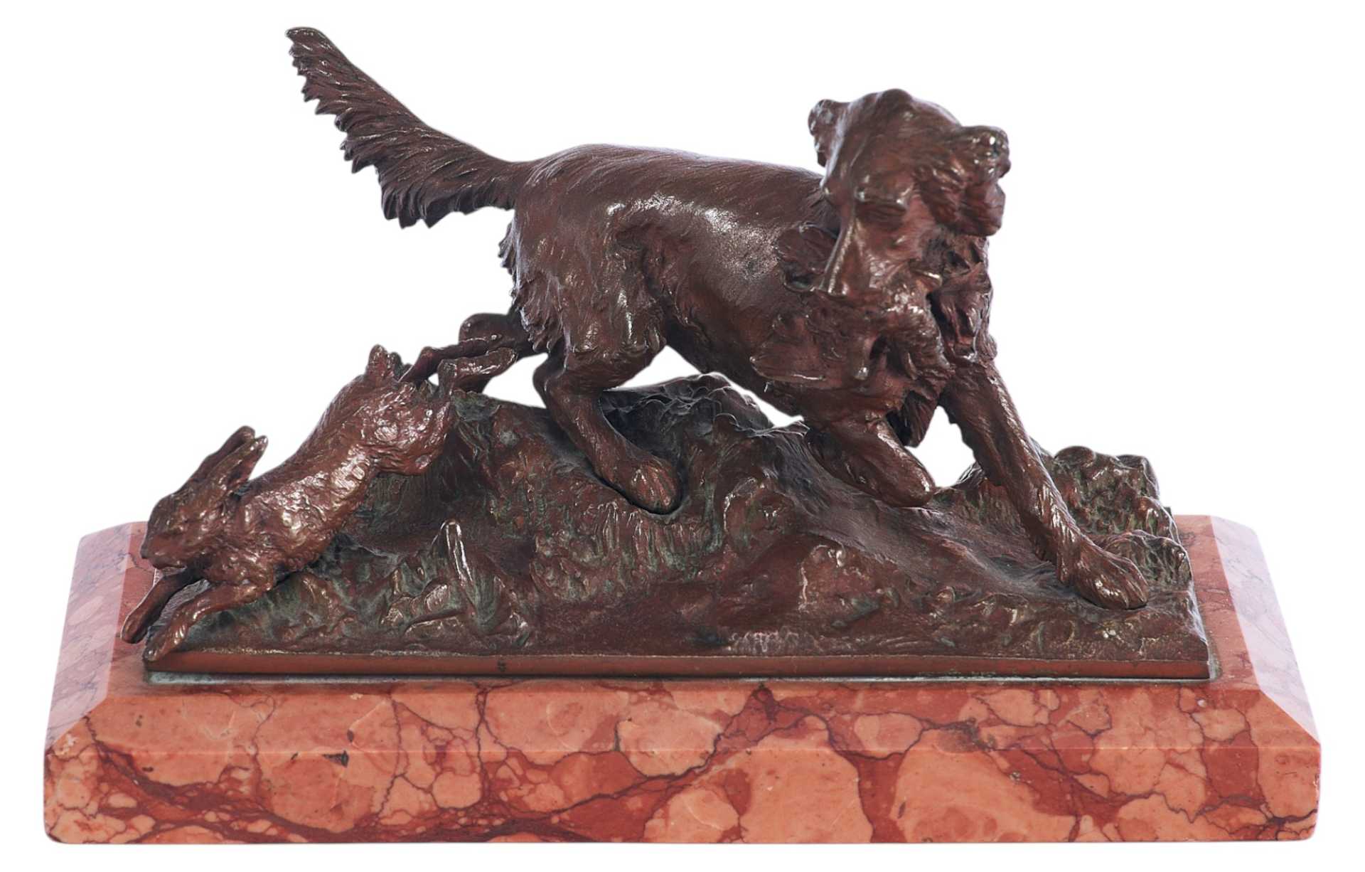 Скульптура сеттера на охоте и убегающего от него зайца. На основании скульптуры авторская подпись: «С. Kauba». Carl Kauba (1865-1922) — австрийский скульптор, анималист, жанрист. Карл Кауба родился 13 августа 1865 в Вене, Австрия. Сын сапожника, Кауба решил следовать своему призванию в искусстве. «Визитной карточкой» его произведений была тема