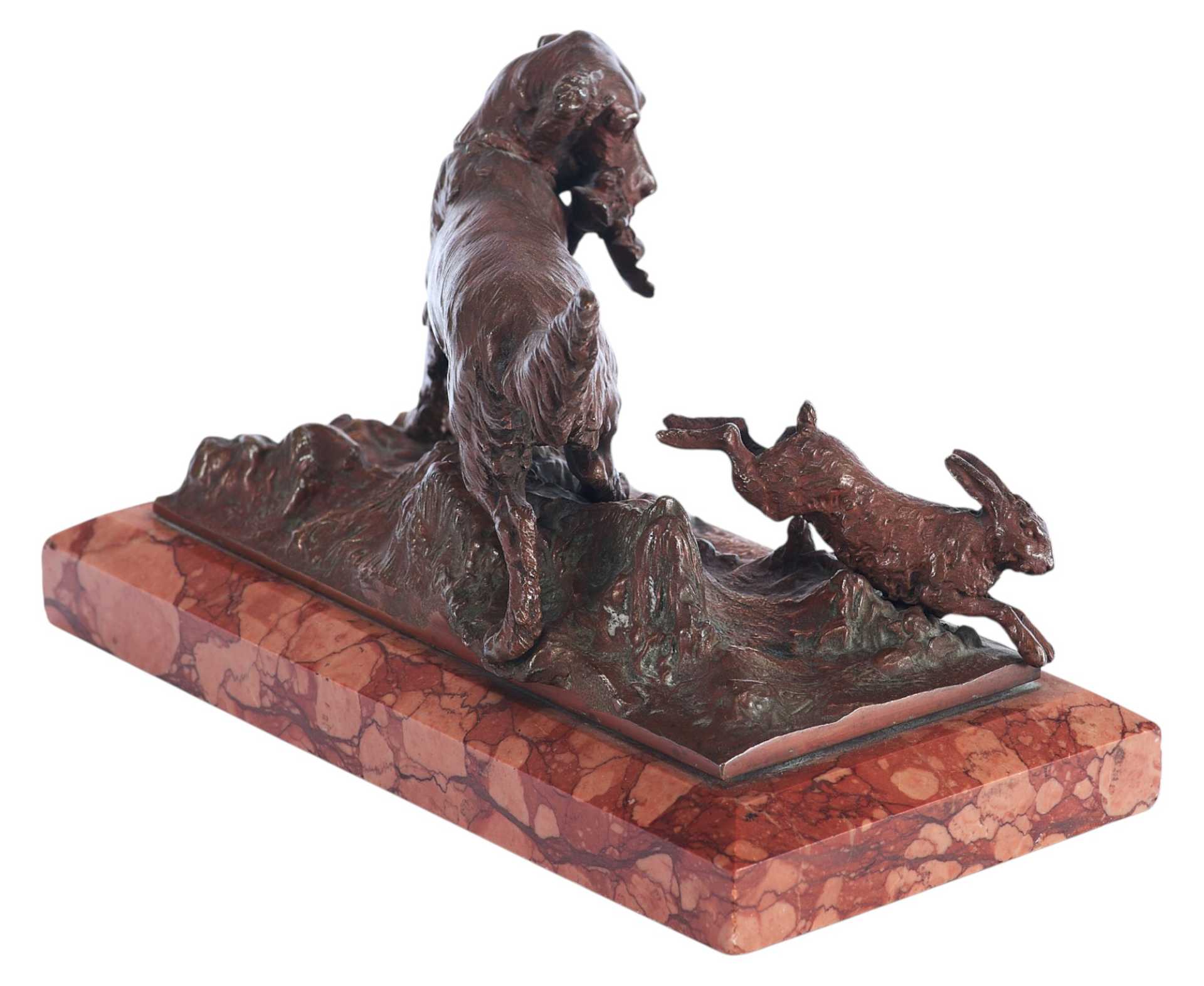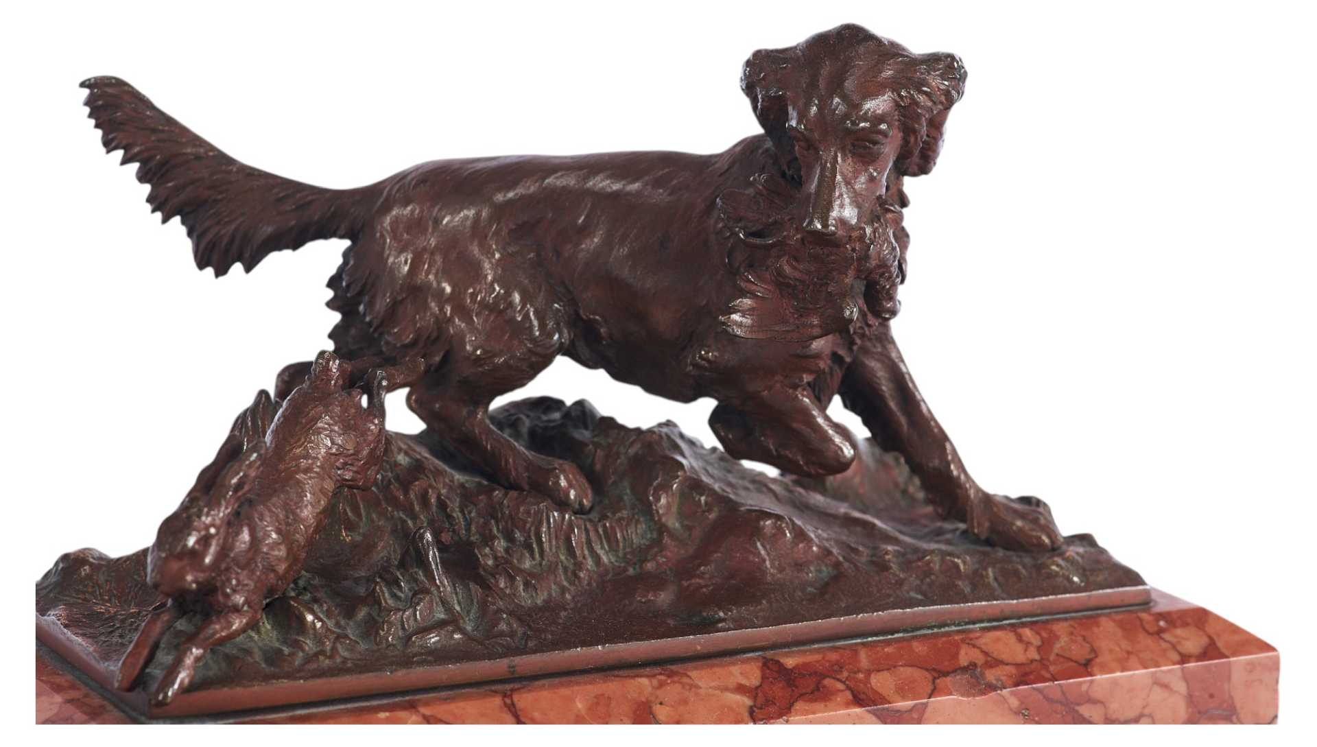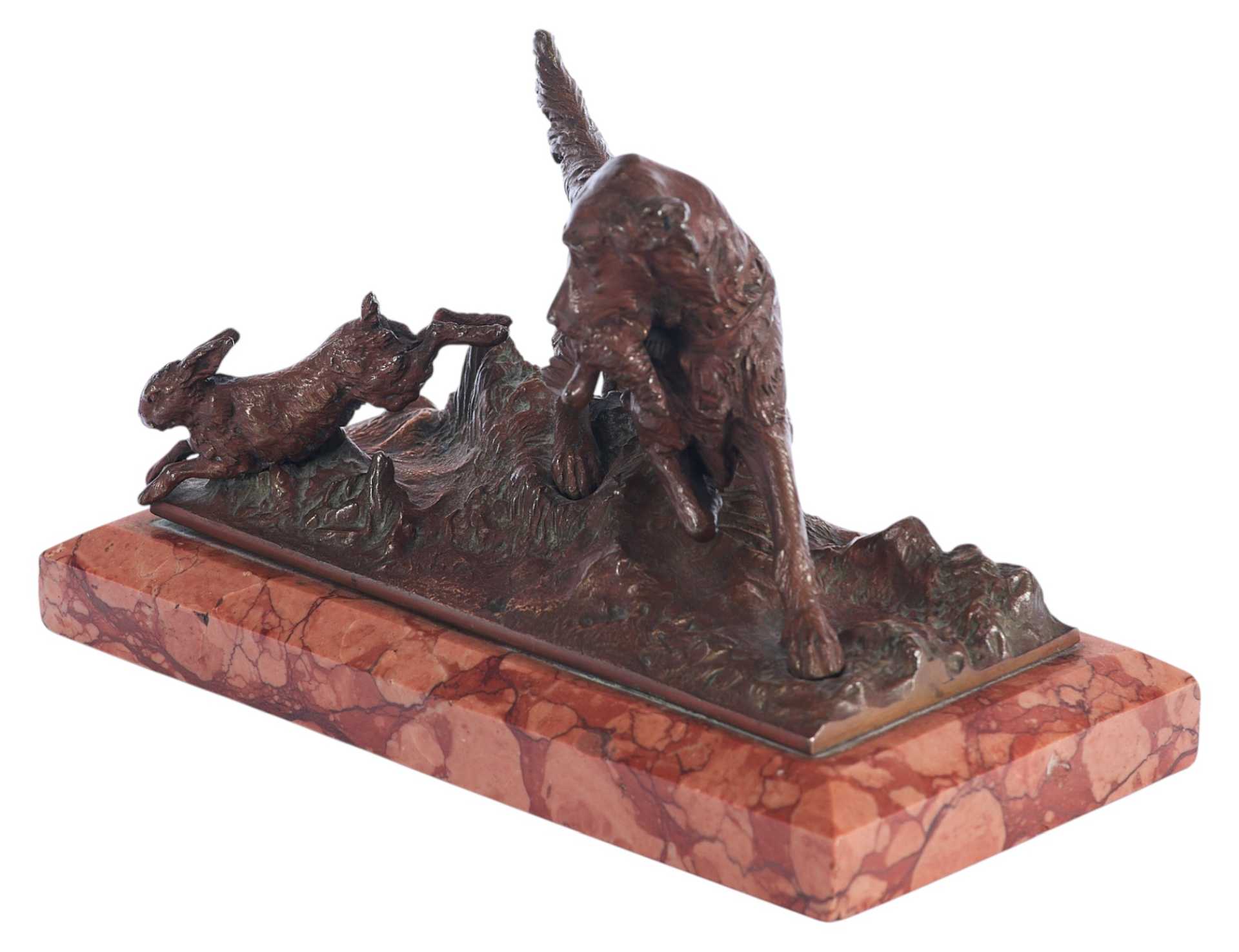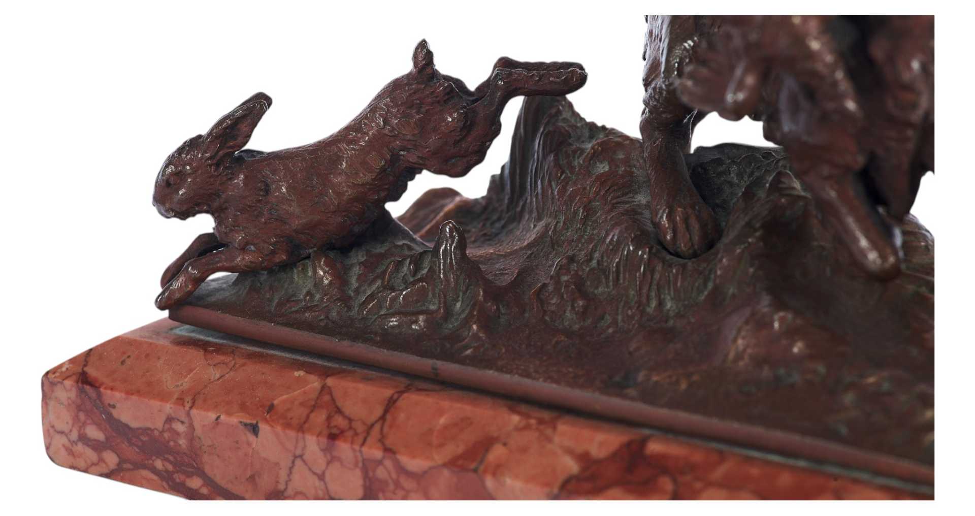 Скульптура сеттера на охоте и убегающего от него зайца. На основании скульптуры авторская подпись: «С. Kauba». Carl Kauba (1865-1922) — австрийский скульптор, анималист, жанрист. Карл Кауба родился 13 августа 1865 в Вене, Австрия. Сын сапожника, Кауба решил следовать своему призванию в искусстве. «Визитной карточкой» его произведений была тема