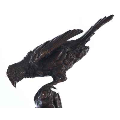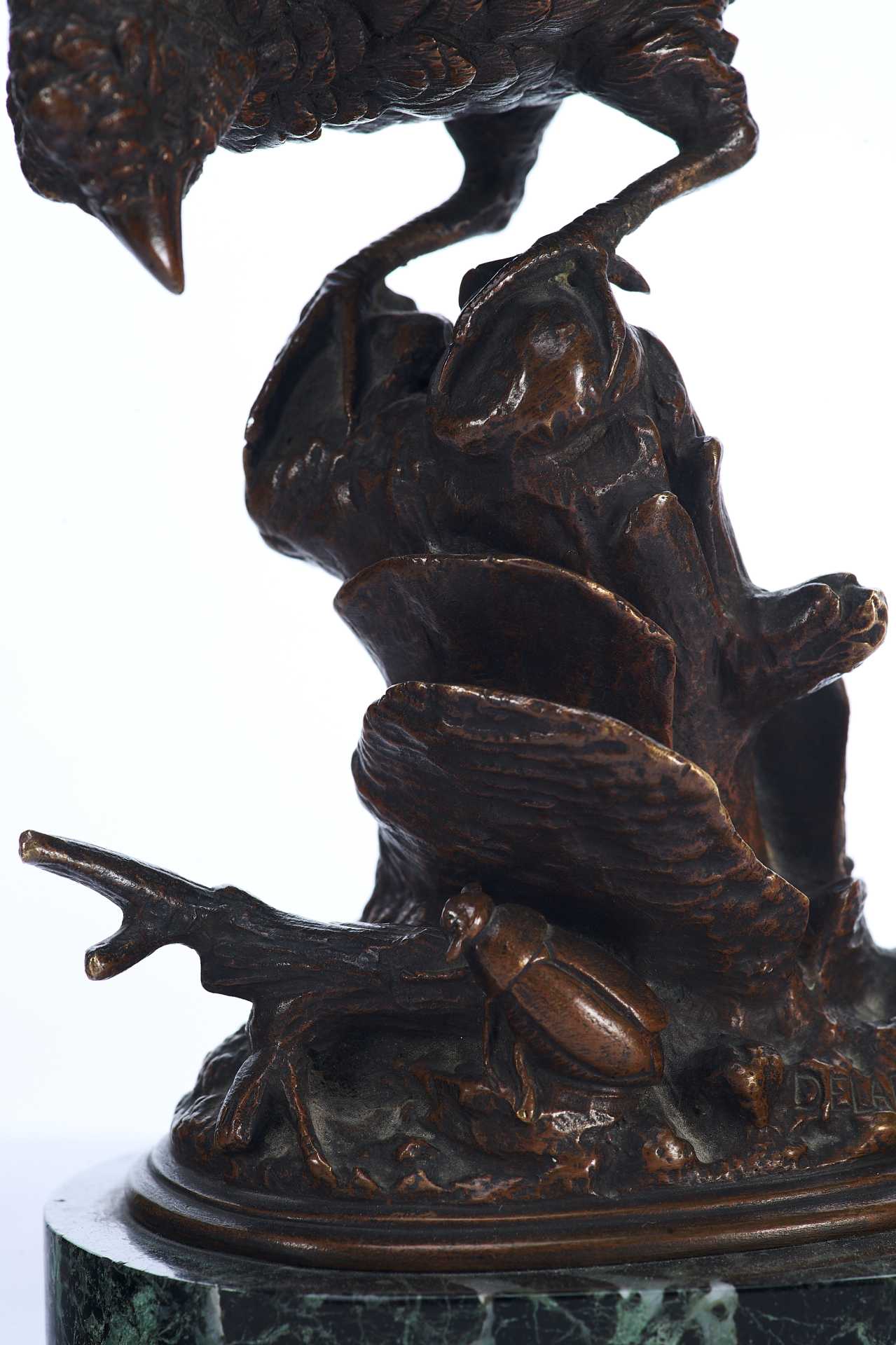 Представленная композиция выполнена в анималистическом жанре академической традиции ХЕХ века и изображает птицу, сидящую на древесной ветке и наблюдающую за жуком. Фигура птицы реалистична, детально проработана фактура перьев, лапки, клюв. В целом композиция является превосходным образцом своего жанра, отливка произведена на высоком уровне. На основании скульптуры присутствует марка автора (в массе): «DELABRIERRE».