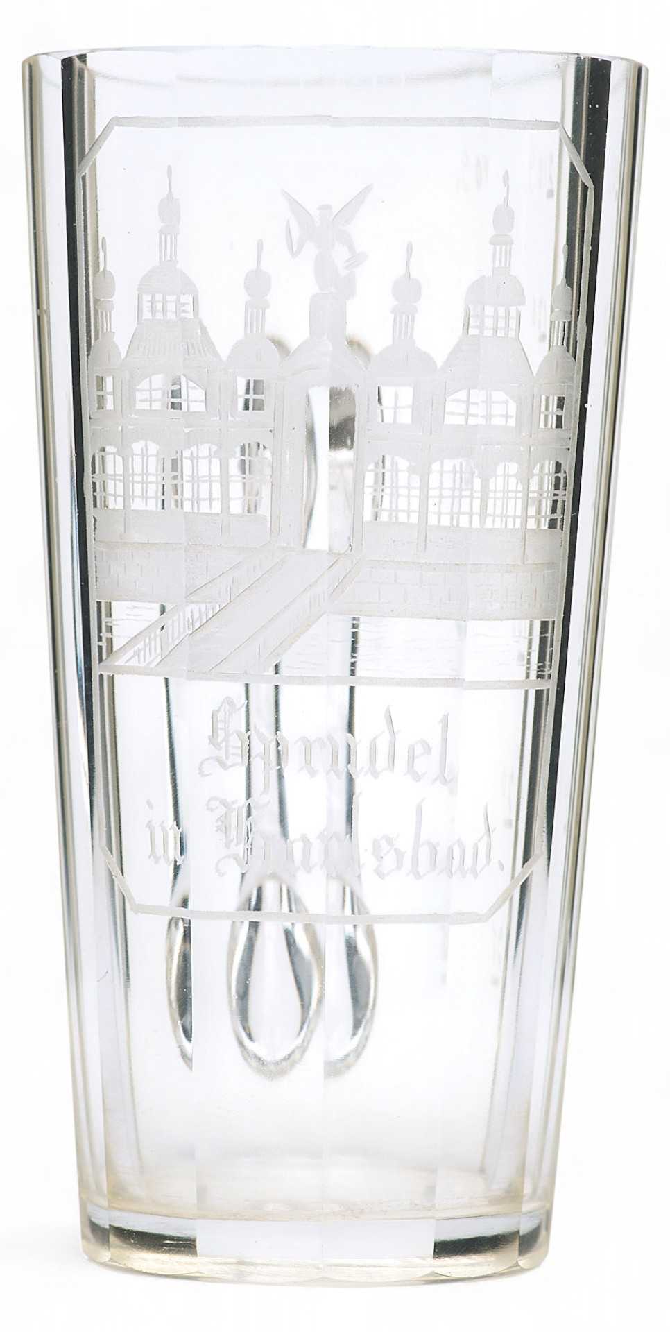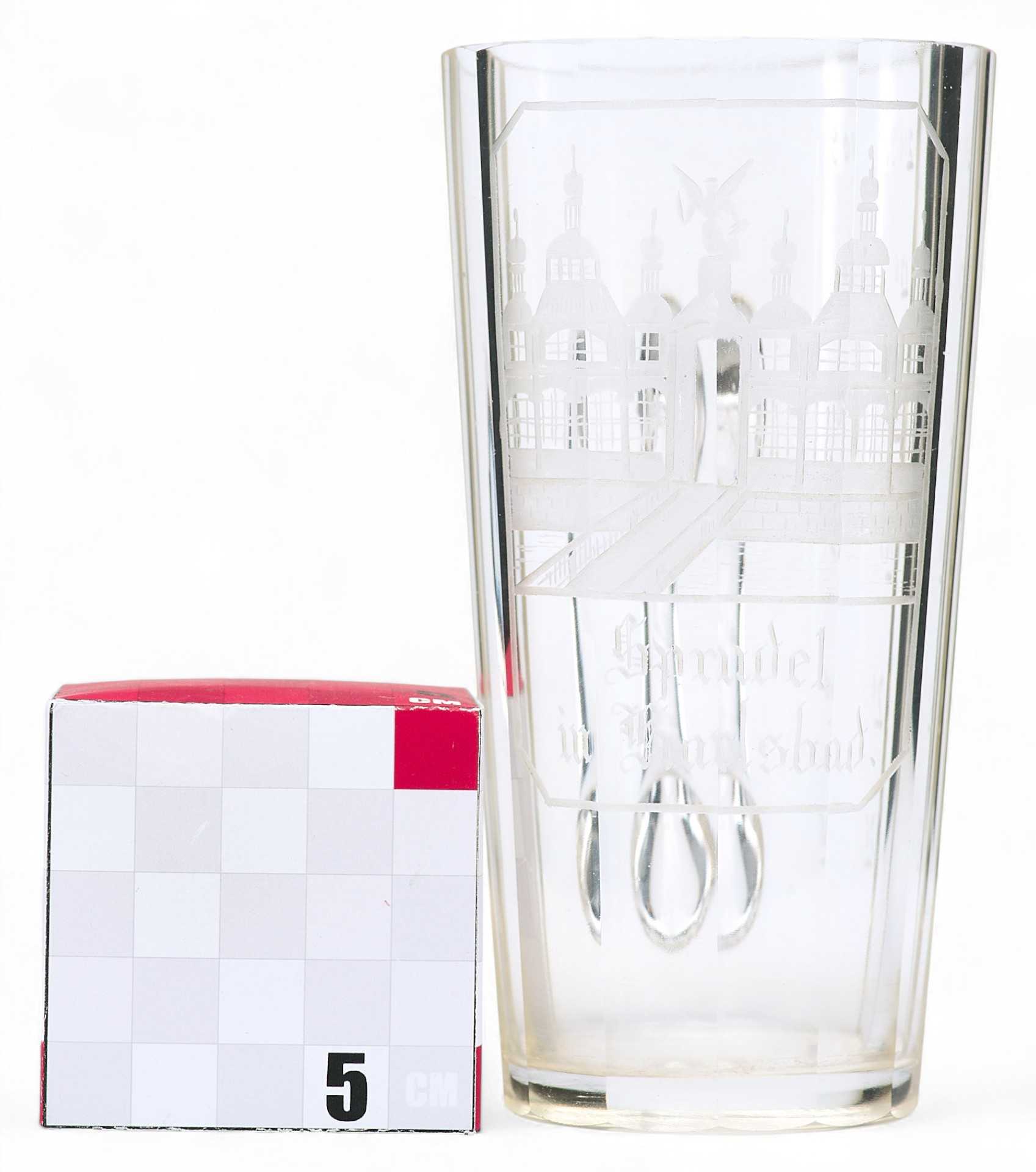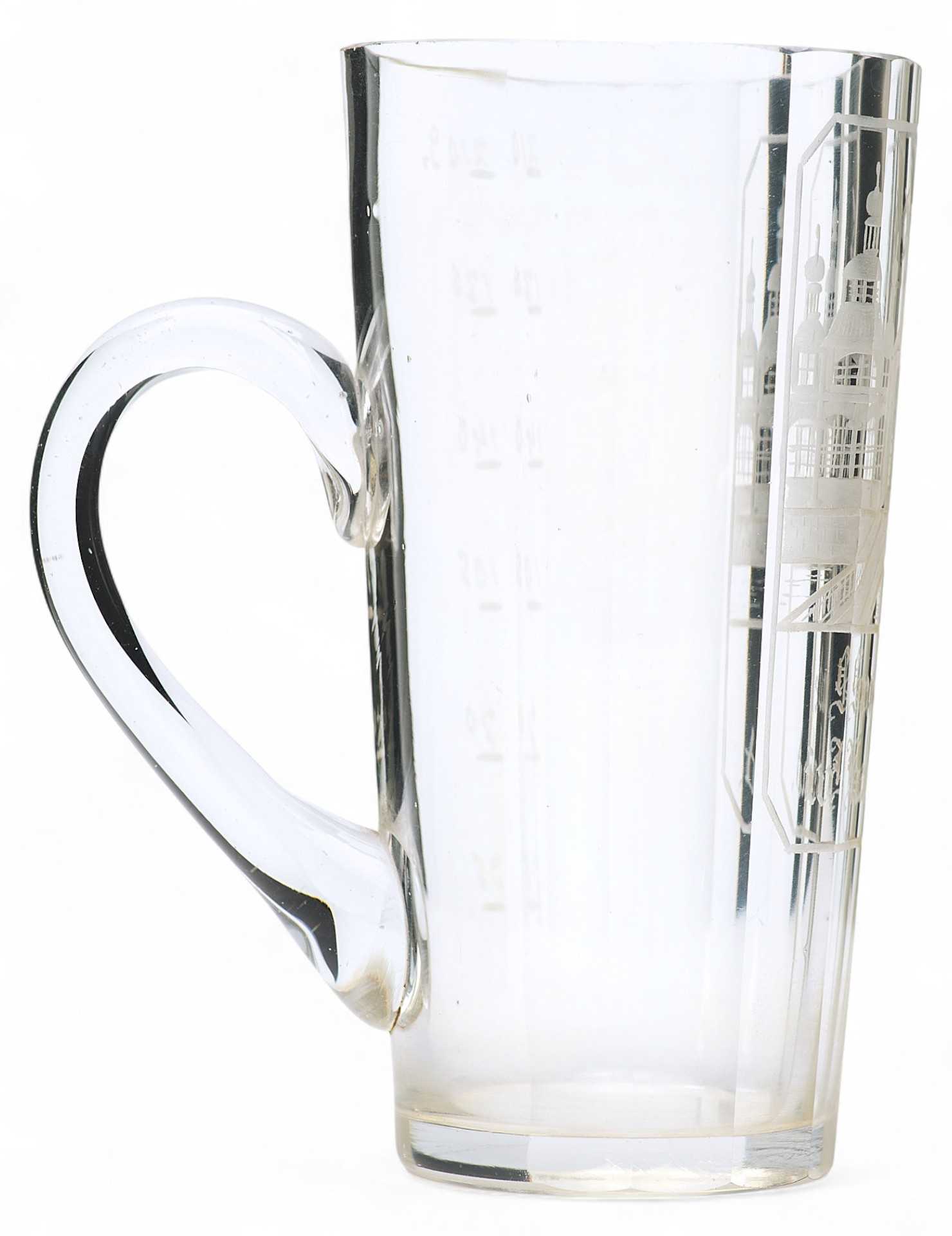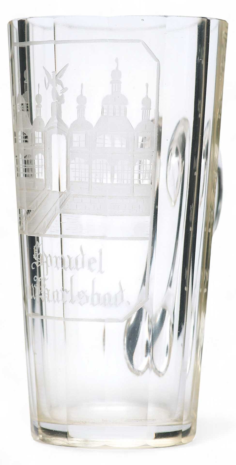 Форма кружки цилиндрическая с легким расширением кверху с ручкой выполнена в традициях первой четверти XIX века. В гравированном рисунке изображен архитектурный вид с надписью «Зеркало Карлсбада».