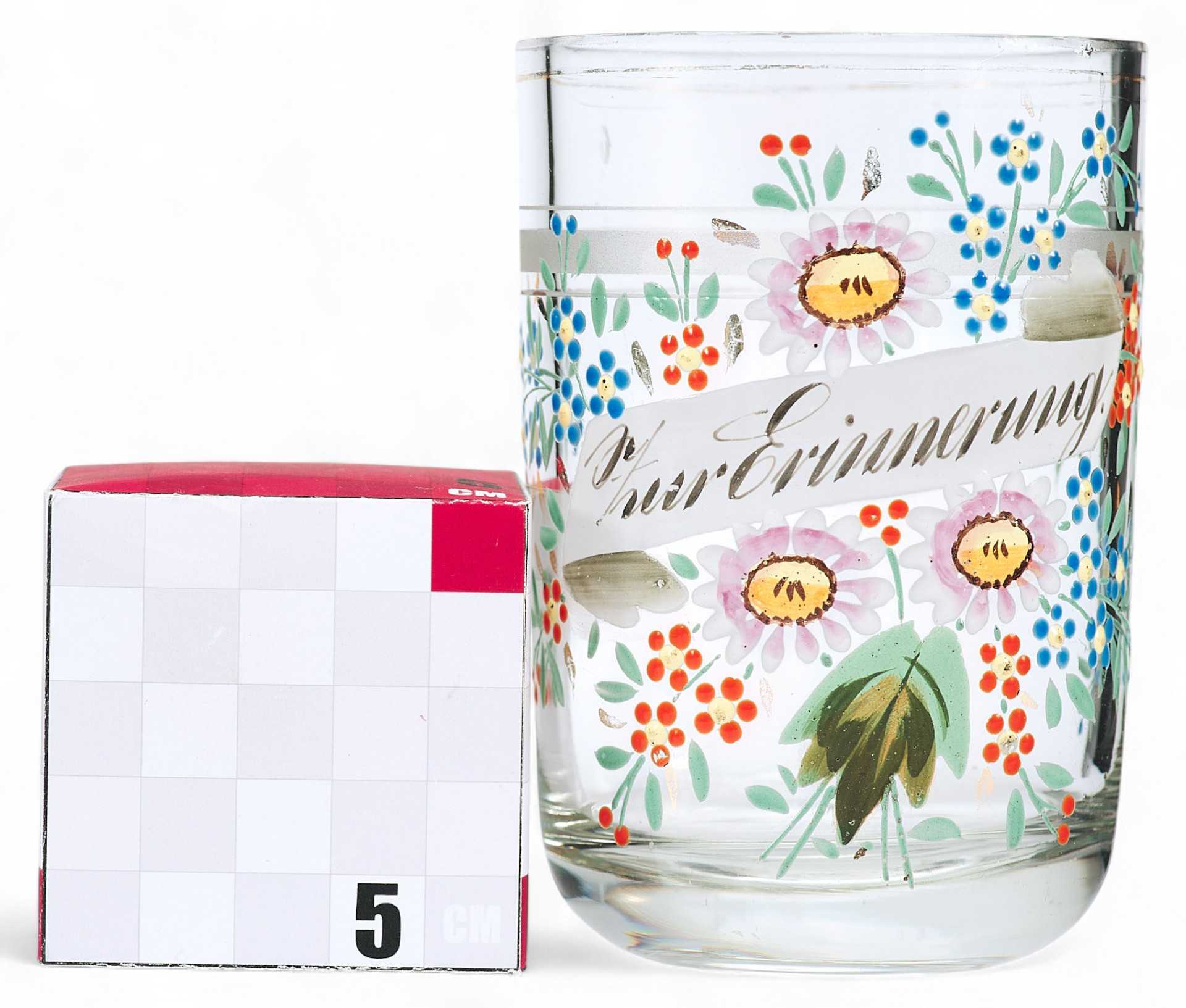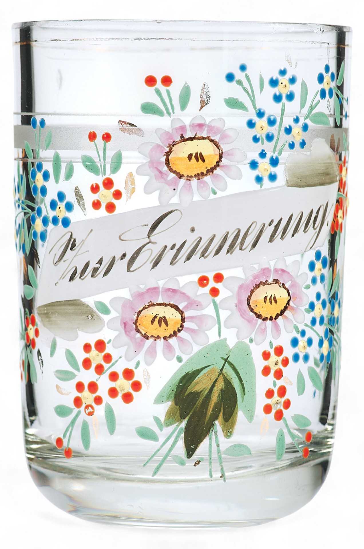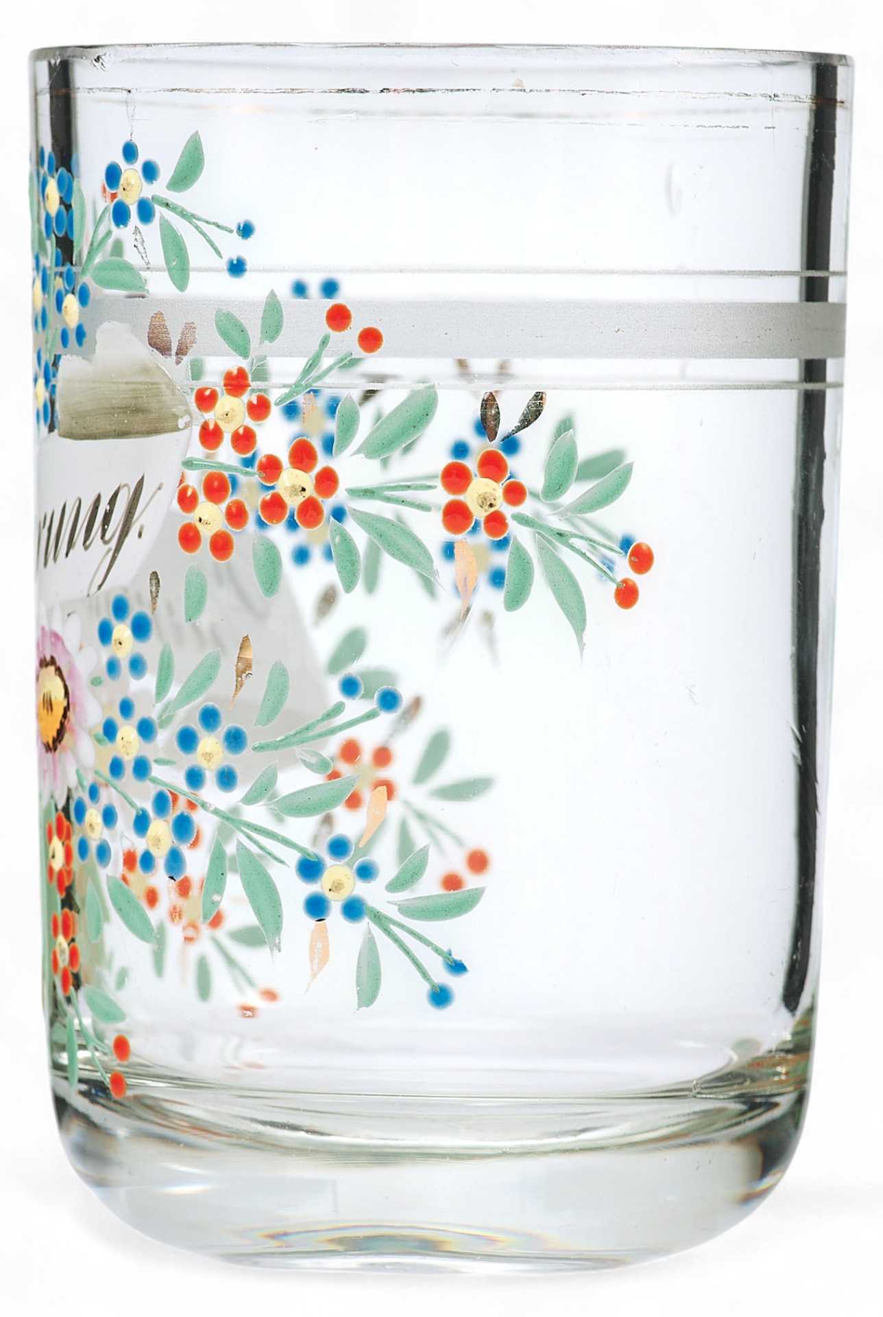 Стакан цилиндрической формы, с легким расширением кверху, дно плоское. На тулове роспись цветными эмалями (белая, желтая, зеленая, оранжевая, синяя) в виде веточек с цветами и листочками. В середине на белой полоске надпись: “Zur Erinnerung” (На память).
