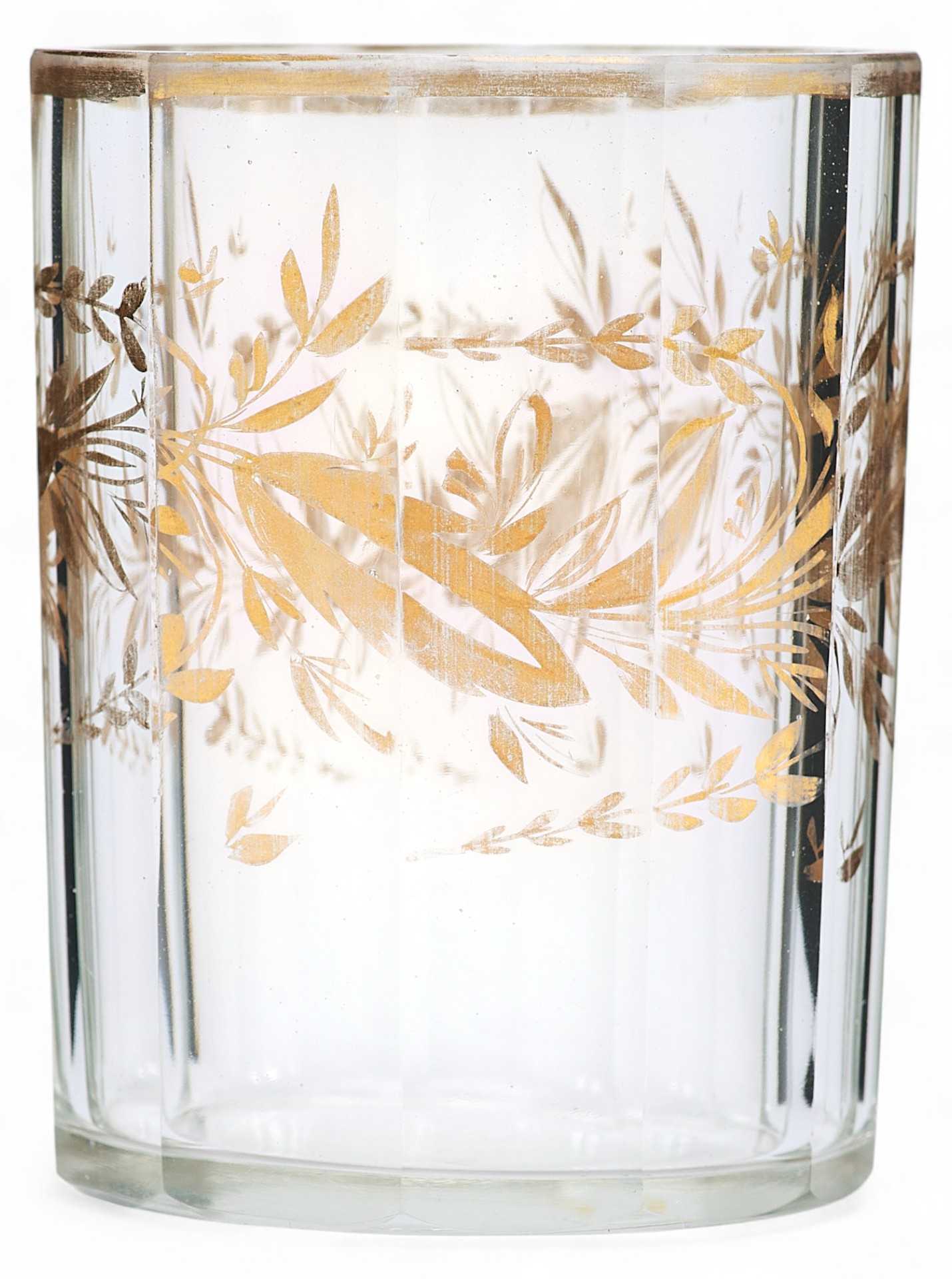Стакан цилиндрической формы с огранкой выполнен из высококачественного богемского хрусталя. Украшен стилизованным