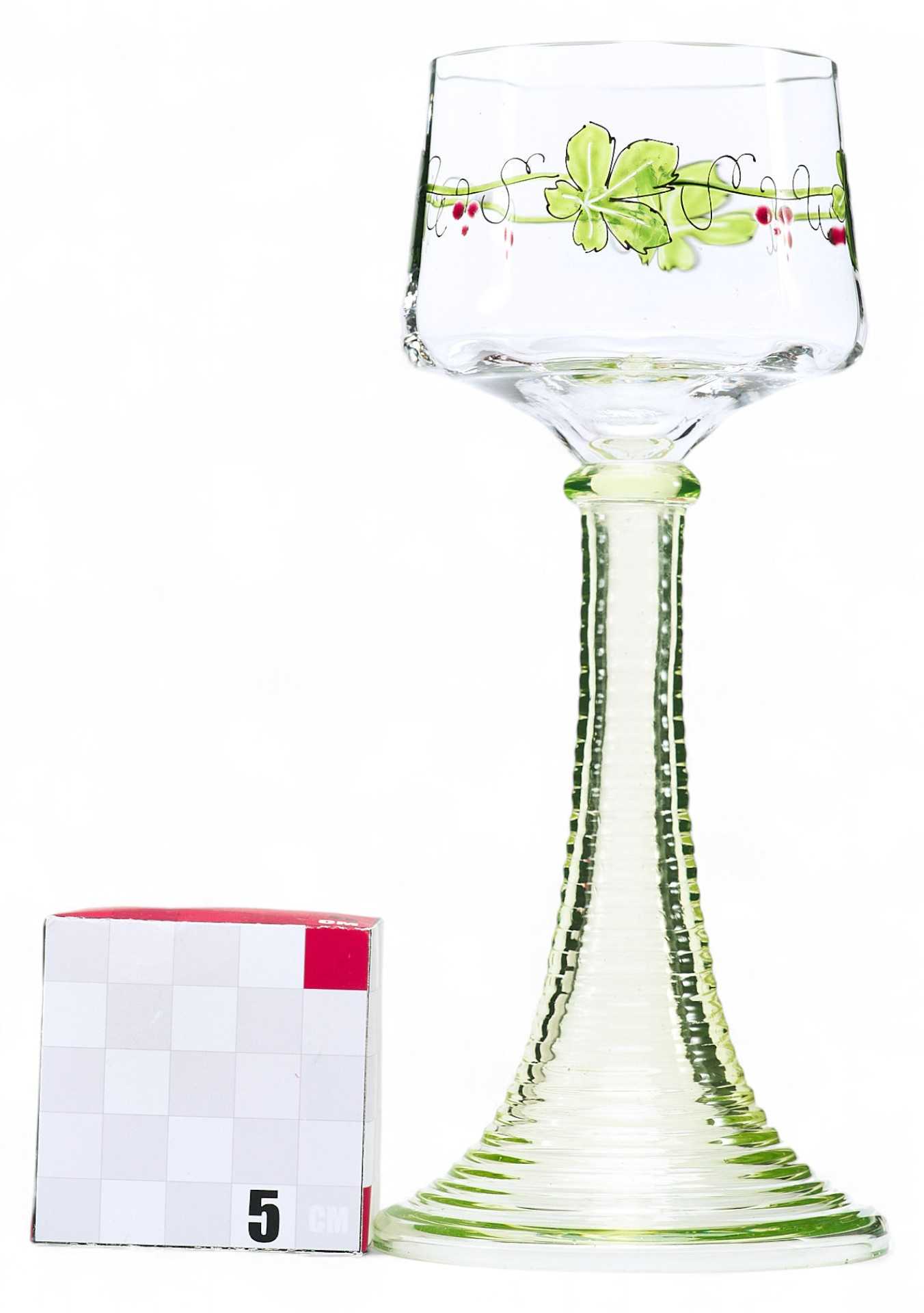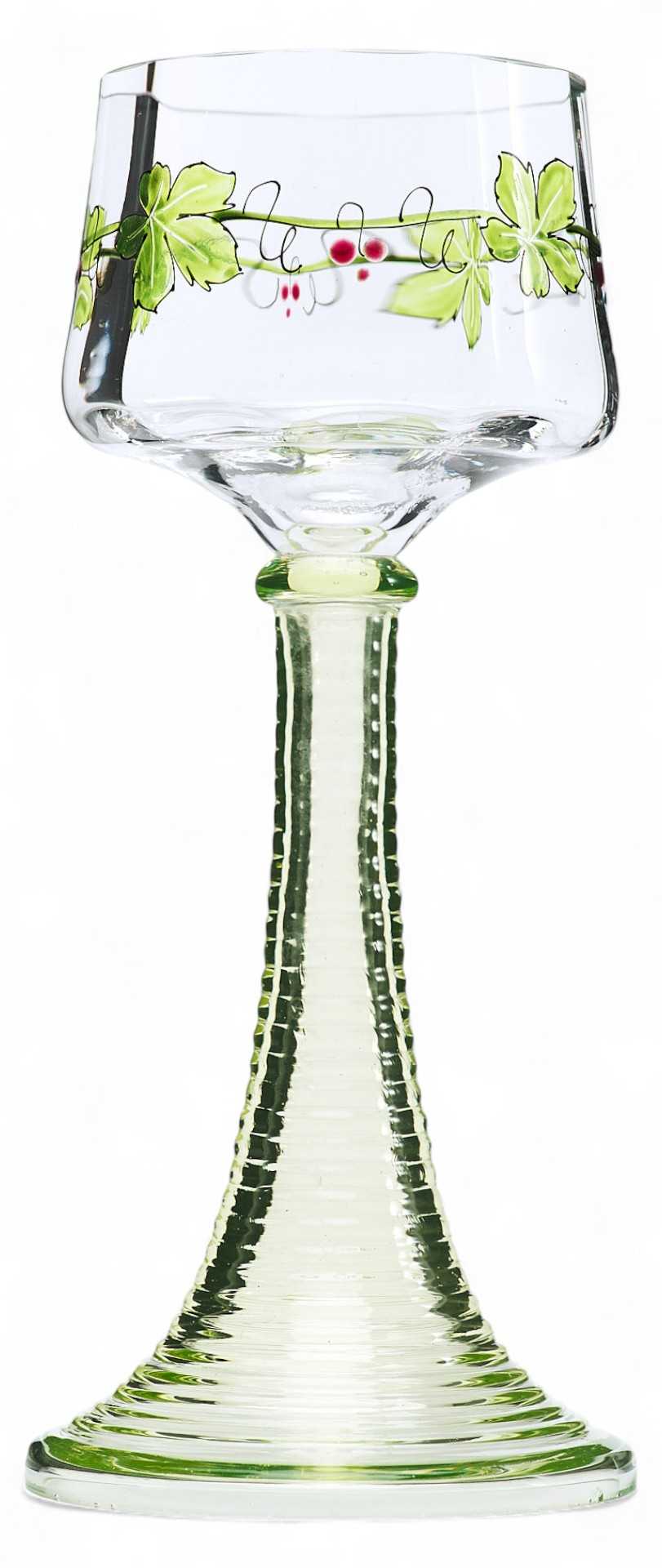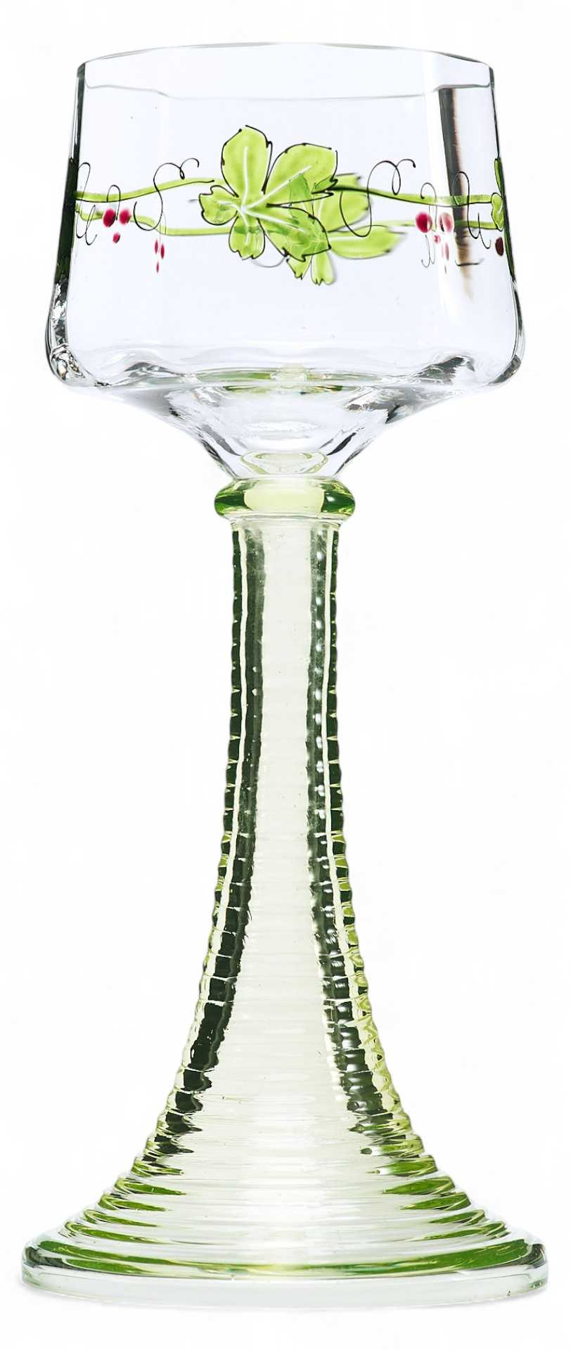 Бокал на высокой ножке, по своей форме напоминающий средневековый рёмер. И все же, дизайн формы бокала явно указывает на стилевые приемы искусства модерна, вероятнее всего, немецкого югендстиля. На стенках чаши бокала эмалевая роспись в виде виноградных листьев и ягод.