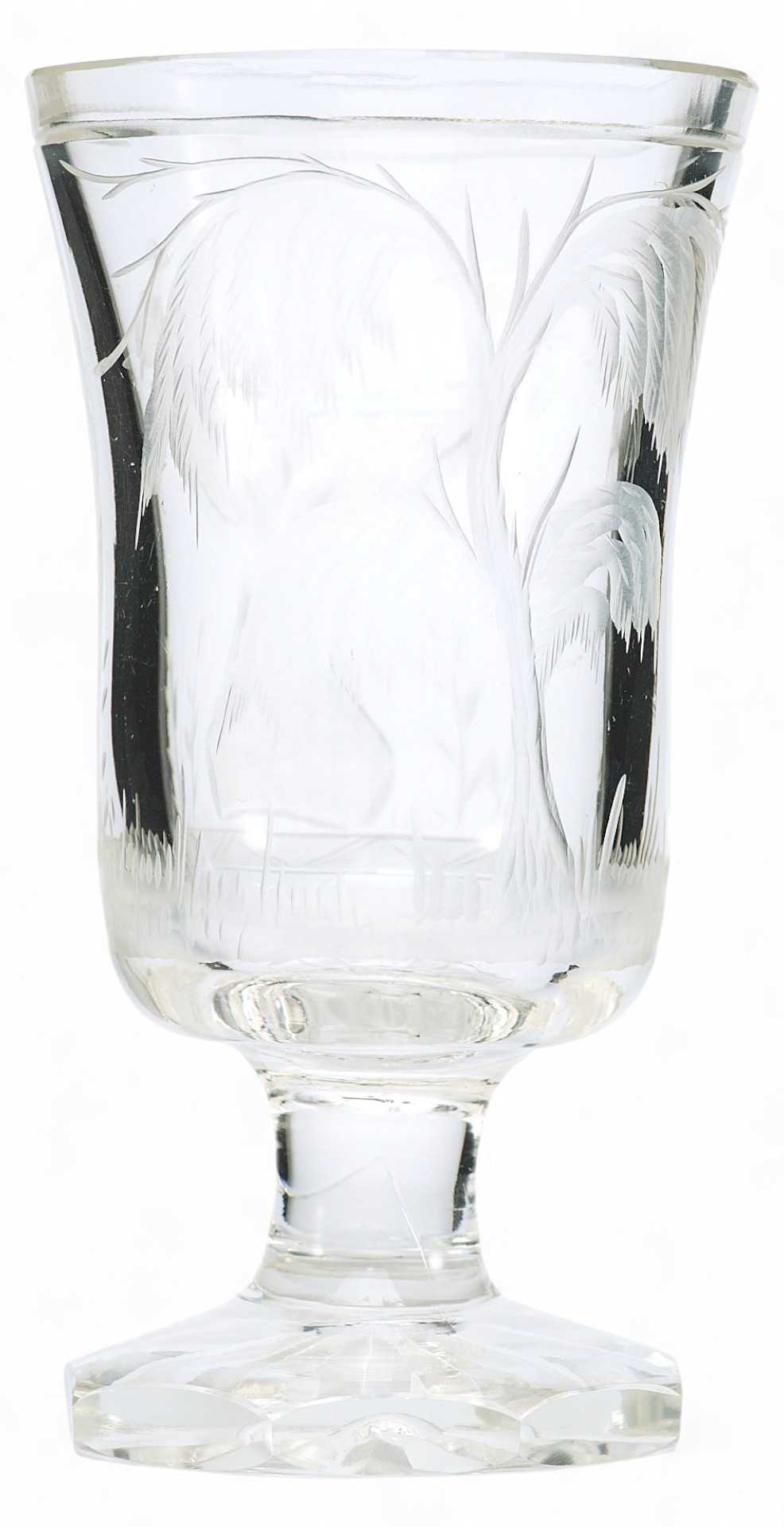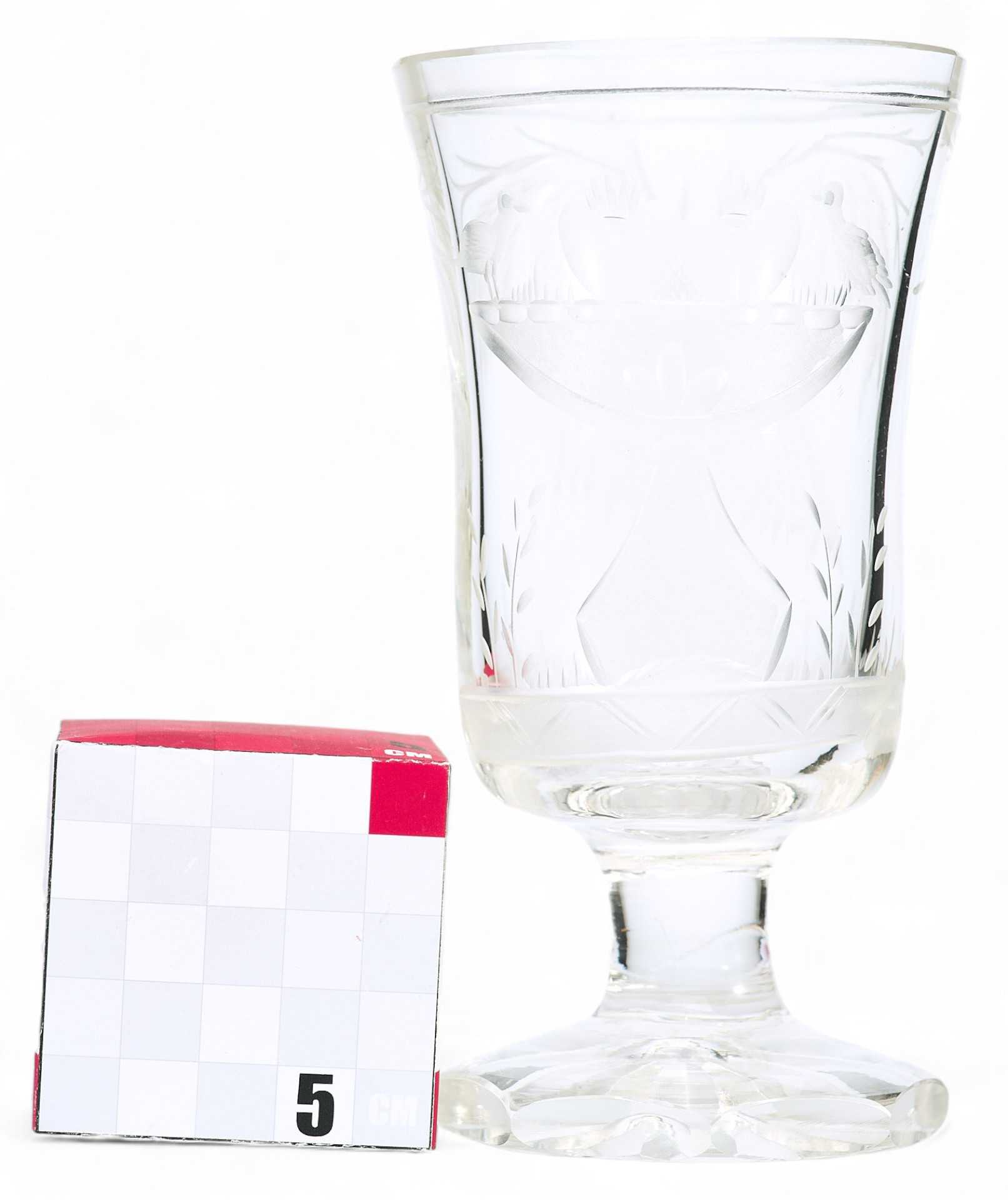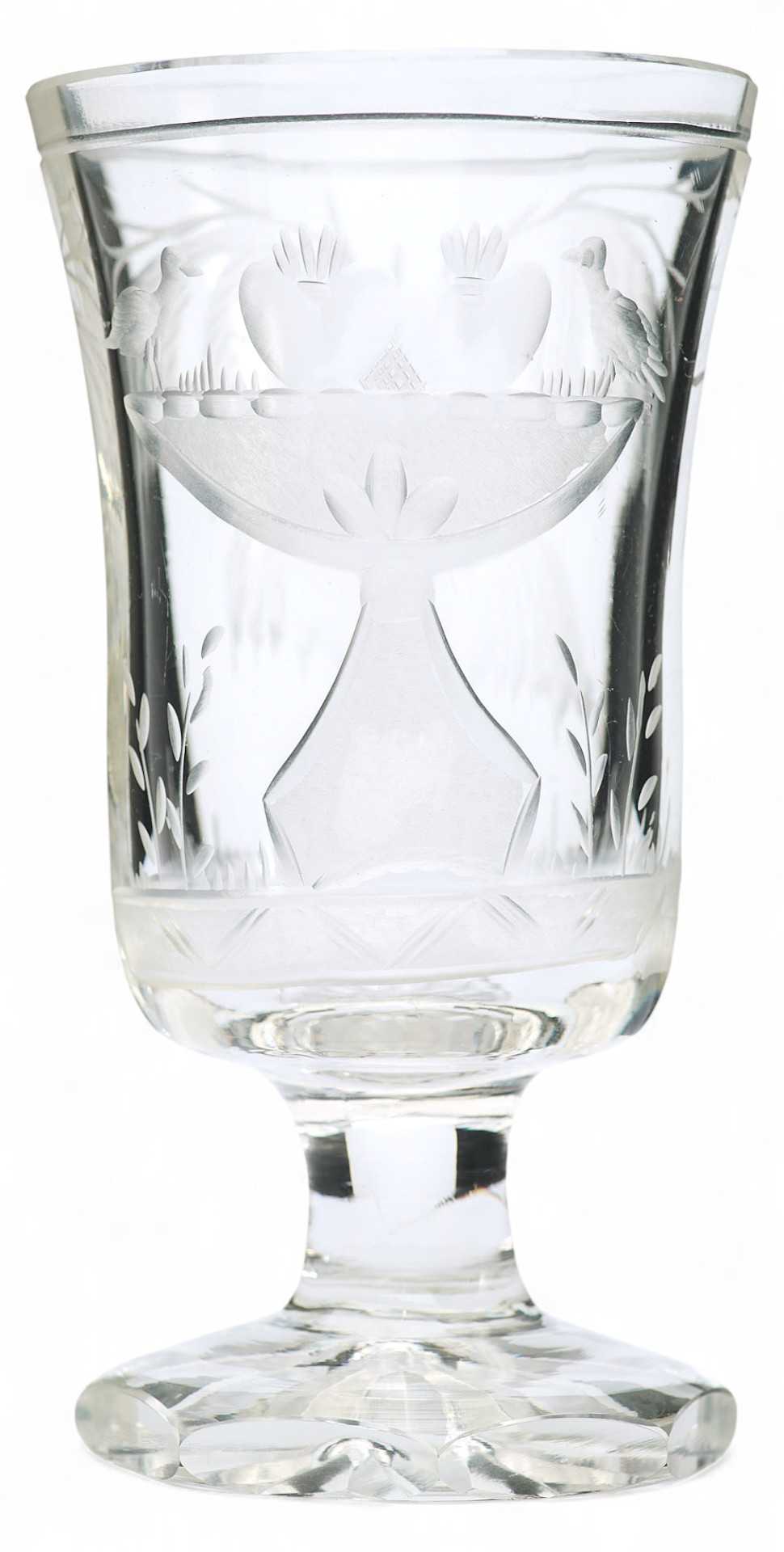 Форма кубка цилиндрическая с легким расширением кверху. Матовой гравировкой с изображением вазы с птицами