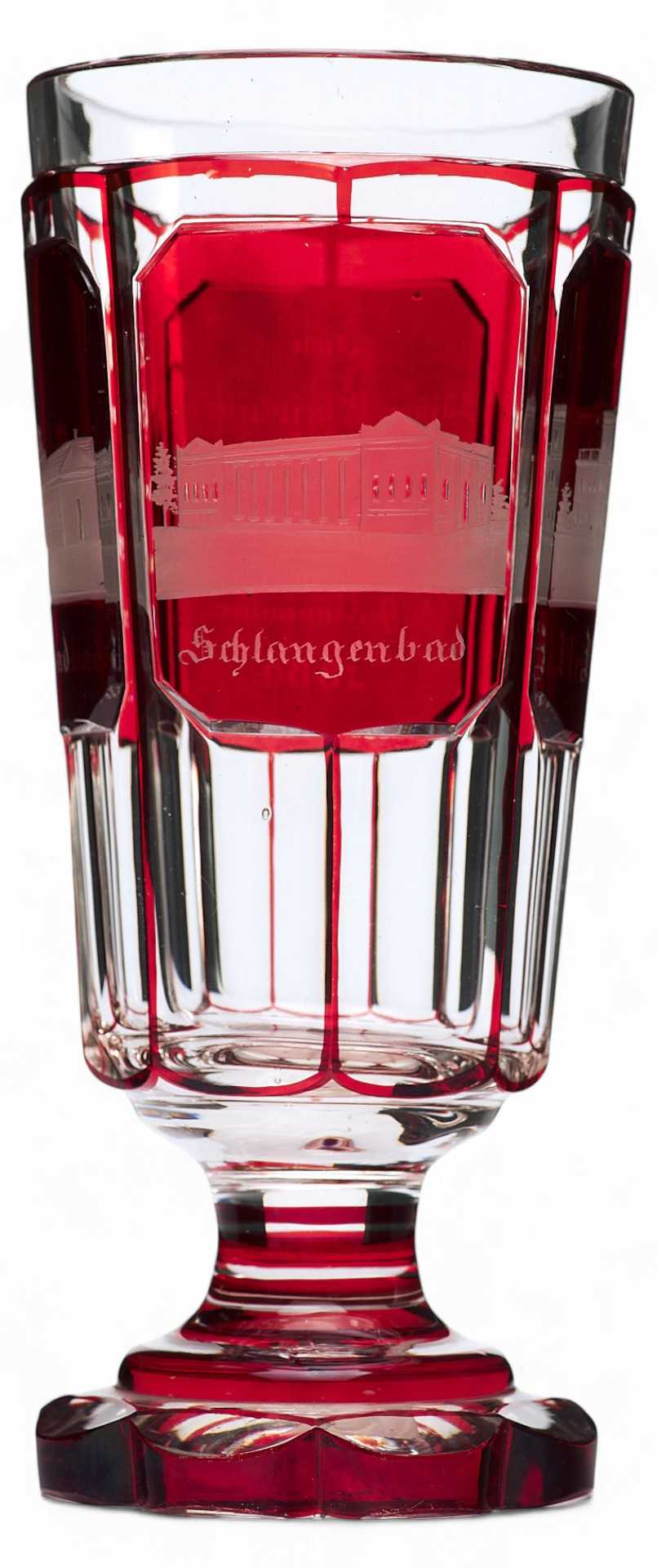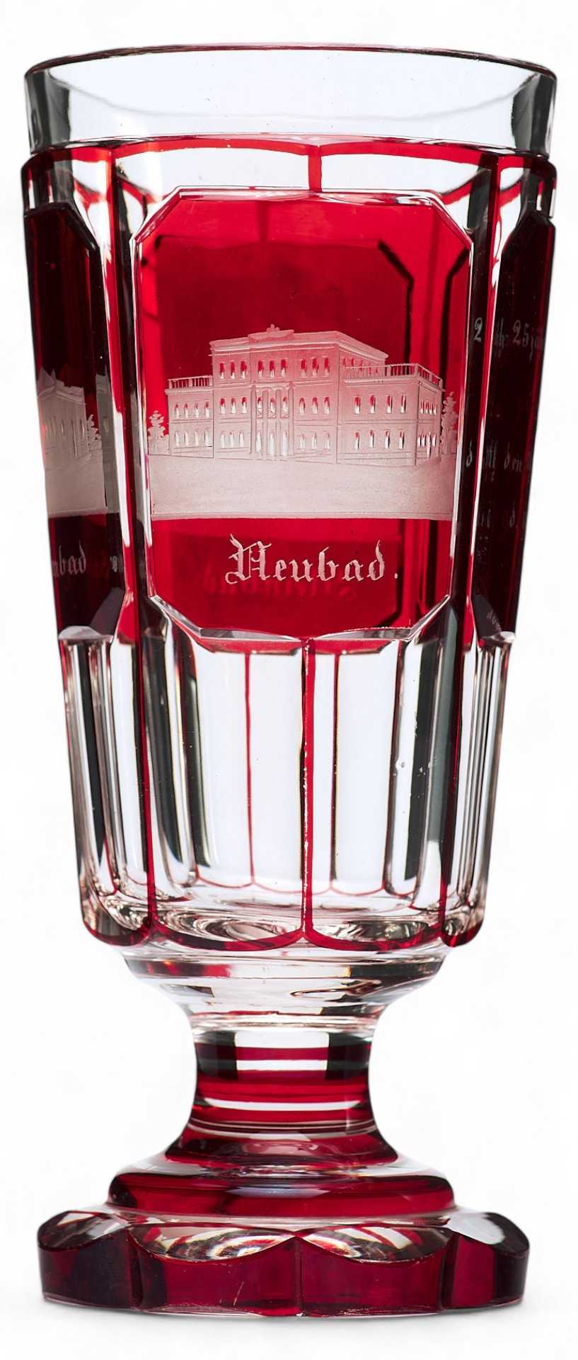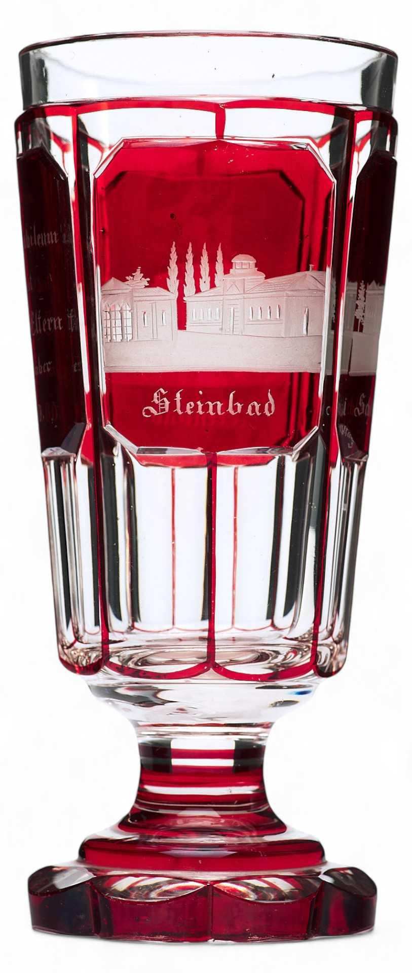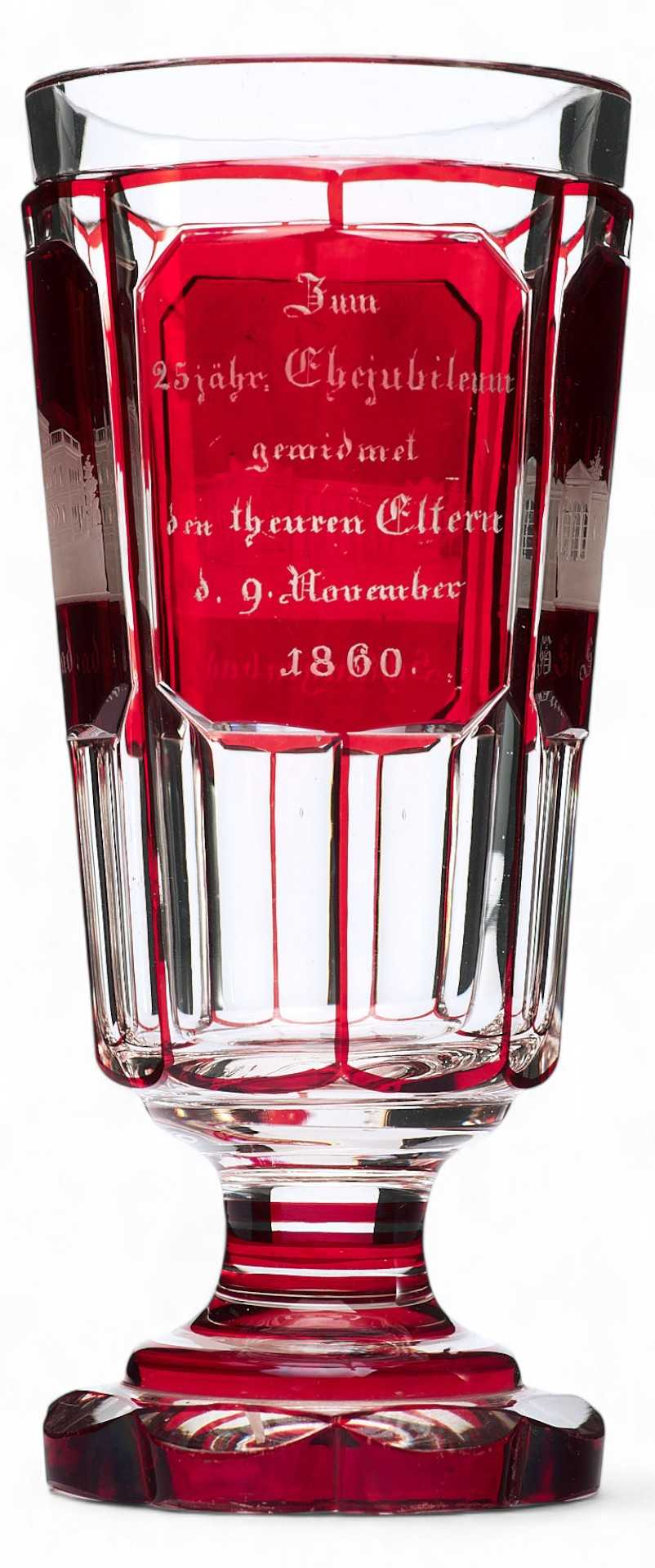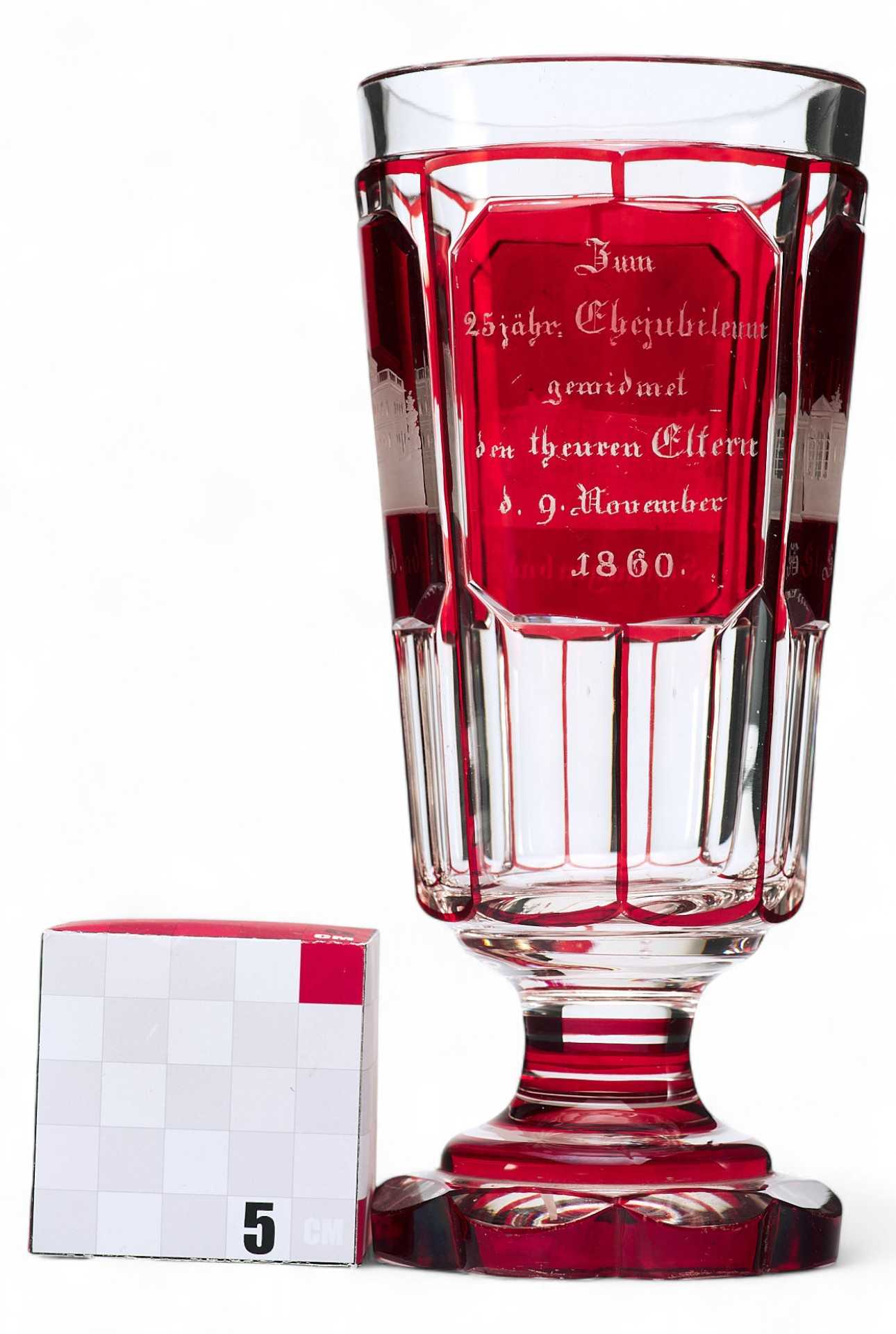 Кубок классической формы с расширением кверху, на невысокой устойчивой ножке с фигурным основанием выполнен из прозрачного высококачественного стекла. Предмет оформлен тонкими вертикальными полосами рубинового нацвета, и четырьмя рубиновыми же прямоугольными медальонами. В трех медальонах находятся изображения достопримечательностей чешского города Теплице, популярного в XIX веке курорта среди аристократии и известного своими горячими источниками. Рисунки нанесены методом травления, с выгравированными названиями: «Schlangenbad», «Neubad», «Steinbad». В четвертом медальоне дарственная надпись на немецком языке в несколько строк стилизованным готическим шрифтом, с указанием даты «1860» (примерный перевод означает, что кубок был подарен на годовщину свадьбы родителям). В целом предмет отличается нарядностью, декоративностью и высоким уровнем исполнения. Подобные стаканы и кубки стоили дорого и были в большинстве своем подарочными и сувенирными.