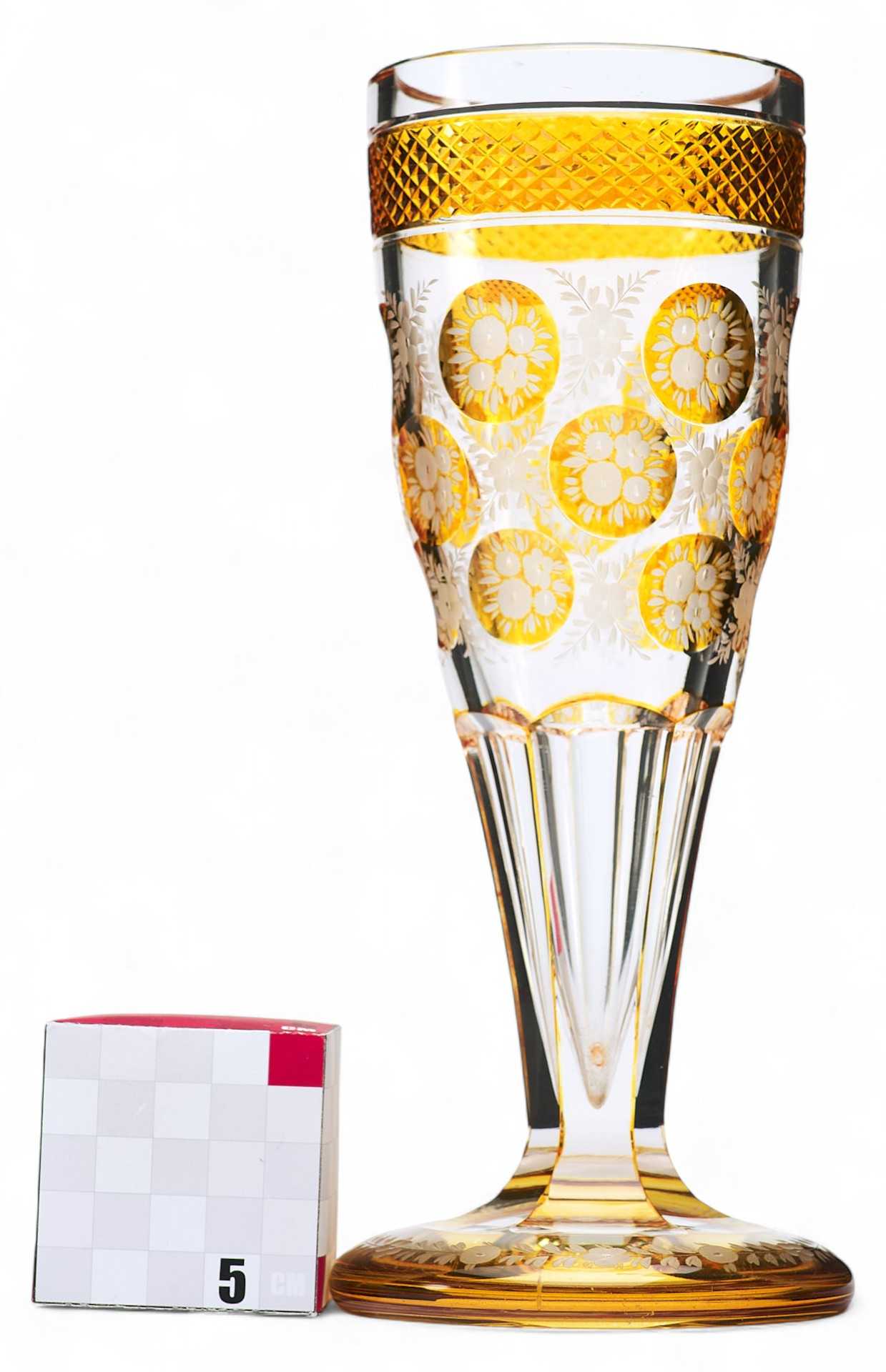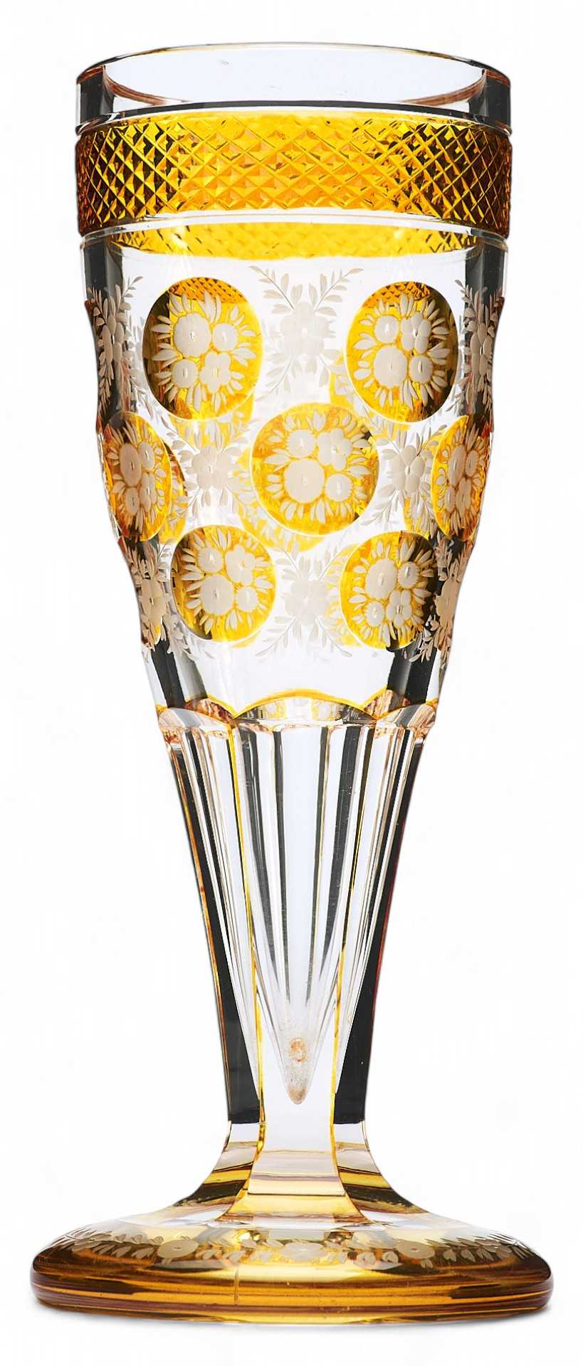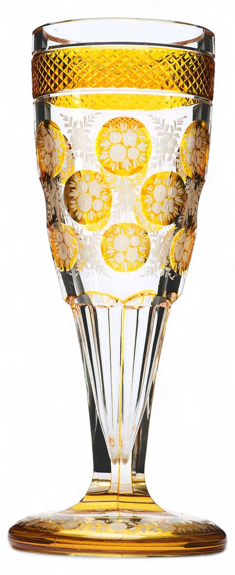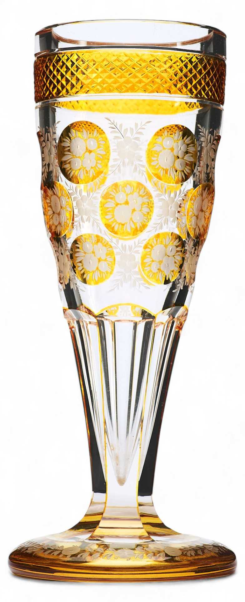 Кубок классической формы на высокой ножке оформлен медальонами с желтым нацветом с протравленным изображением