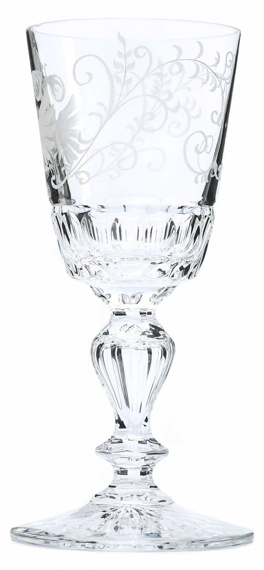 Тулово конусовидное, ножка в виде ограненных балясины и “яблока”; в нижней части В тулова огранка в виде арок. На тулове изображен двуглавый орёл, корона и щит. На дне основания шлифованная розетка, в круге монограмма под короной: “JH186”.