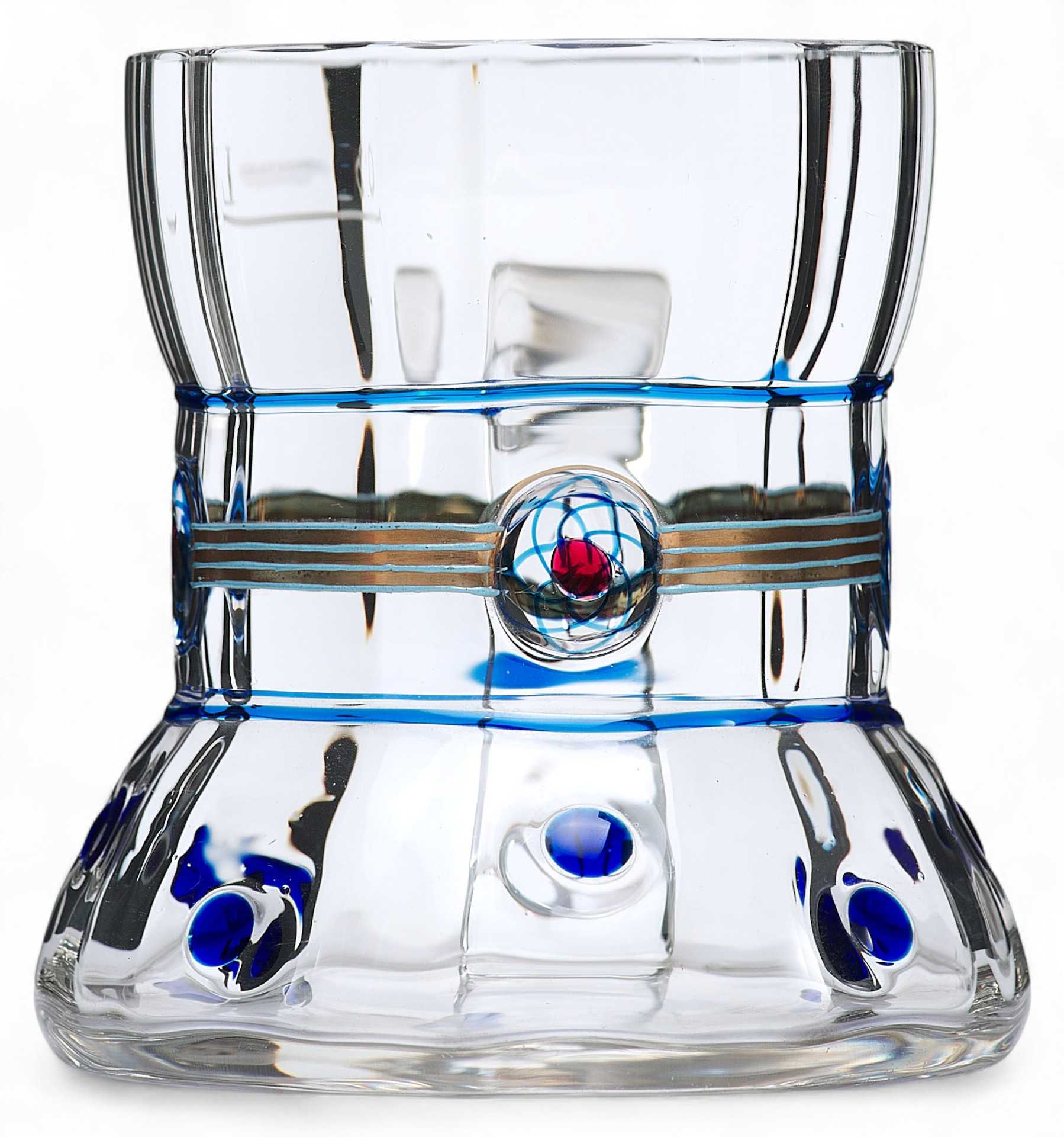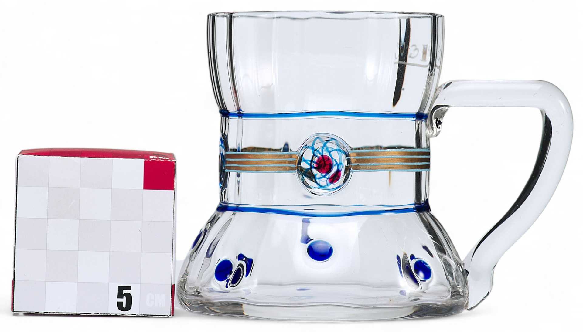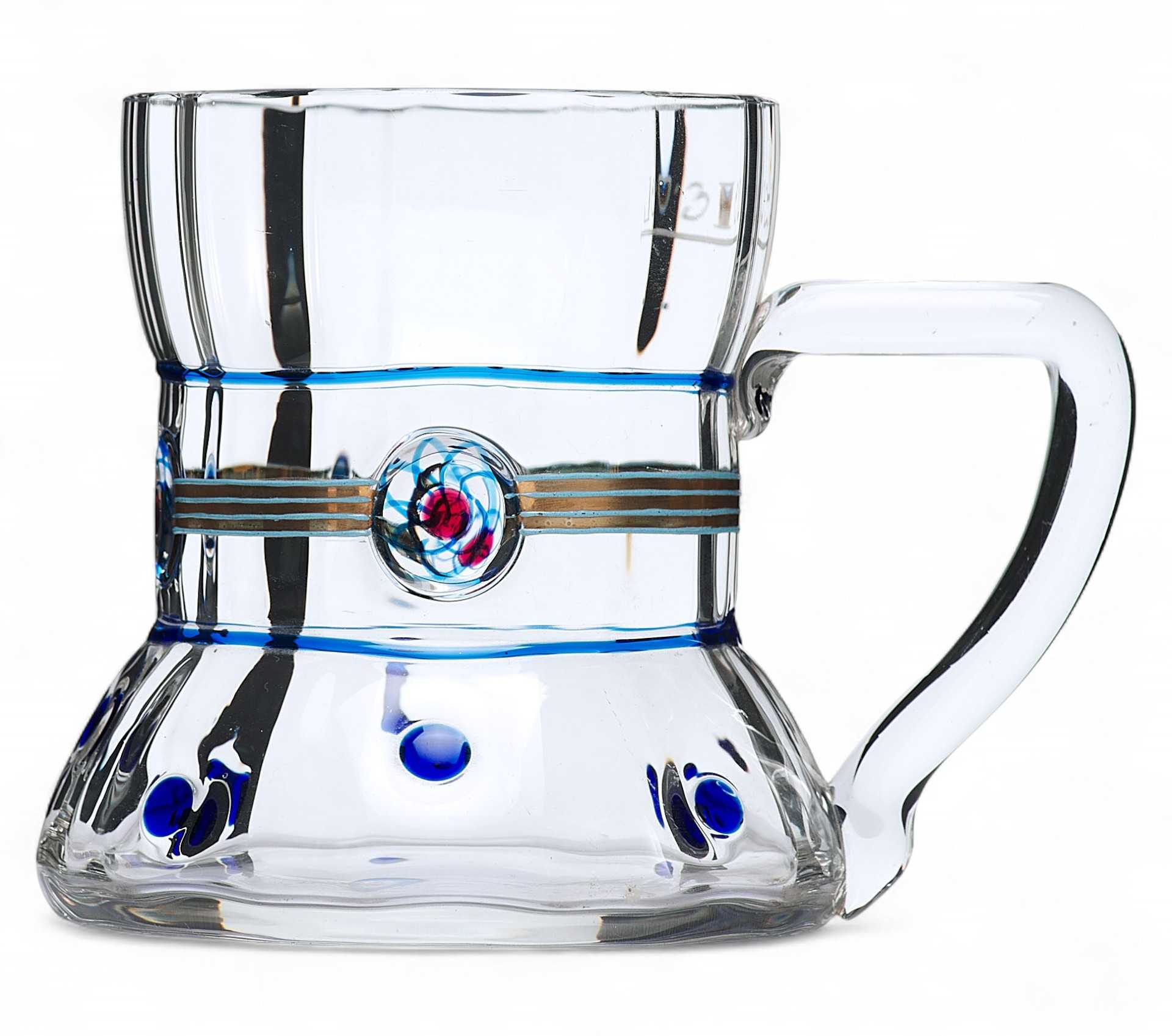 Кружка с широким основанием, граненная с внутренней стороны. Кружка украшена вставками из цветного стекла в виде