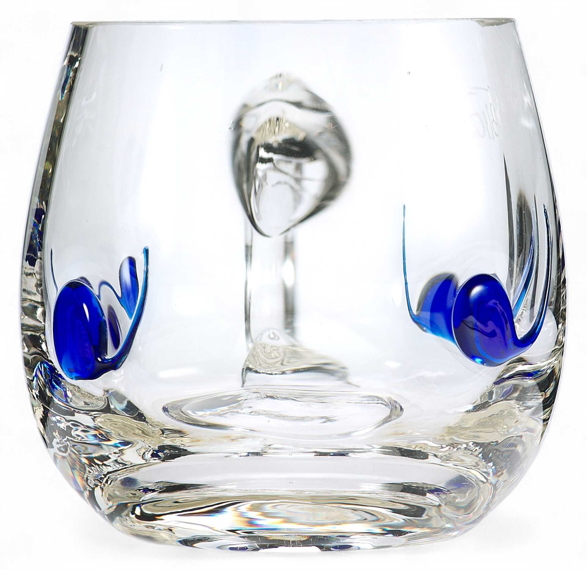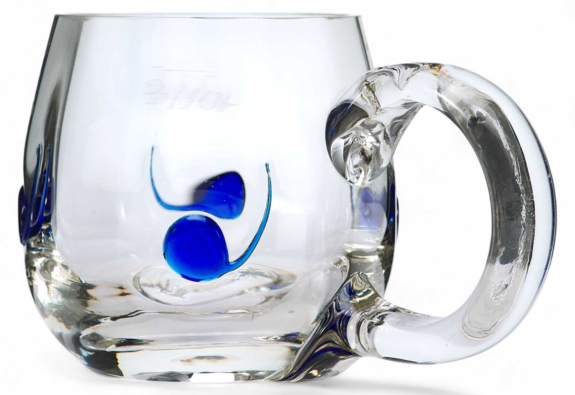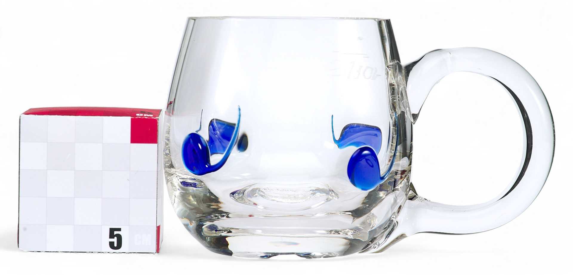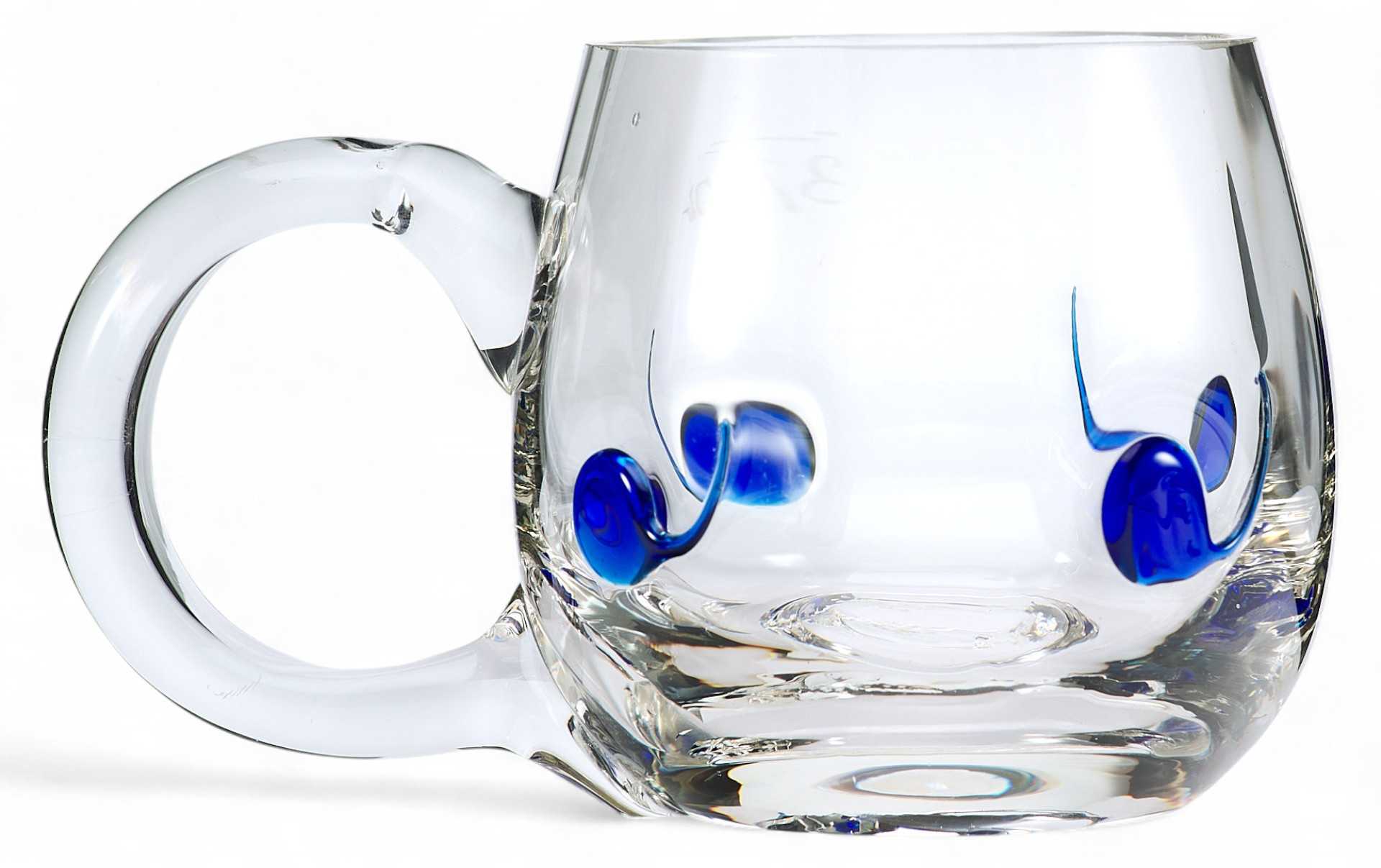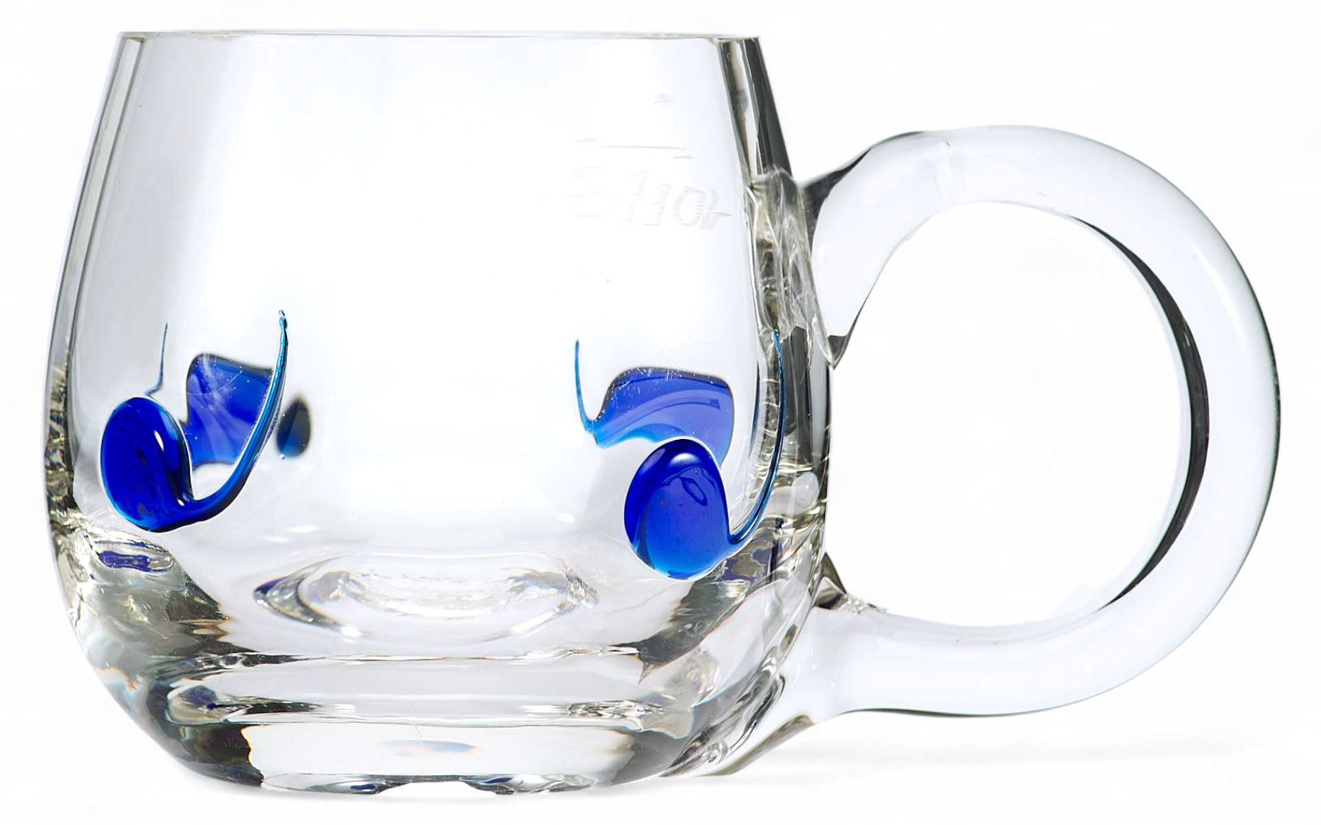 Представлена кружка, украшенная синими горошинами со вздернутыми хвостиками в виде опрокинутой «запятой», выполненные из цветного стекла. По краю кружки гравировка: «0,3 L».