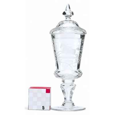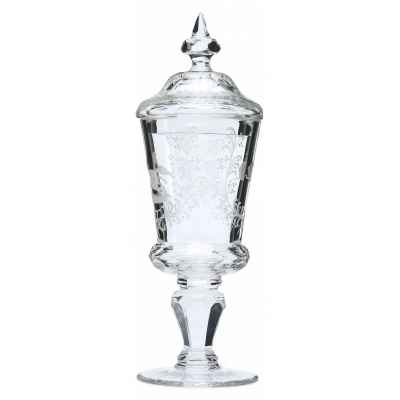 Тулово конусовидное, в нижней части огранено, ножка короткая с ограненным яблоком” и балясиной, навершие крышки огранено “яблоком” и имеет конусовидную шишечку.