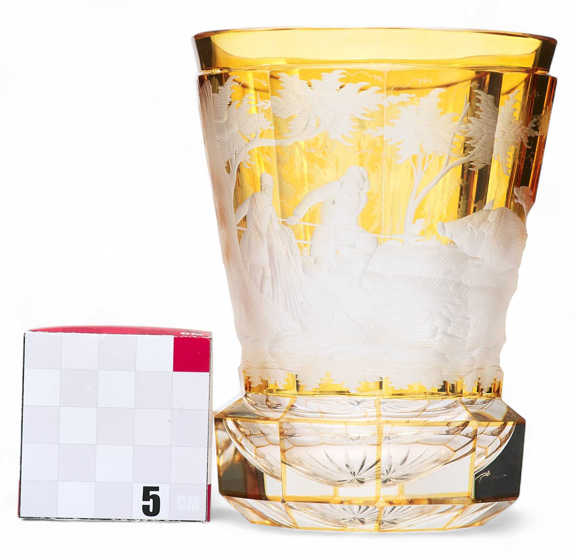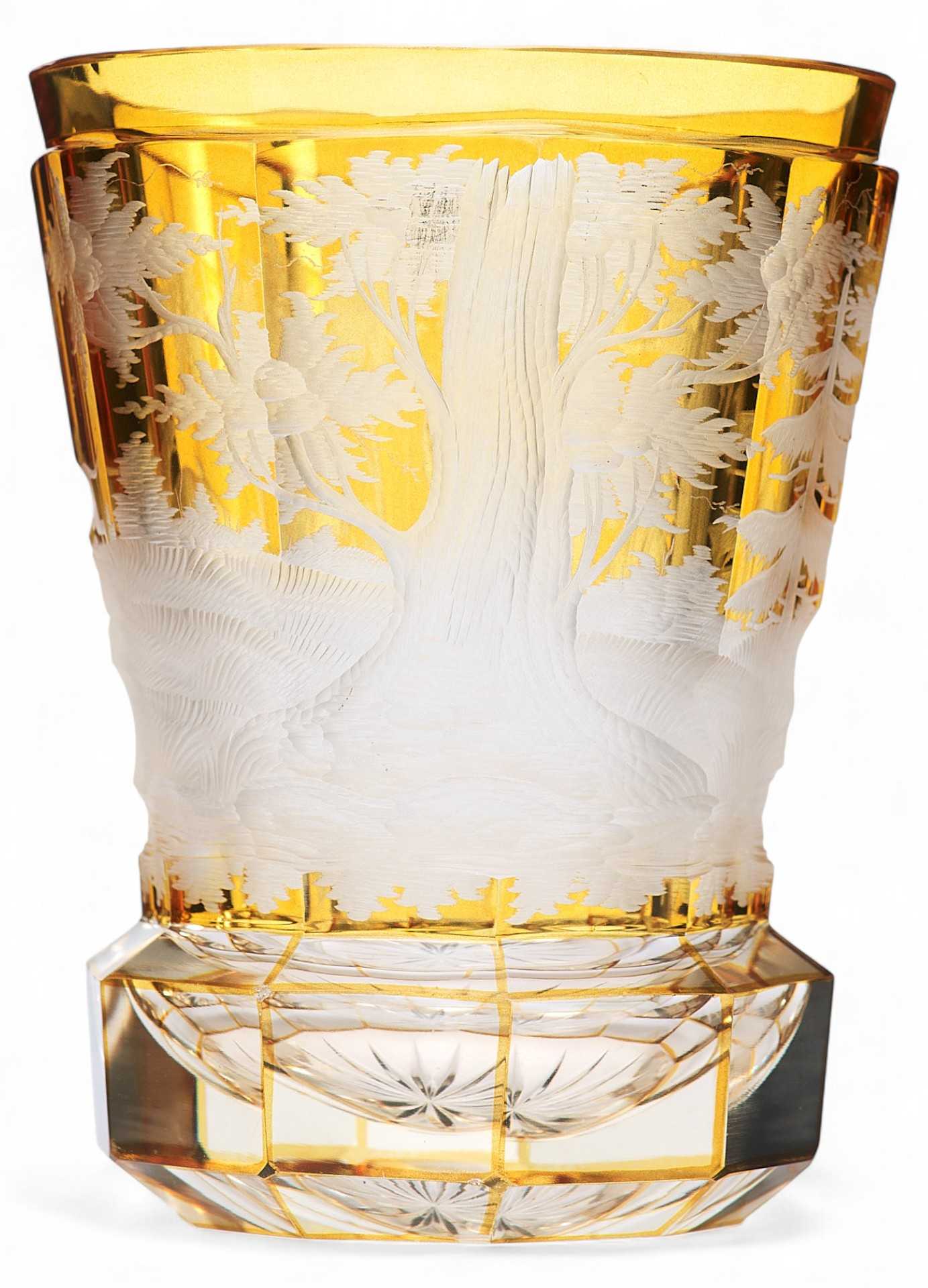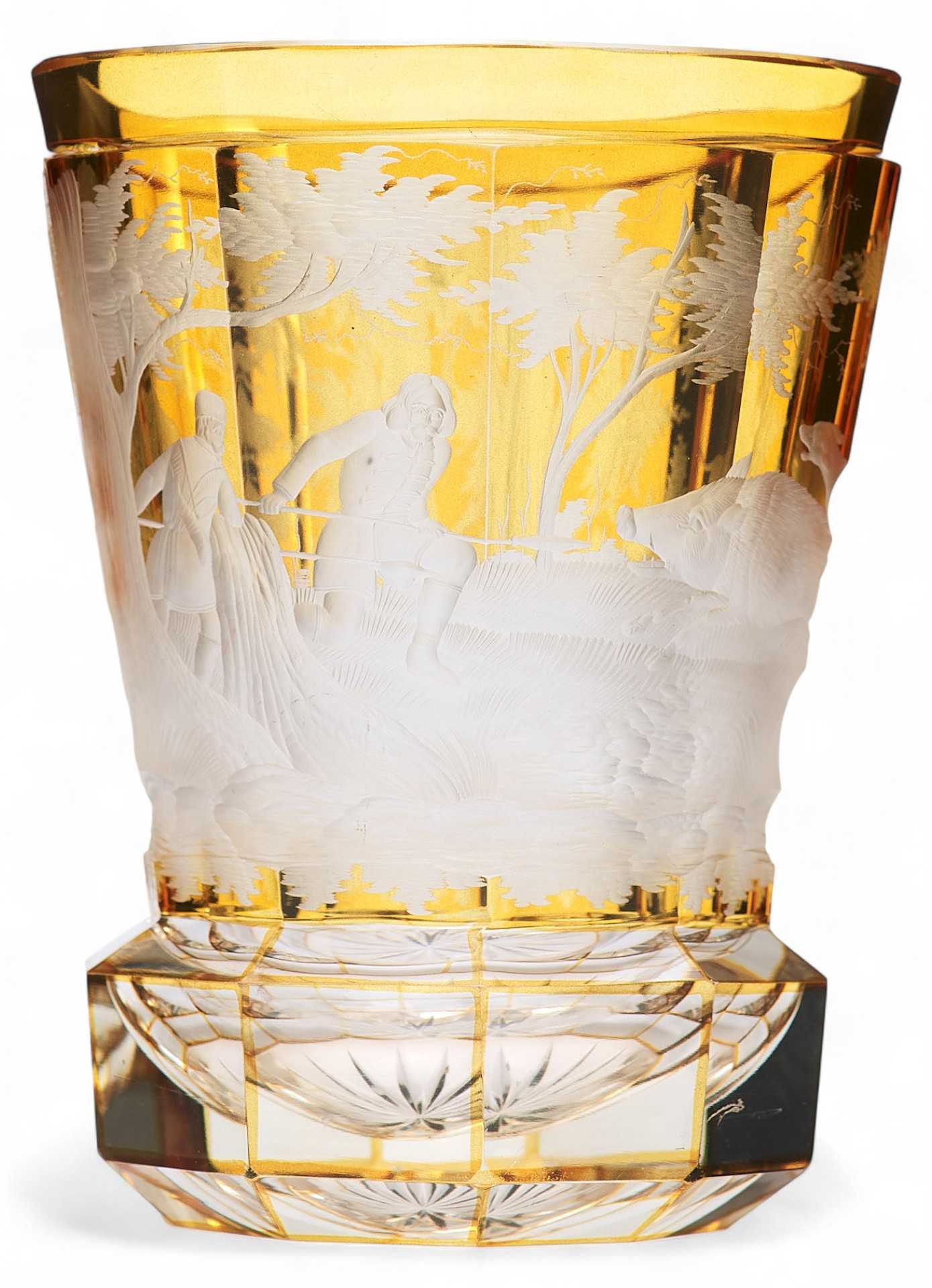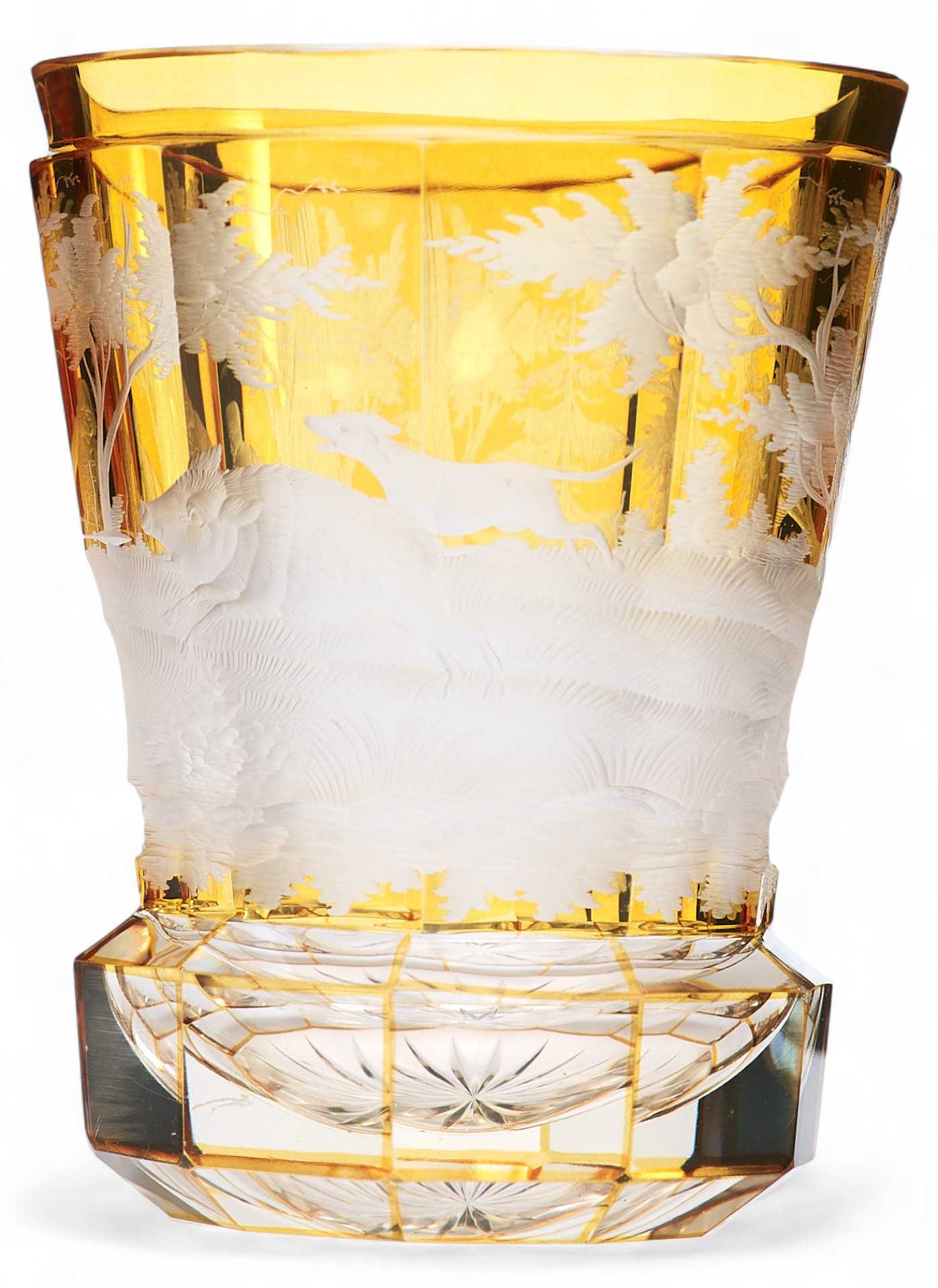 Стакан классической формы с расширением кверху и выступающим основанием многоугольной формы выполнен из прозрачного стекла, покрыт нацветом янтарного оттенка. Основная поверхность украшена охотничьей сценой - показана травля собаками кабана, проходящая на фоне лесного пейзажа. Подобный прием нанесения изображения — снятием нацвета до прозрачного стекла и выгравированным изображением, использовался в декоре богемского стекла начиная с XVIII века. Высококачественное богемское стекло с очень малым процентом содержания оксидов свинца было и остается чистым, прозрачным и сияющим. Наряду с французским и американским стеклом в стиле модерн конца XIX века - начала XX века, чешское стекло в том же стиле принадлежит к самому лучшему, что было создано в мире.