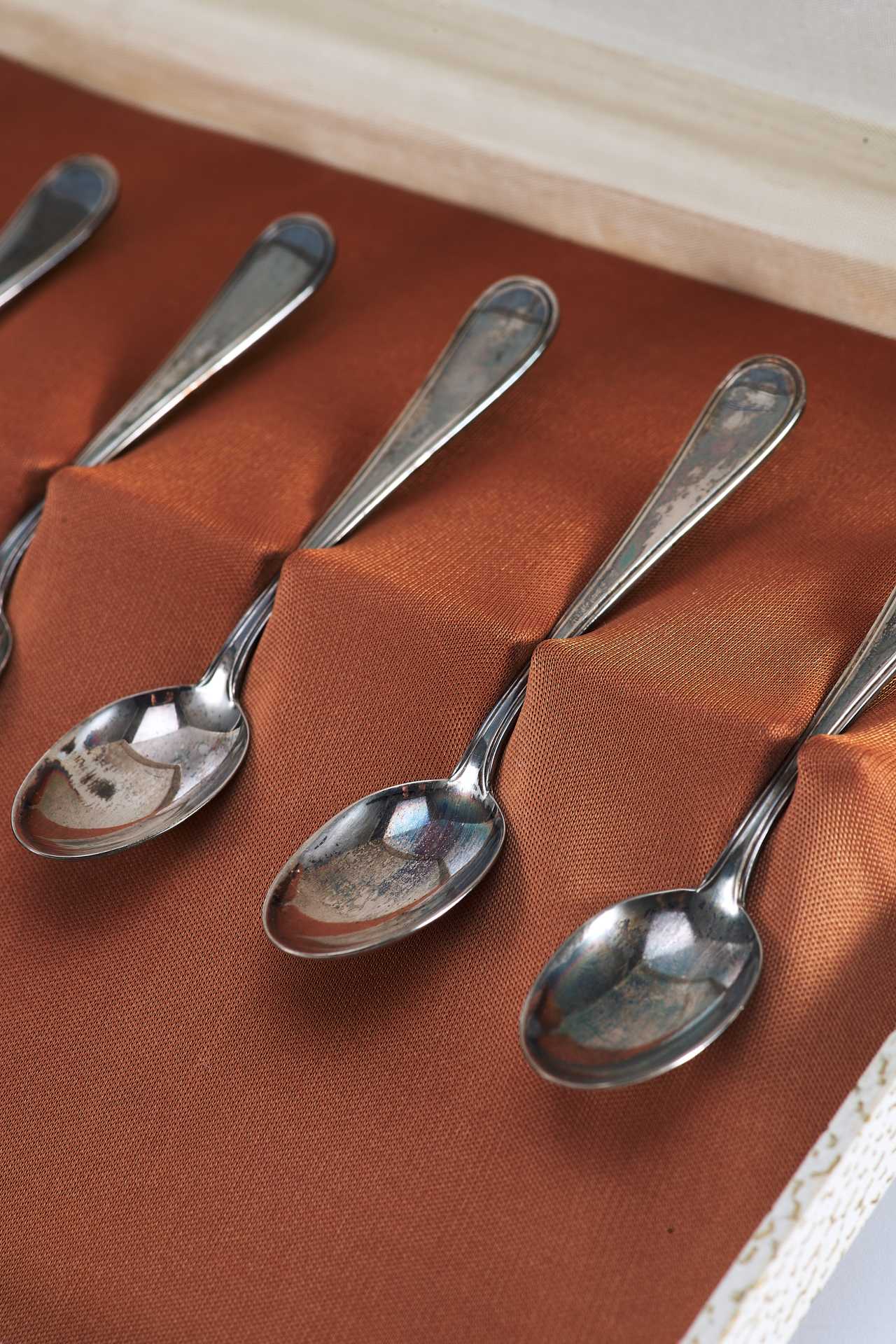 Представлен набор серебряных кофейных ложечек в оригинальном футляре.