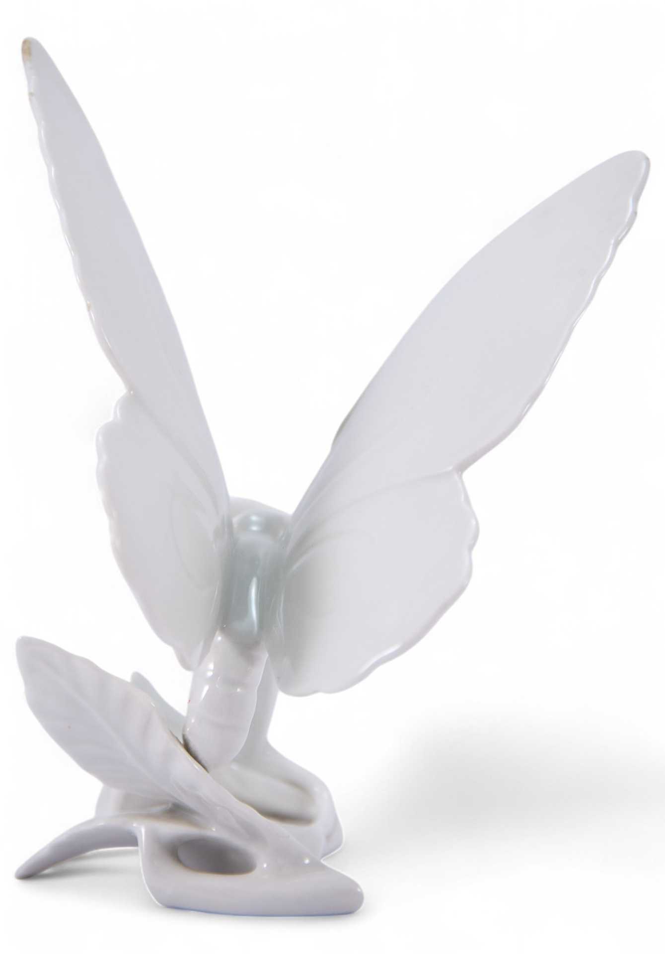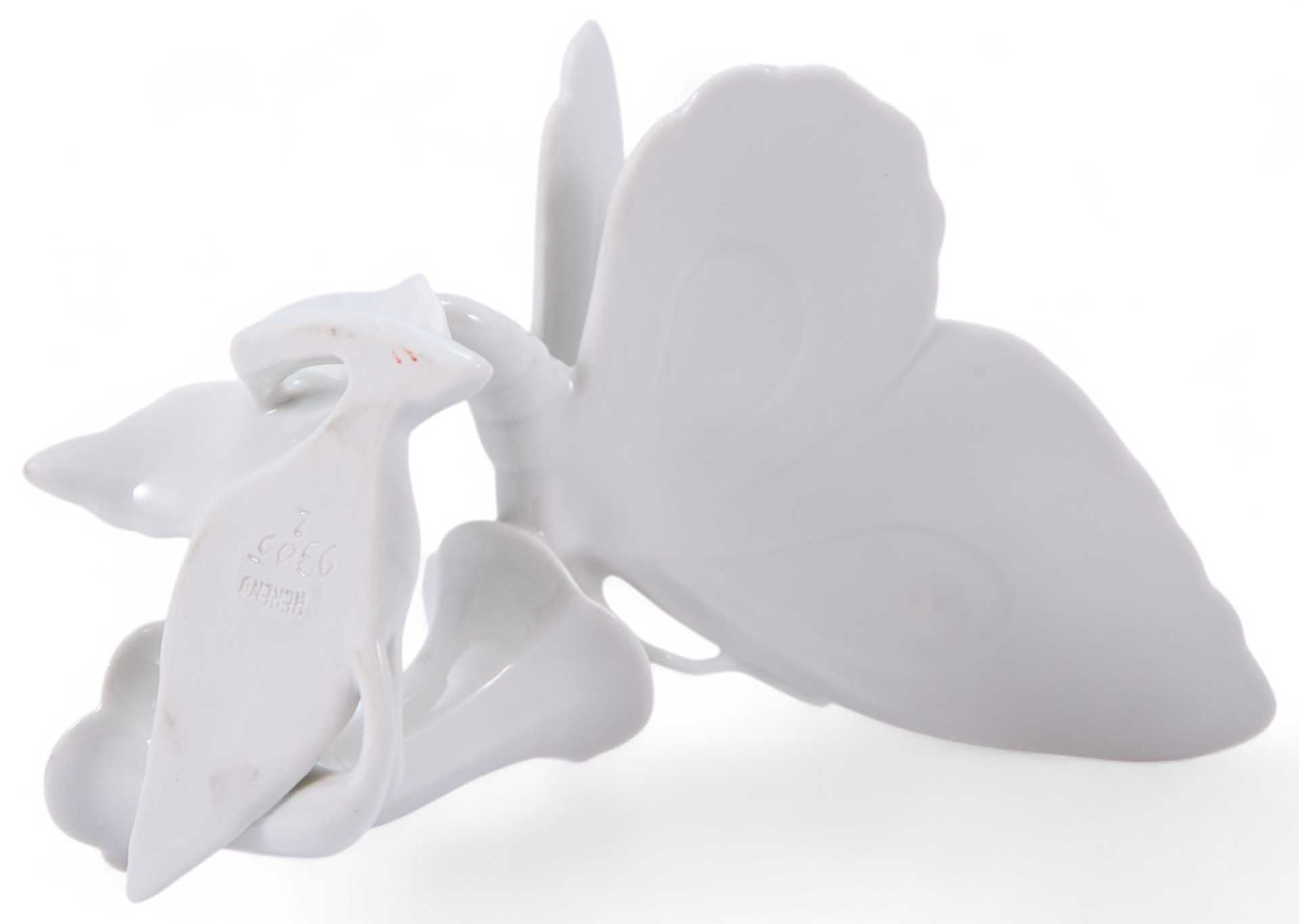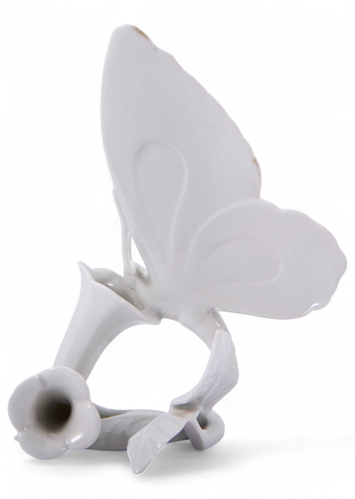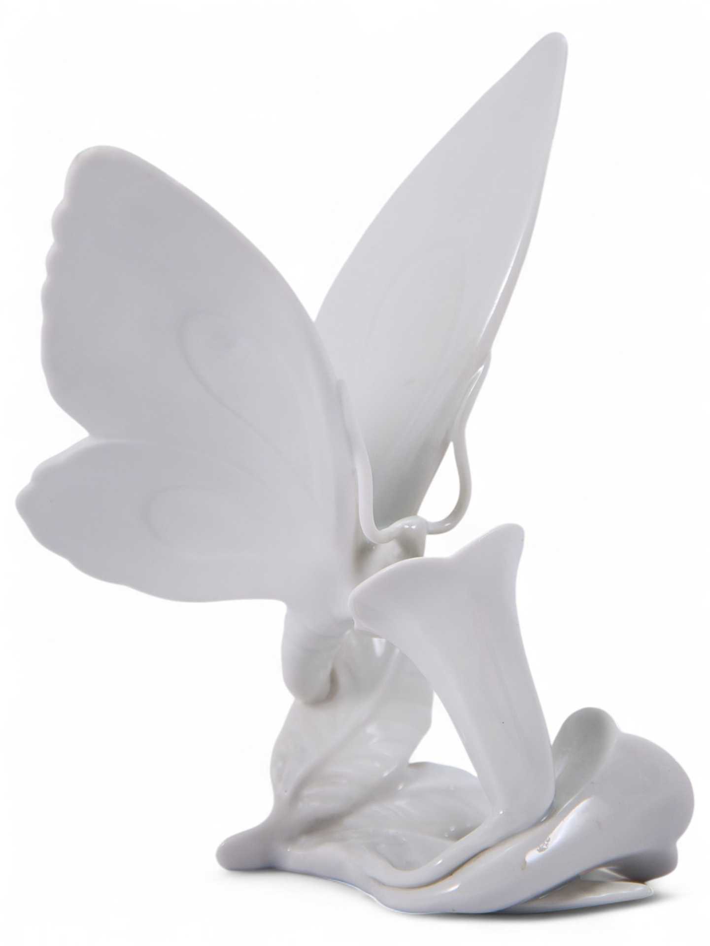 Скульптура бабочки, пьющей нектар из цветка. Это одна из классических фигур фабрики Херенд. Впервые фигурки животных появились в 1870-х гг. благодаря Мору Йокай, вдохновленному росписью одной из китайских фарфоровых фигурок в виде петуха, где его перья были имитированы своеобразным рисунком, получившим впоследствии название «Viex Herend». В 1930-х гг. эти фигурки получили вторую волну популярности в Европе и особенно в США, которая продолжалась до 1950-х гг. Данная фигура относится к серии аналогичных скульптур изображающих различные виды