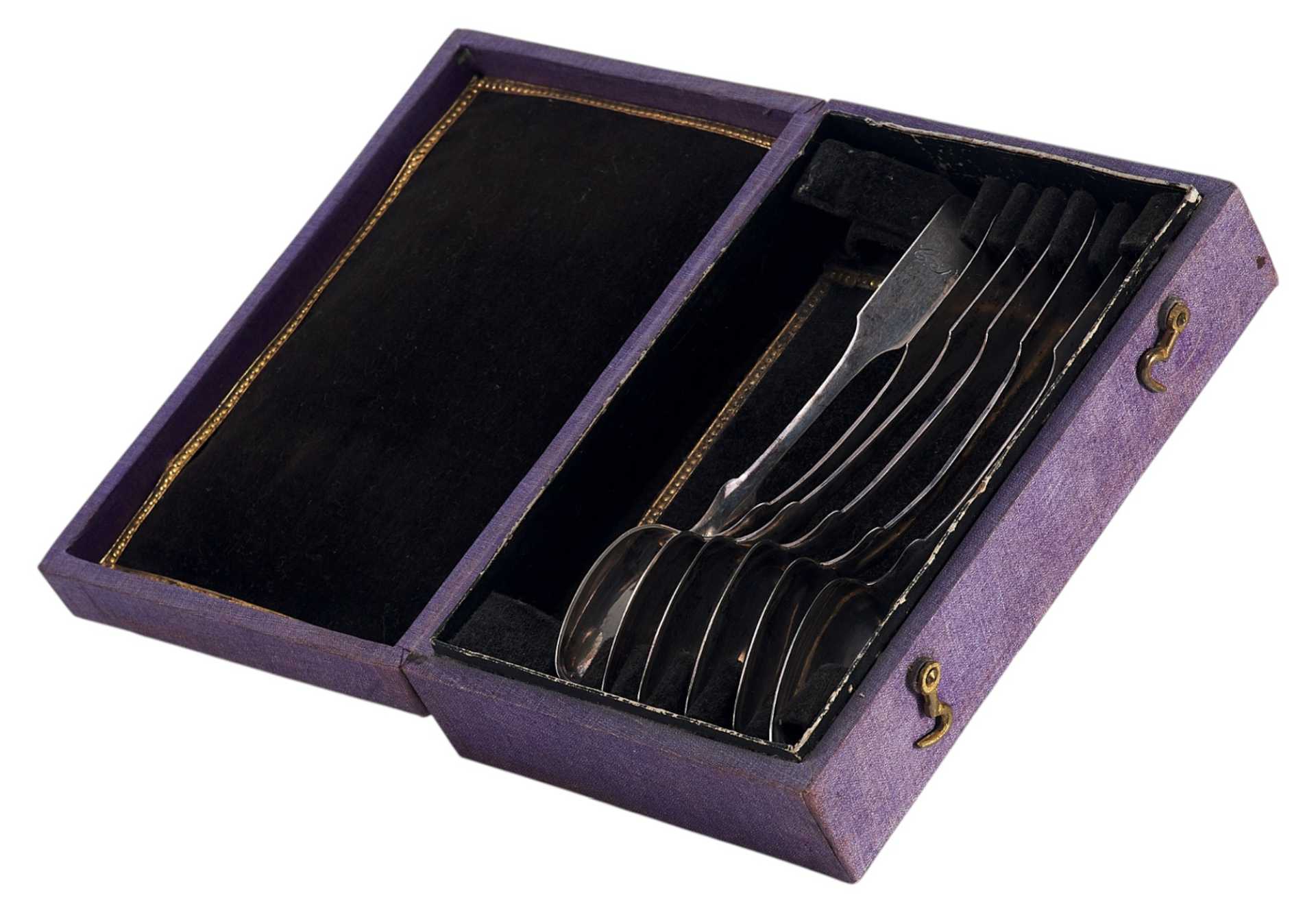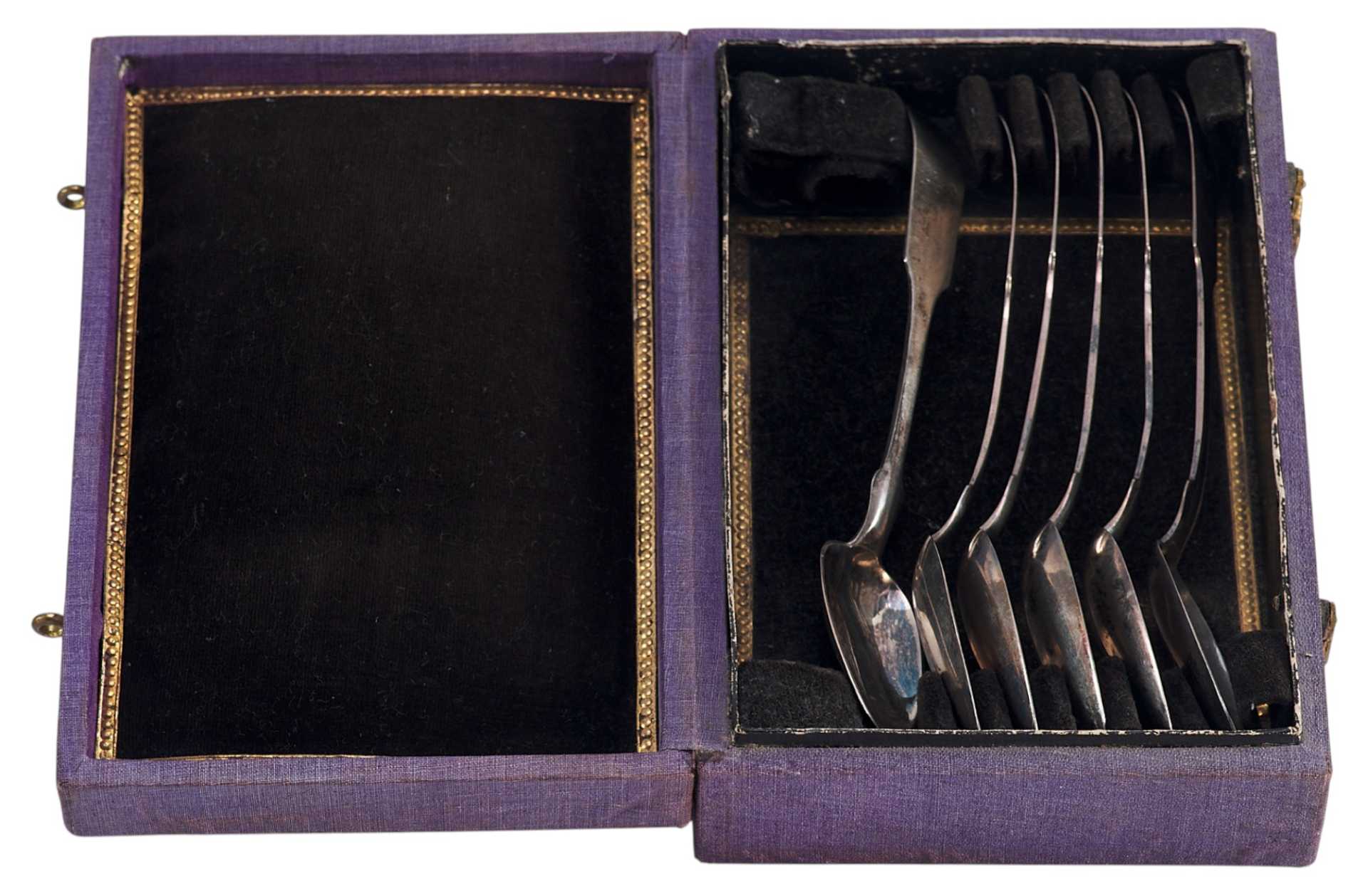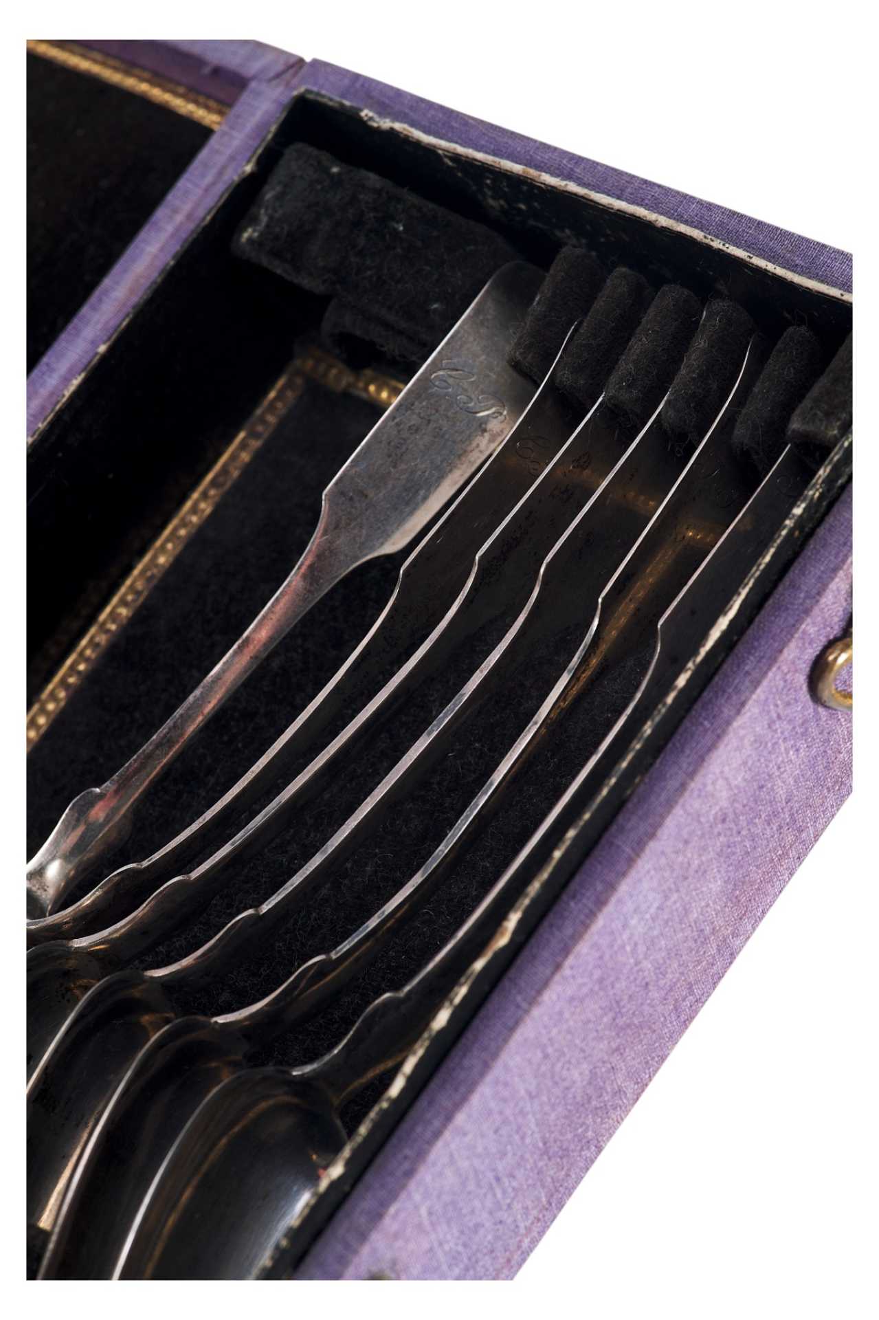 Представлен набор чайных ложек. На футляре дарственная надпись: «Zur Erinnerung (На память) am 26 novb.