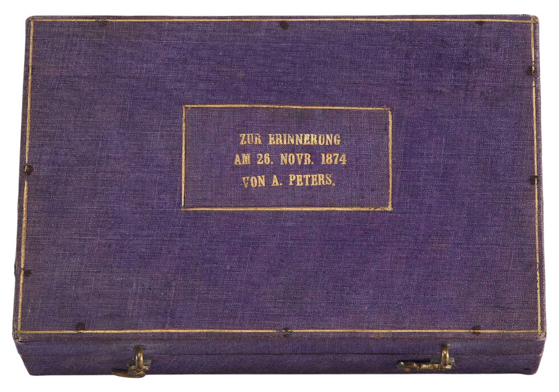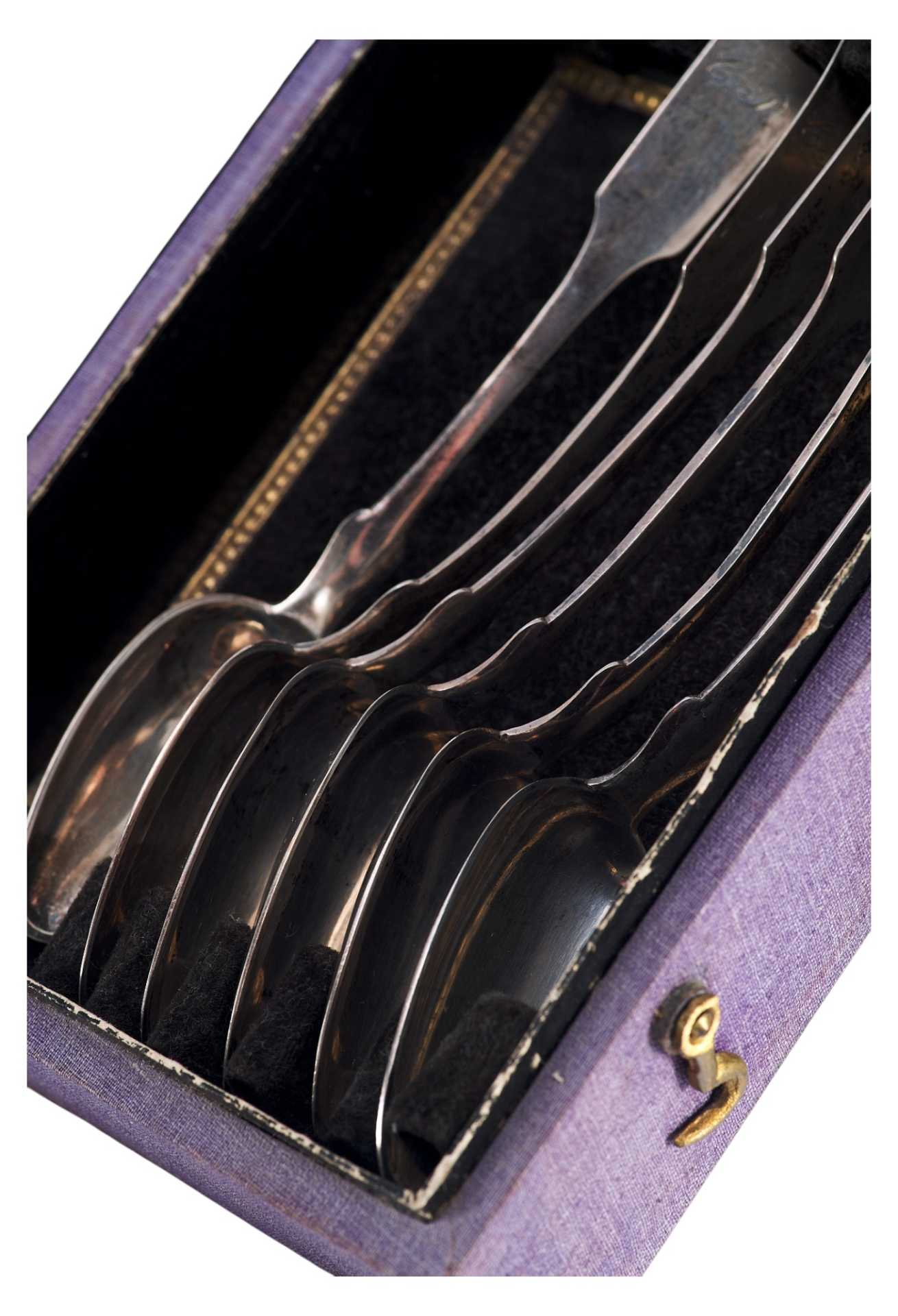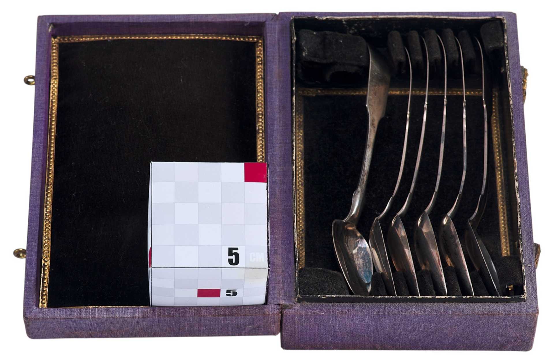Представлен набор чайных ложек. На футляре дарственная надпись: «Zur Erinnerung (На память) am 26 novb.